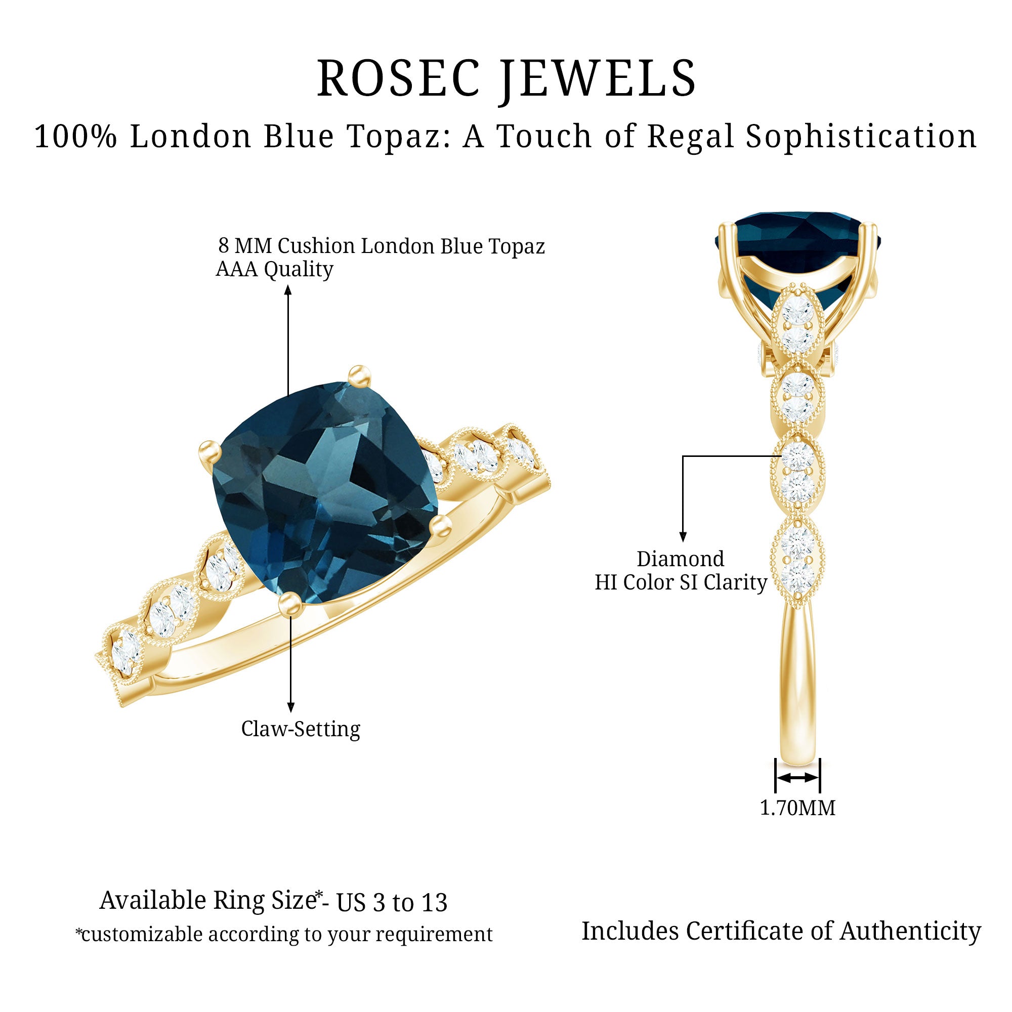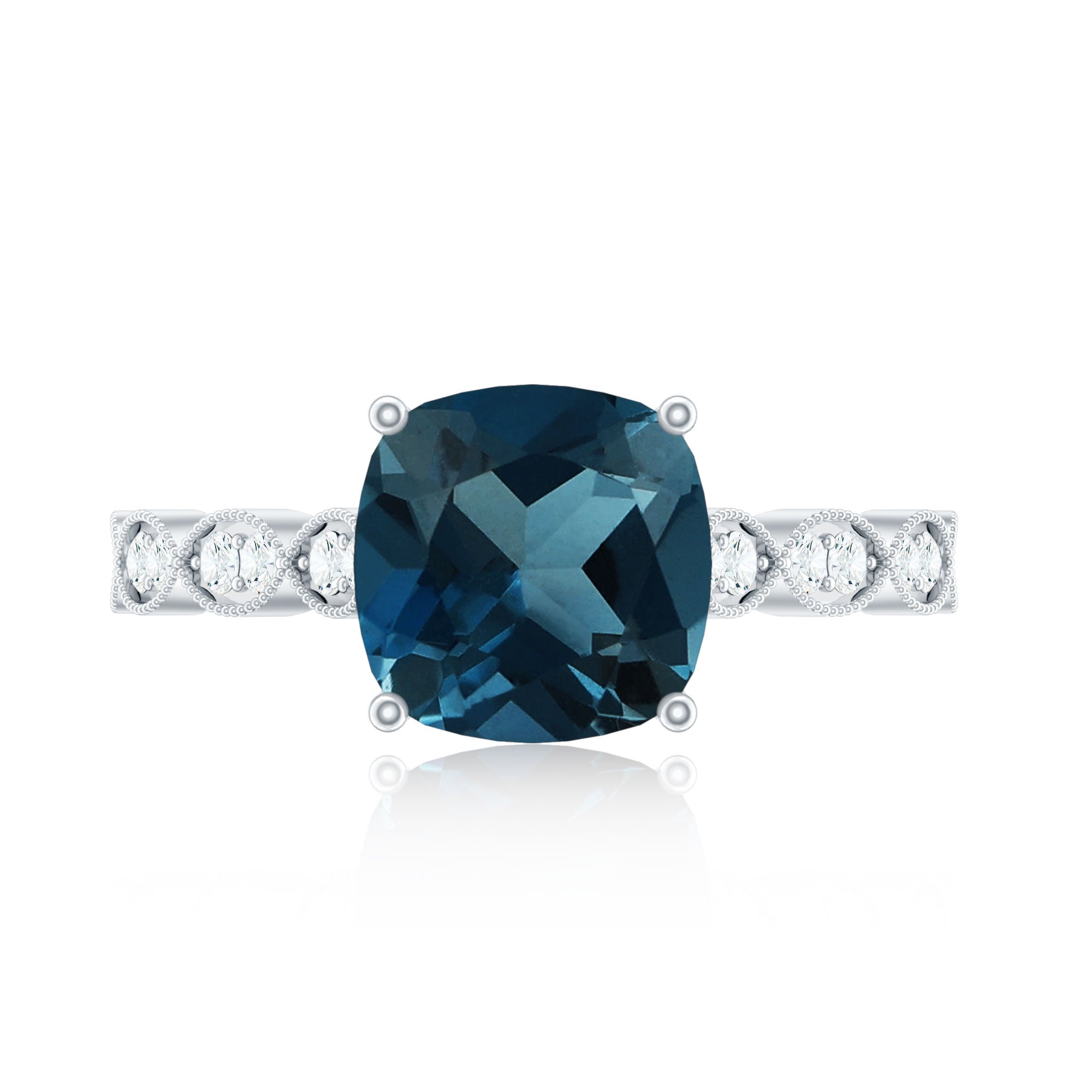 Mark your special moment with a ring that combines classic beauty and thoughtful detail. This elegant London Blue Topaz Engagement Ring is perfect for those who love timeless design with a unique touch. Made with care, it features high quality materials and beautiful craftsmanship. At the center of the Vintage Looking Engagement Ring is an 8 MM cushion cut London Blue Topaz of AAA quality, held securely in basket setting. On each side of the topaz, round HI-SI quality diamonds are placed in a delicate scalloped pattern. Fine milgrain detailing along the edges gives the Solitaire Engagement Ring a vintage inspired look. A special surprise detail adds charm, one small diamond is tucked beneath the center stone in bezel setting, offering a hidden sparkle only you may notice. The cathedral style band gently lifts the center gem, adding height and elegance to the design. This Blue Topaz and Diamond Engagement Ring is a beautiful choice for an engagement, December birthday, or any meaningful occasion where you want to show love and commitment. Made to be comfortable for everyday wear, this Vintage Blue Topaz Ring is a mix of bold color and gentle sparkle, making it a standout piece in any jewelry collection.