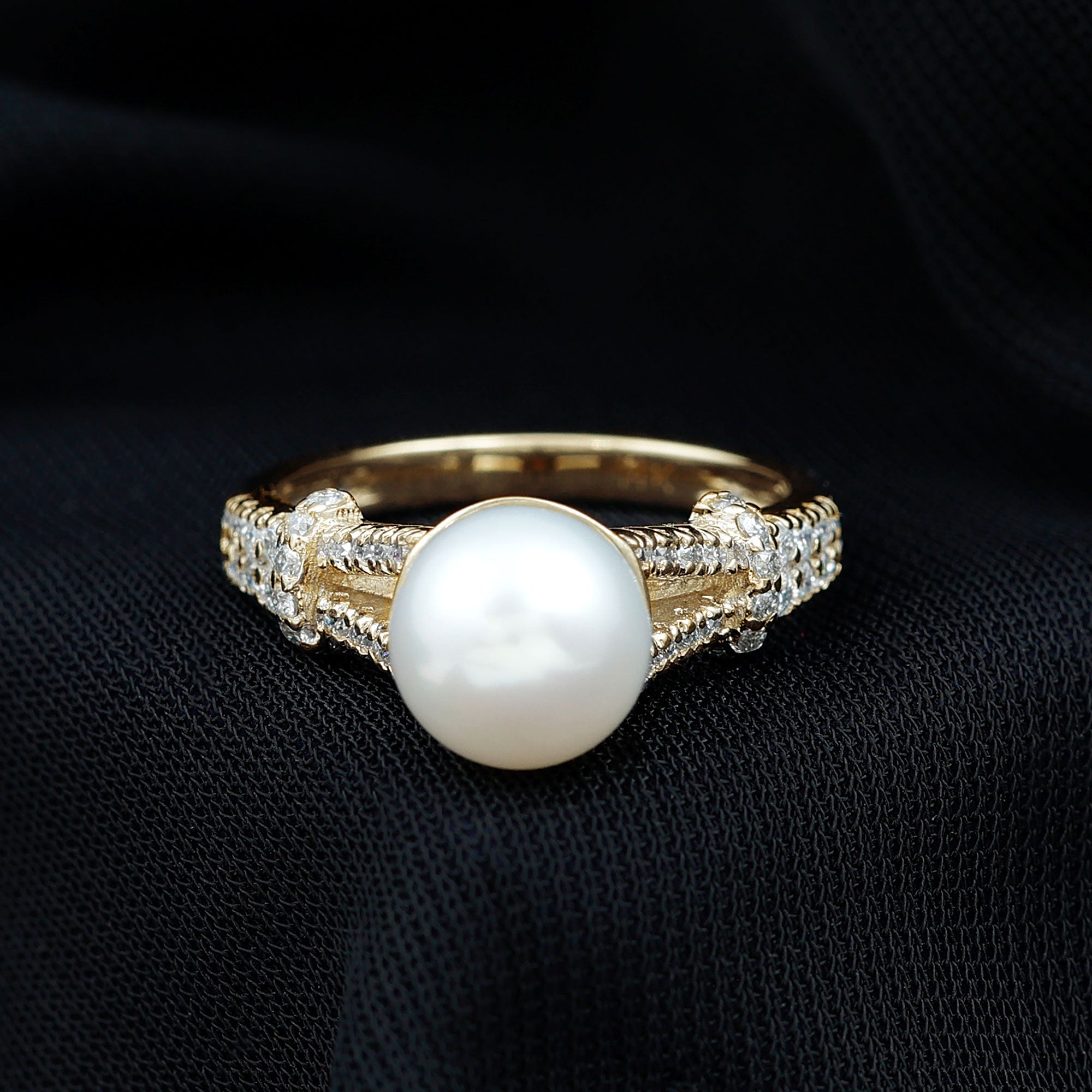 Artistically crafted in Gold, this Split Shank Ring features Round Freshwater Pearl and Moissanite beautifully. This Freshwater Pearl Engagement Ring would be a perfect fit if your partner is a june born. Get this beautiful Freshwater Pearl and Moissanite Engagement Ring for you lady and make her feel elated.