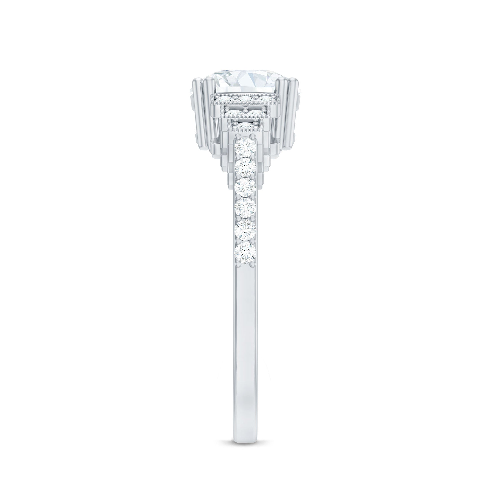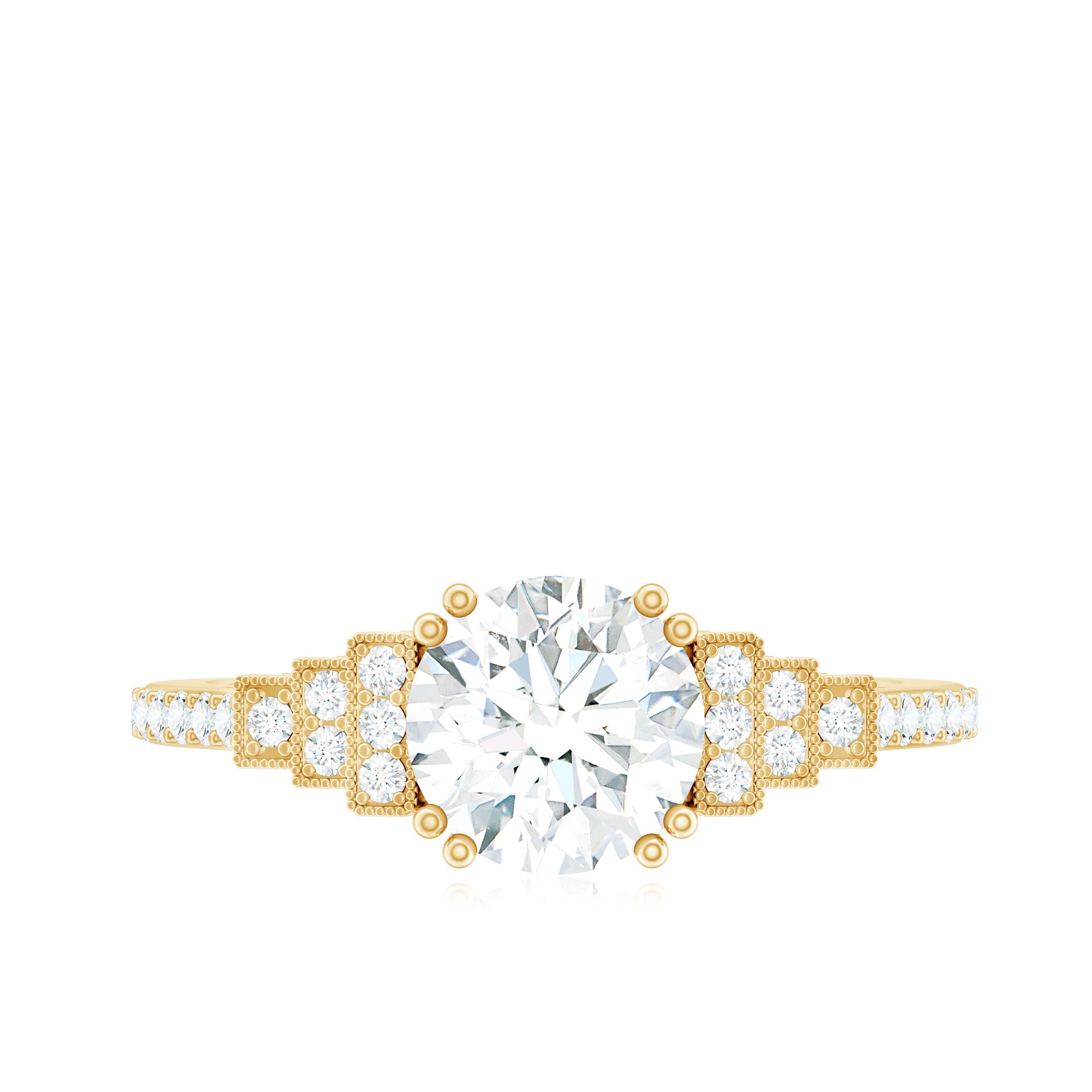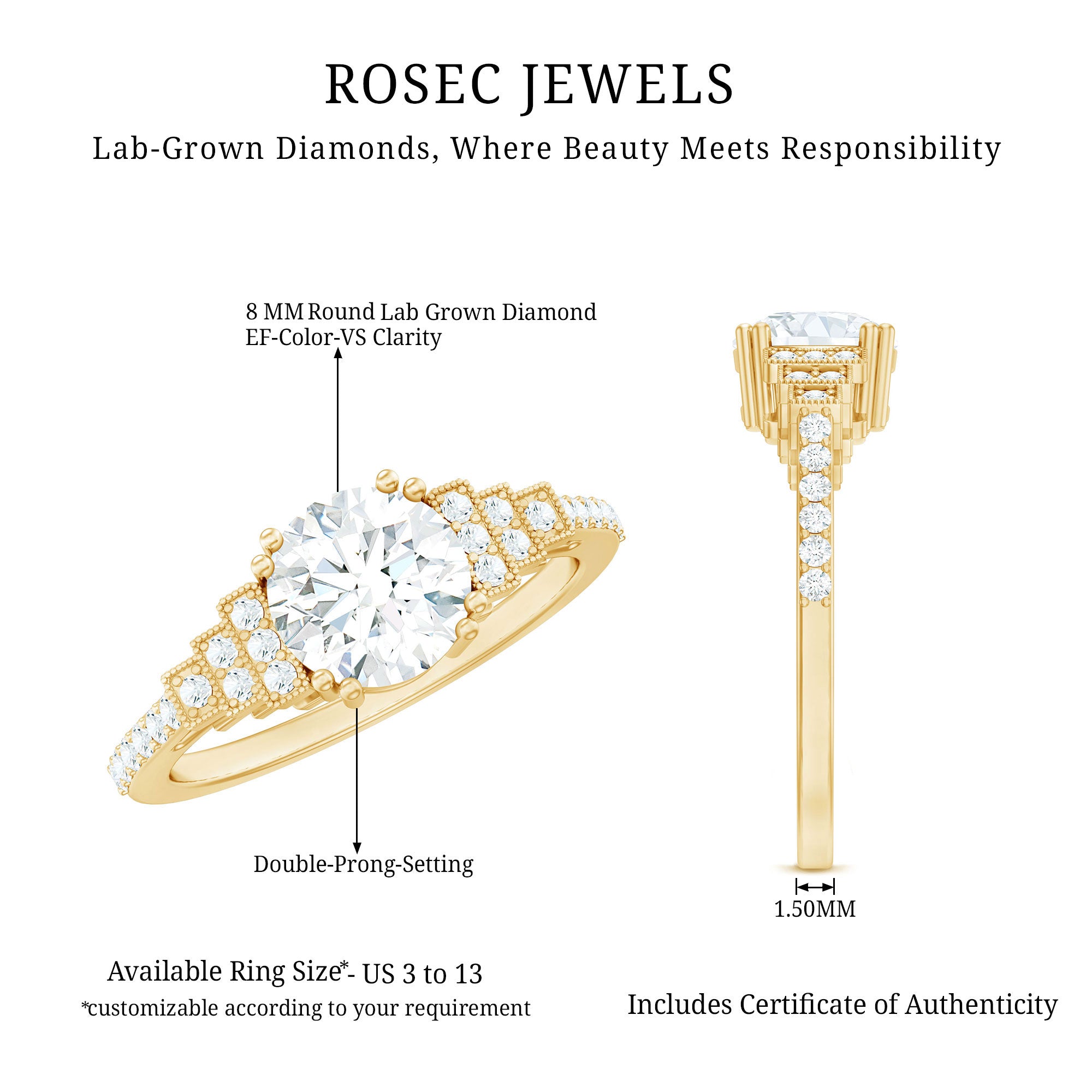Make your special day even more memorable with this stunning Diamond Engagement Ring. This Solitaire Ring showcases an 8 MM round cut synthetic Diamond, beautifully held in double prong setting. The band is embellished with a sequence of round cut diamonds, highlighted by intricate beadwork that gives it a unique step-like design, making the center stone really pop. All the diamonds in this Classic Engagement Ring are lab-grown, and produced in an ethical and eco-friendly way. It's sure to be a beloved addition to her jewelry collection that shell treasure forever.