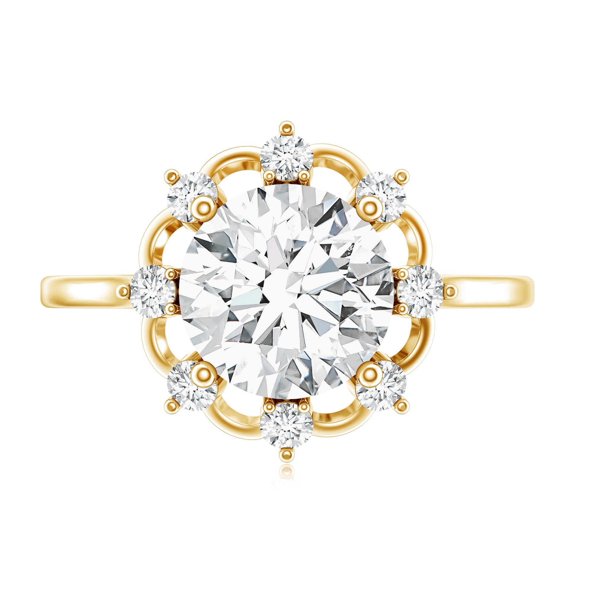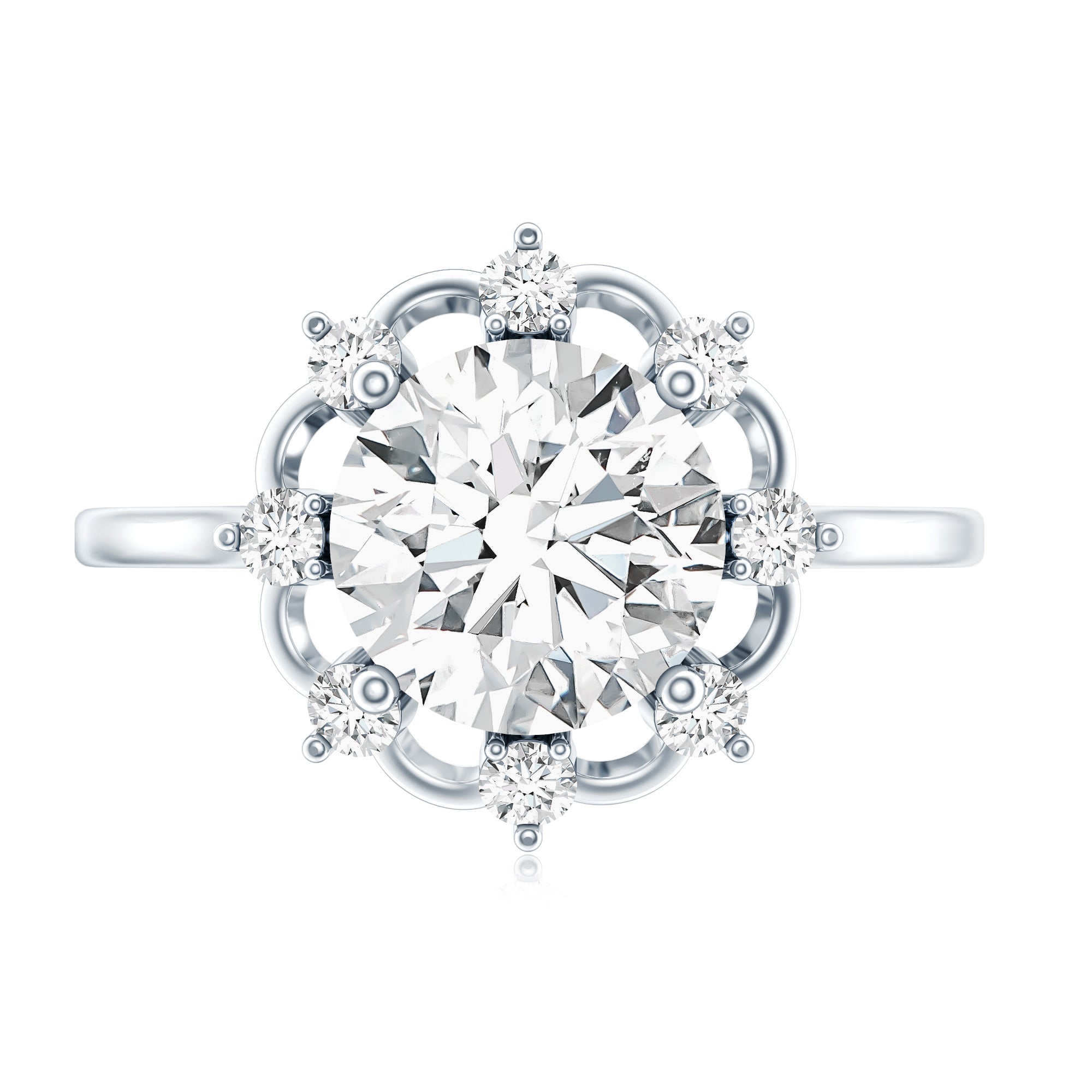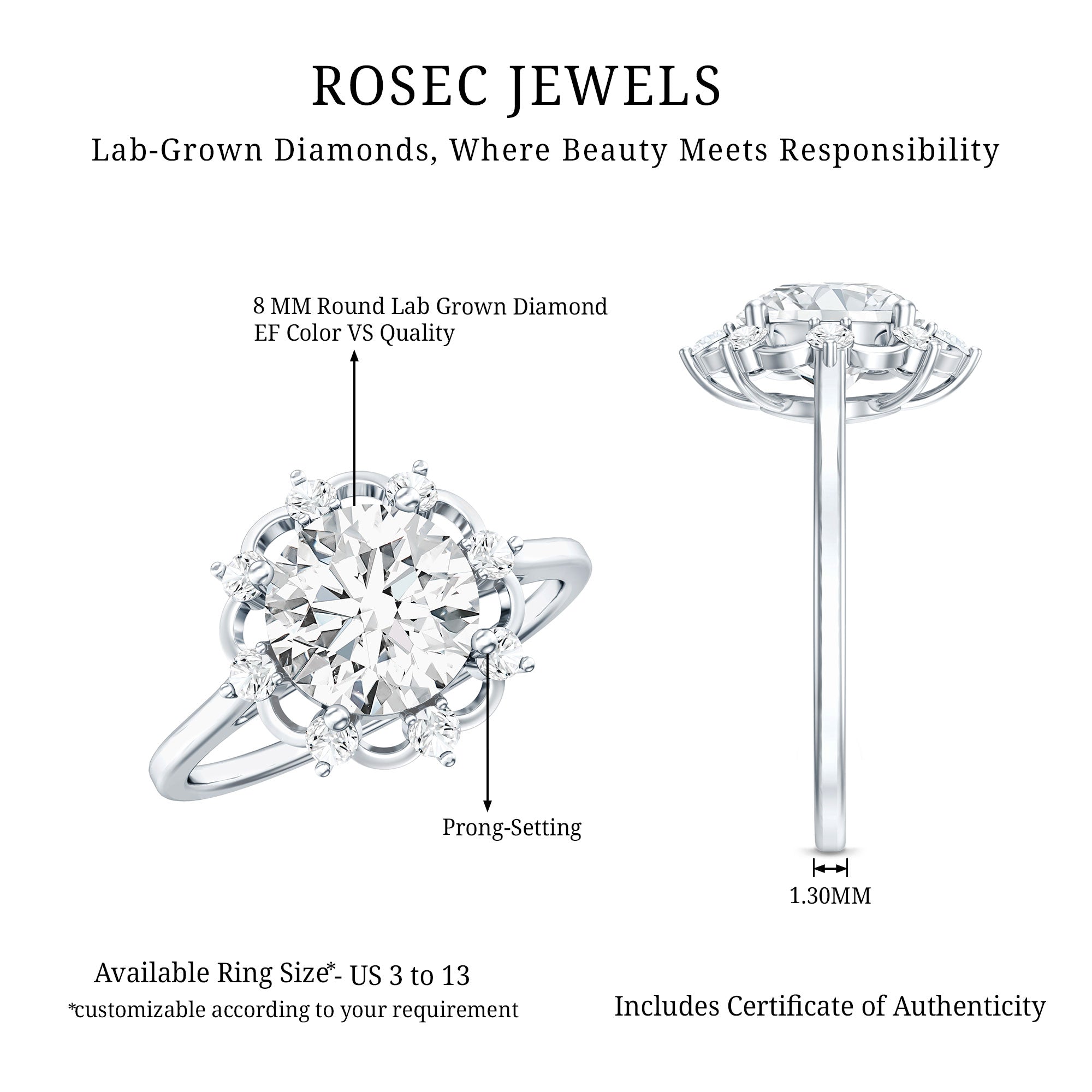 Treat the one you love with this captivating 2 carat Diamond Engagement Ring that is sure to make her heart skip a beat. This Floral Engagement Ring is crafted to enchant, showcasing an 8 MM Round Shape Diamond as the stunning centerpiece in a secure Prong Setting. Surrounding it is a charming Floral Halo embellished with petite, shimmering gemstones that create a breathtaking sparkle. Ideal for those who appreciate Nature Inspired Jewelry, this Lab Grown Diamond Ring is sure to catch everyones eye. Our fine ring comes in the appropriate packaging ensuring they are ready for gifting upon arrival.