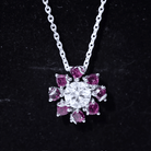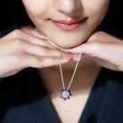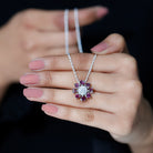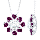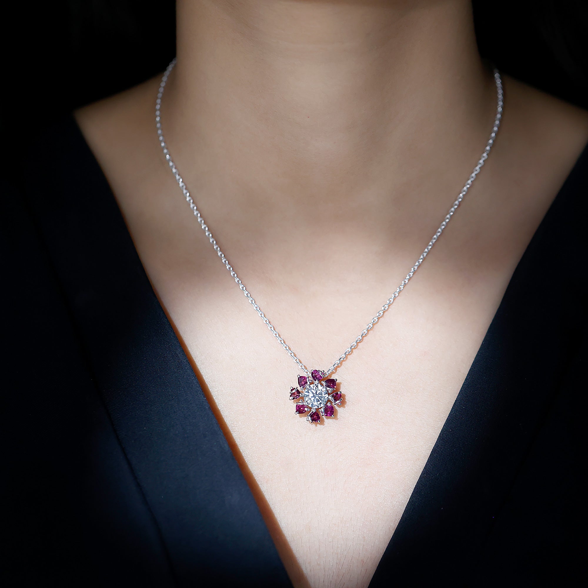 Adorn your neckline with this Moissanite Rhodolite Pendant that exudes a deep red hue with shimmer. The pendant features an 8 MM Round Shape Moissanite and is encircled by Heart Shape Rhodolite embedded in White Gold Plated Silver. This Flower Pendant beholds the classic shine of D-VS1 Quality Moissanite and AAA Quality Rhodolite. The pendant dangles with a cable chain that can be adjusted according to your style and makes it beautifully sit on the neckline. This Designer Necklace will be delivered to you in a velvet pouch with the certificate of authenticity.