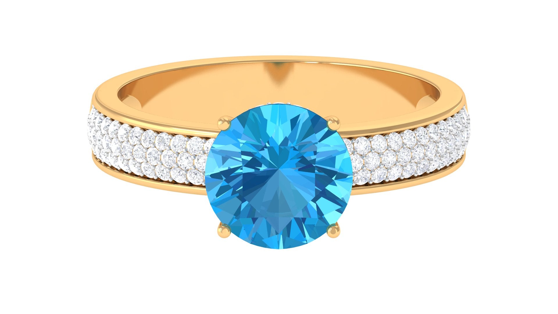 Confess your enduring love in front of her with this Blue Topaz Solitaire Ring and make her fall in love with you. An ideal choice for your lady love, this Fine Ring features an 8 MM Round Shape Swiss Blue Topaz gemstone set in Prong Setting with sparkling Moissanite Hidden Halo and Side Stones. A symbol of promise and passion, this Swiss Blue Topaz Ring is sure to impress.