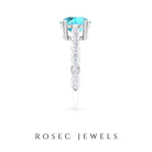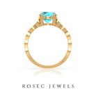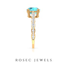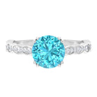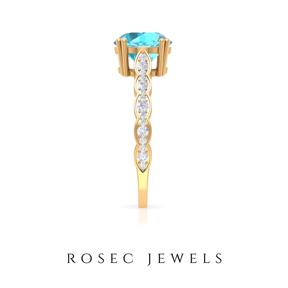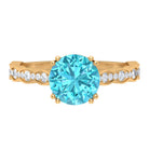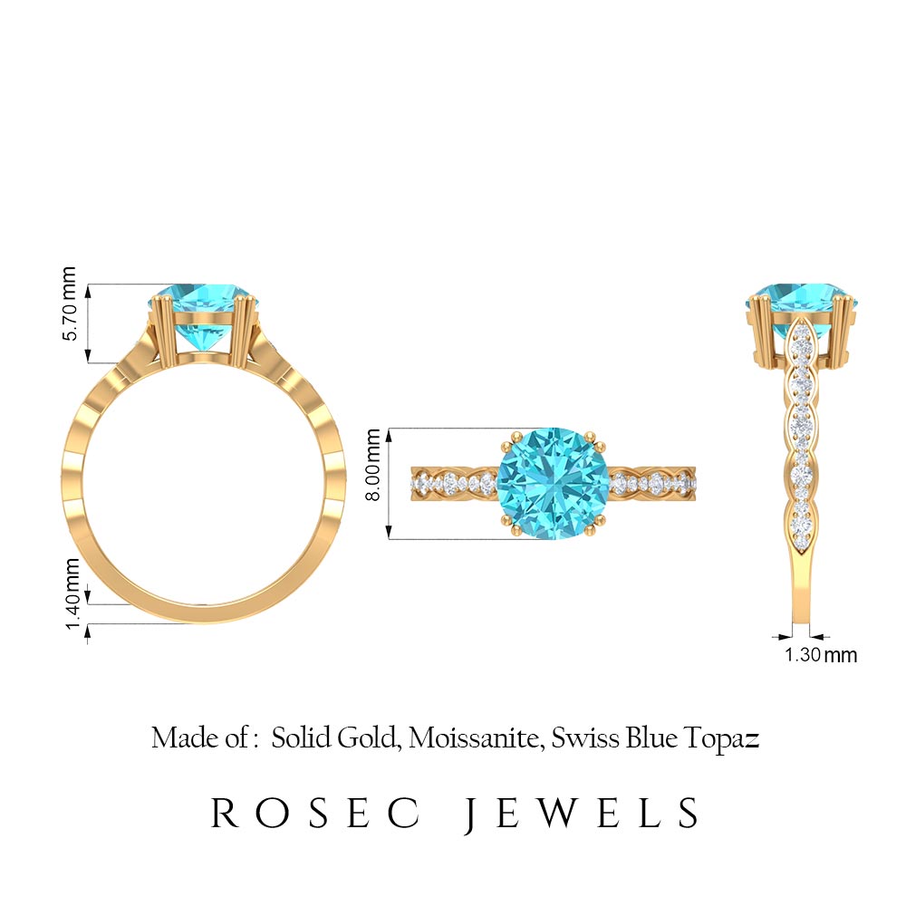 Flaunt this stunning Solitaire Ring adorned with a gorgeous 8 MM Round Shape Swiss Blue Topaz set in Double Prong Setting while Round Shape Diamond accompany it as side stones. The Swiss Blue Topaz Ring is crafted in Solid Gold to make for an opulent choice for your big day.