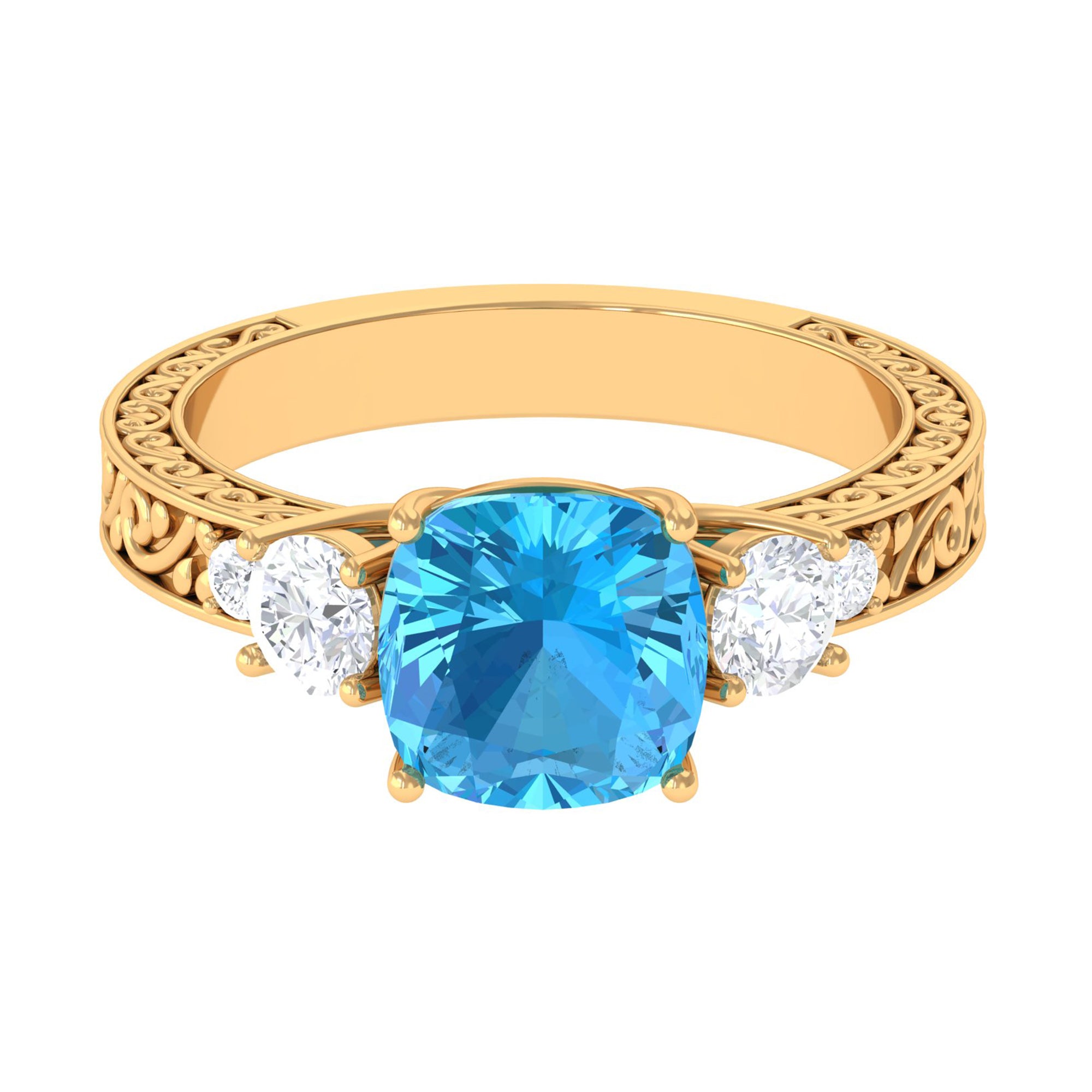It is a Vintage Three Stone Ring for Women, set in Gold and features a Cushion Cut Swiss Blue Topaz embellished in Prong Setting with Round Brilliant Moissanite embellished in Prong Setting.