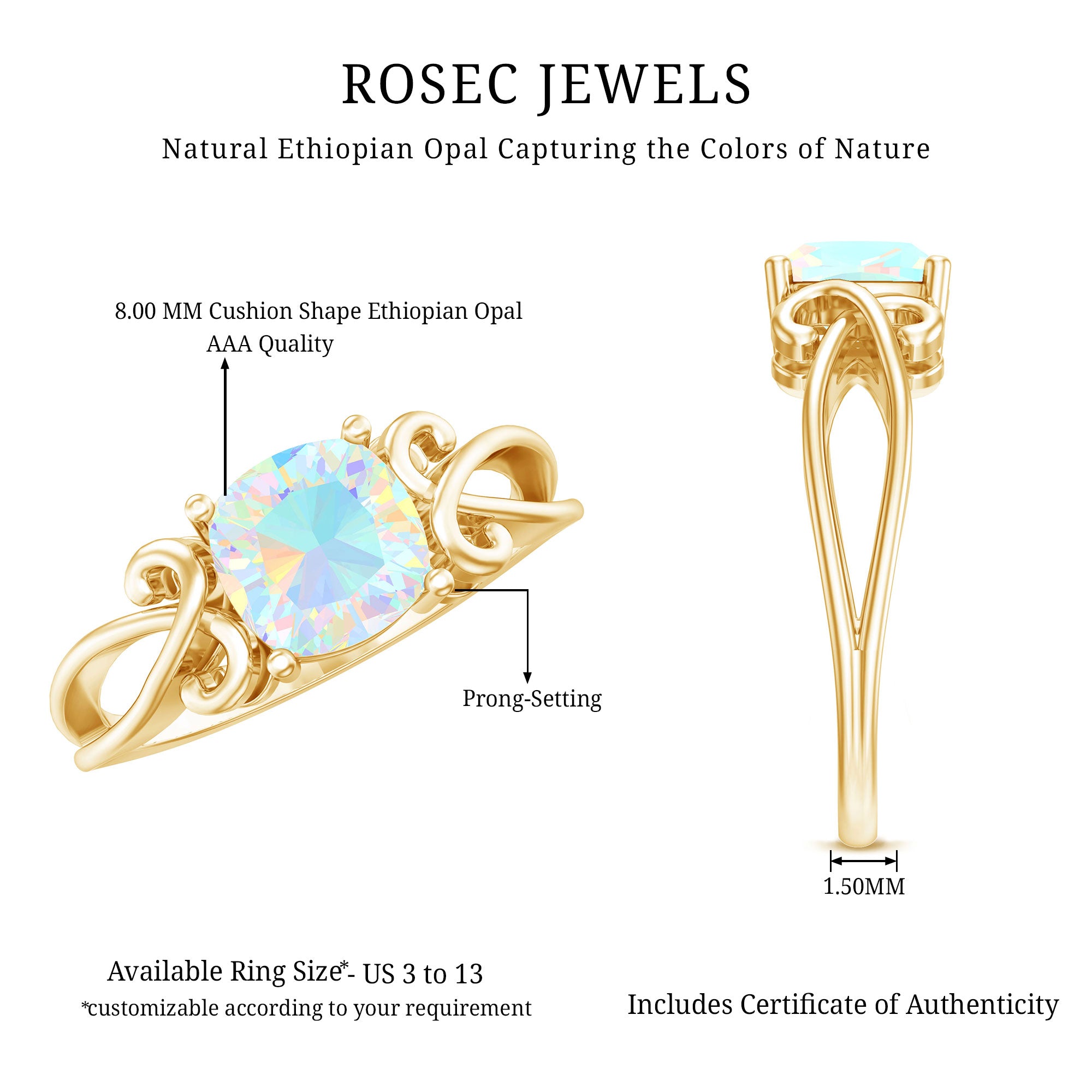 Ready to fall in love with something truly magical? This vintage Engagement Ring gives all the old-school charm with a modern twist. It is designed to totally steal the show, and your heart - with a cushion cut Ethiopian Opal sitting pretty right at the center, held securely in prong setting. The shank has split style with curved metal give it a vintage look. What really sets this Antique Engagement Ring apart is its vintage art deco vibe - it is timeless, elegant, and seriously eye-catching. Whether you are proposing, upgrading your ring, or just treating yourself (you deserve it), this piece adds a bold, romantic touch to any look. And hey, you can totally make it your own – this Vintage Inspired Ring is available in different metal colors and purity options, so you can pick the one that feels just right for your style. Basically, it is not just a ring - it is a whole vibe. Classic, classy, and full of sparkle.
