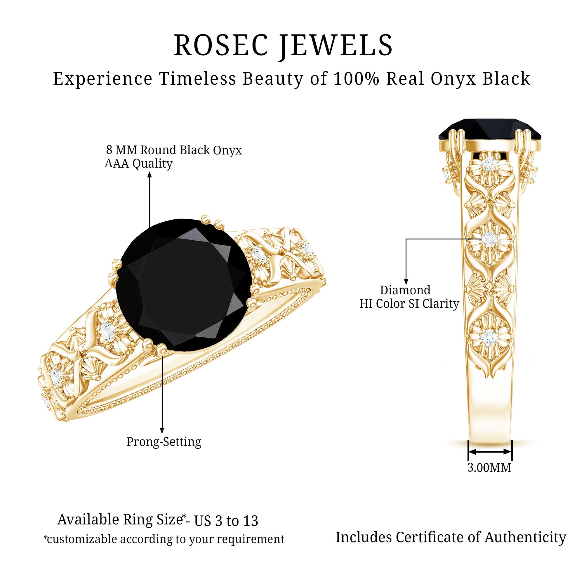 Experience the elegance of a past era with this Vintage Engagement Ring. This remarkable piece showcases a breathtaking 8 mm round Black Onyx positioned at the center within a double prong setting, complemented by an antique-style shank adorned with intricate engravings and small round diamonds, resulting in a mesmerizing display of brilliance. The Antique Looking Engagement Ring radiates timeless appeal, featuring AAA quality Black Onyx alongside HI color SI clarity Diamonds. Ideal for those who value distinctive and elegant jewelry, this Black Onyx Engagement Ring represents a hallmark of sophisticated style and grace. Enhance your appearance with this Vintage Inspired Ring, merging nostalgia with contemporary charm in a luminous expression of individuality. This Black Onyx and Diamond Ring represents an excellent choice for individuals who appreciate understated jewelry with a touch of uniqueness. Offered in various metal options and ring sizes, it can be tailored to match your individual preferences. Whether worn casually or for a formal event, this Round Engagement Ring is destined to become a cherished accessory. Ideal for self-indulgence or as a gift for a loved one, it combines timeless elegance with understated charm in a single sophisticated piece.