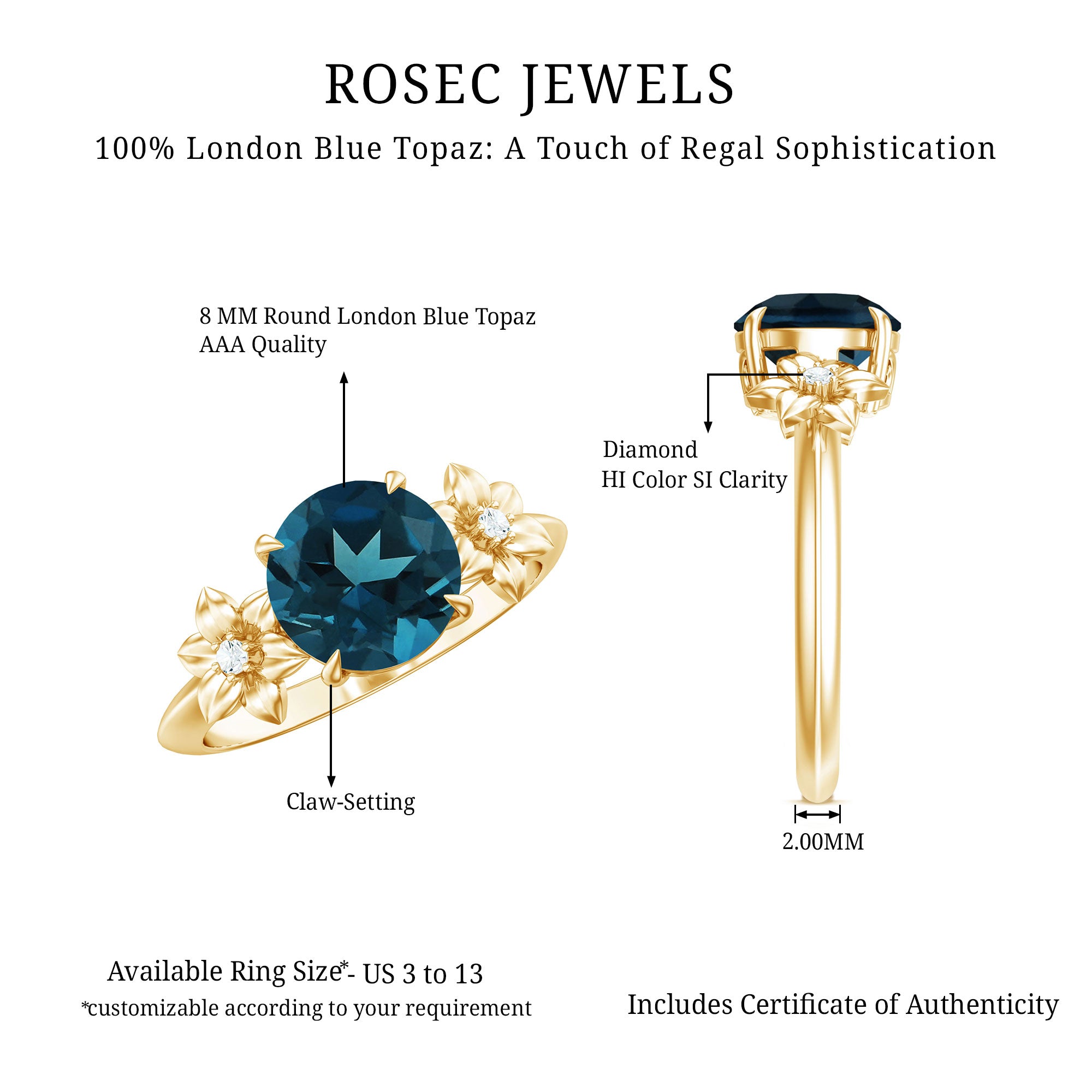 Much like love that flourishes over time, this Blue Topaz Flower Ring serves as a graceful reminder of growth, beauty, and connection. At the heart of the Floral Engagement Ring lies a stunning 8 MM round shape London Blue Topaz of AAA quality, securely held in a claw setting. What distinguishes this London Blue Topaz Engagement Ring is the elaborate floral design that gracefully extends along the band. Each flower is meticulously crafted and adorned with small round cut diamonds that emit a gentle sparkle with every movement. These delicate HI-SI quality diamonds add a subtle shimmer to the Nature Inspired Engagement Ring. This Blue Topaz and Diamond Ring is an excellent choice for anyone who appreciates jewelry that narrates a story. It encircles the finger like a blossoming garden, symbolizing a love that continues to grow stronger with time. Thoughtfully designed for both elegance and comfort, it is available in US ring sizes ranging from 3 to 13. It arrives ready for gifting in a beautiful jewelry box, making it perfect for special occasions such as Valentines Day, a birthday, or simply as a reminder of love.