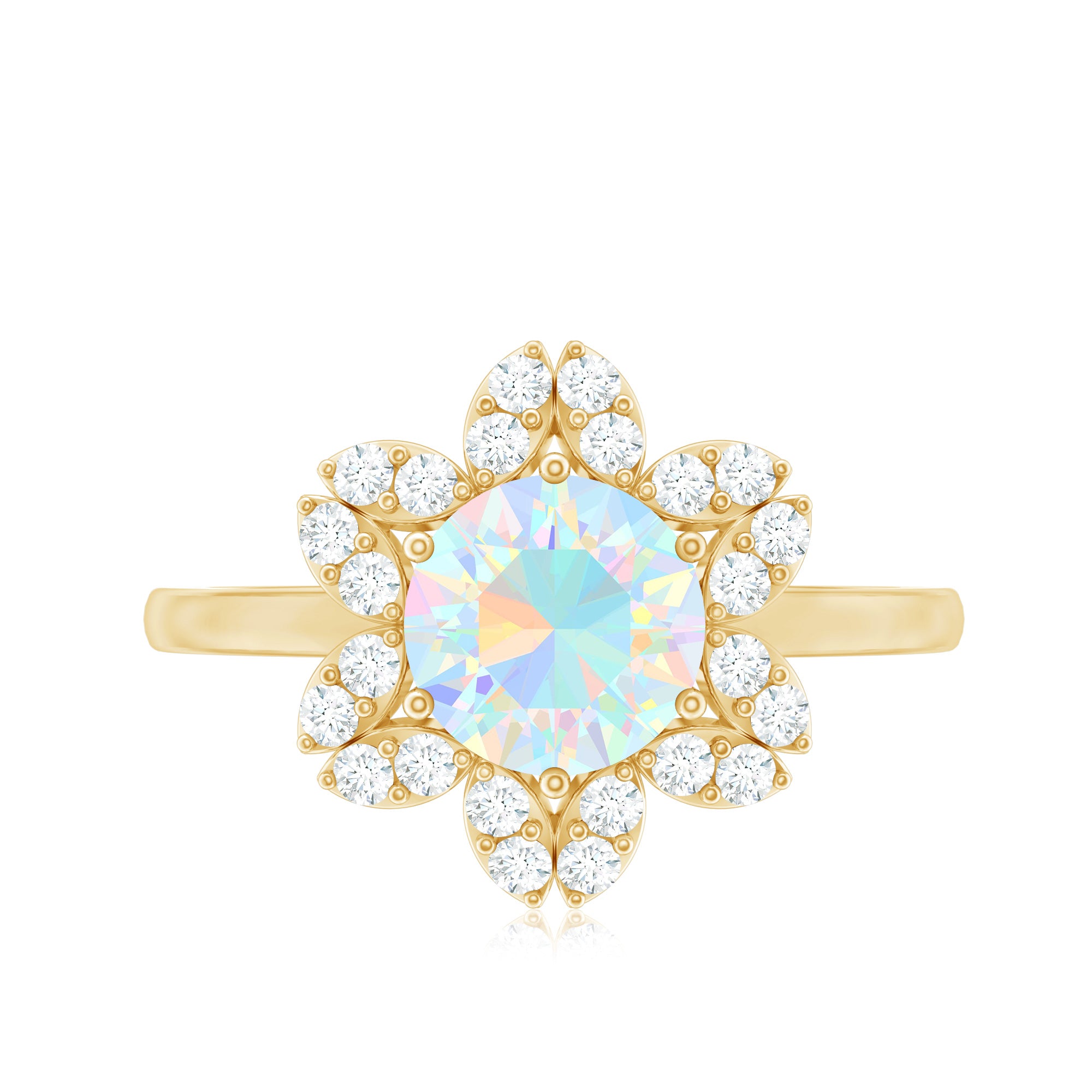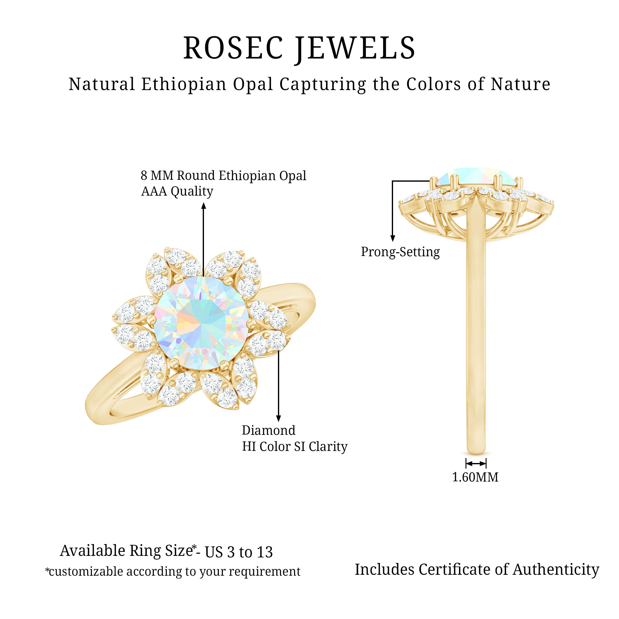 This exquisite Floral Engagement Ring is meticulously handcrafted for the modern woman who cherishes both uniqueness and sophistication. At the heart of this stunning piece lies a 8mm Round shape Ethiopian Opal (2 carat), known for its mesmerizing fire and color play. The floral style is designed to maximize light reflection, giving the gemstone an extra sparkle that symbolizes everlasting love. This Ethiopian Opal Engagement Ring is a timeless classic, serving as the ideal finishing touch for any ensemble. With its distinctive color palette, the AAA Quality Ethiopian Opal possesses an enduring charm due to its unique hue. This Opal and Diamond Ring brings a sense of nostalgia to modern designs, making it a striking option for anyone wishing to stand out. The opals iridescent shades, combined with its mesmerizing patterns and vibrant colors, create a breathtaking contrast that is sure to attract attention. This Opal Floral Ring highlighting the intricate craftsmanship, it reflects the artistry of past generations. As opals are the birthstone for October, they make a beautiful gift for loved ones.