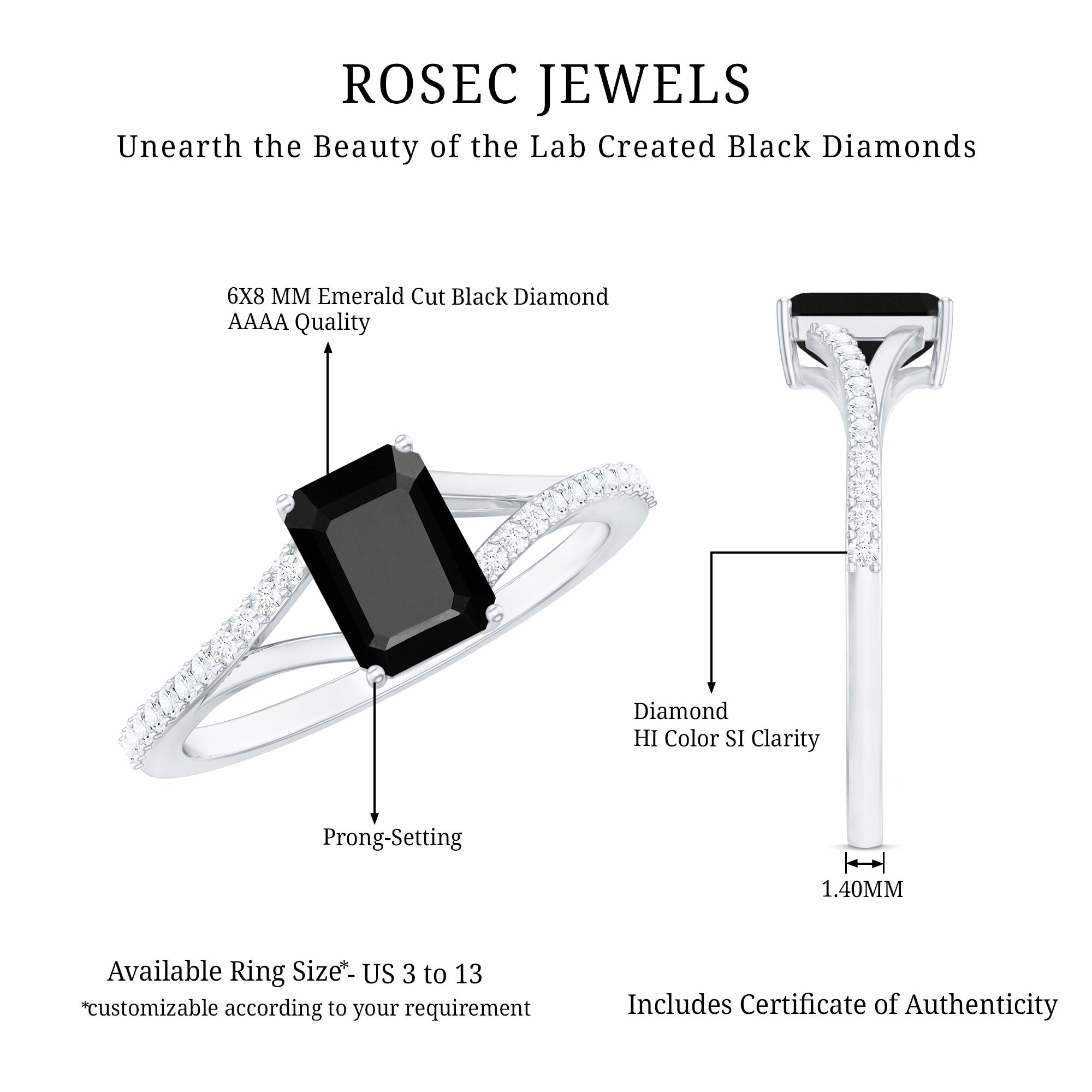Make a statement with this Lab Grown Black Diamond Ring that combines elegance and boldness like no other. Featuring a 8X10 MM emerald cut lab created black diamond at its center, this Statement Ring is designed to catch every eye. The lab created black diamond offers a eco-friendly alternative that shines with a deep and mysterious beauty. The secure prong setting keeps the stone safe while allowing its unique color to stand out. The band splits gracefully, adding a modern touch to the design, while intricate vintage inspired details beneath the stone give it a romantic and timeless feel. Available in a variety of metal colors, this Emerald Cut Engagement Ring can be customized to fit your personal style perfectly. More than just an engagement ring, this Black Diamond Solitaire Ring is versatile enough to wear as a striking accessory to any special event. It is a perfect gift for birthdays, anniversaries, or Valentine’s Day, and even works as a standout piece for Halloween or other themed occasions. Large, elegant, and unforgettable, this ring is ideal for anyone who wants to express their individuality with a touch of glamour and sophistication.