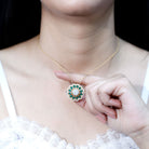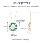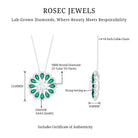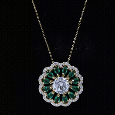 Elevate your jewelry collection with the exquisite charm of this Diamond Floral Pendant. At its heart lies a breathtaking 9 MM round cut synthetic diamond set in prong setting and graces the design with its remarkable sparkle. Encircling this central gem are pear-shaped lab-created emeralds that bring a vibrant splash of color. The Statement Pendant is beautifully framed by a diamond halo, enhancing its overall allure. This Diamond Pendant Necklace is not only fashionable but also ethically crafted. Adorn yourself with this Halo Pendant to enhance your outfit and express your refined taste.