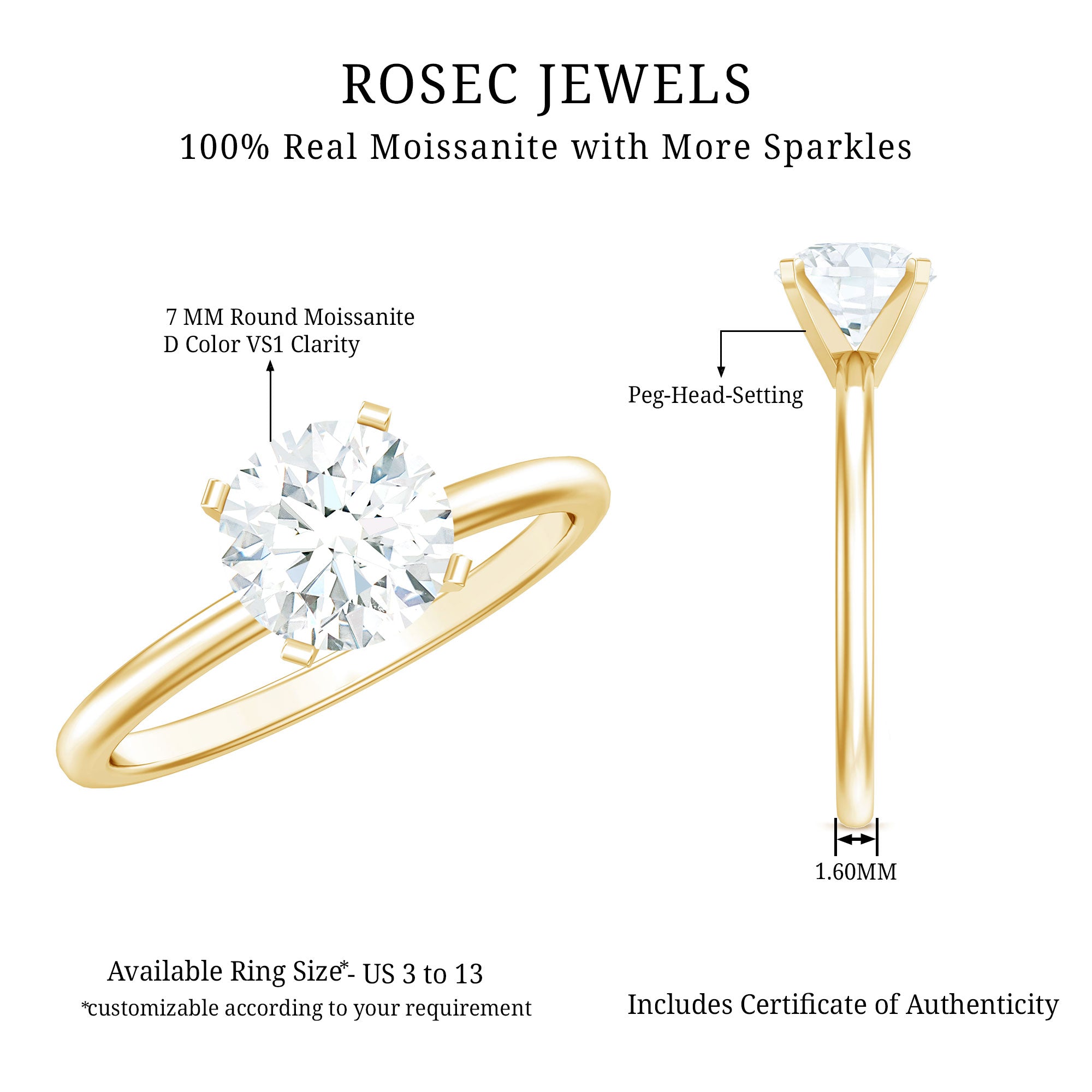 Simply elegant, this Round Moissanite Engagement Ring is the perfect way to honor your love story. At the center of this beautiful Solitaire Ring is a 7 MM round moissanite, set in peg head setting that lifts the stone to catch the light from every angle. With its brilliant sparkle, the solitaire design never goes out of style. This Round Engagement Ring is a great choice for anyone who loves timeless beauty with a modern twist. The moissanite offers incredible shine and clarity, similar to a diamond but with a more affordable and ethical appeal. Designed for comfort and everyday elegance, the sleek band feels smooth on the finger and pairs beautifully with other rings if you would like to stack or add a wedding band later. It is available in US sizes 3 to 13, so you can find the perfect fit. Every detail of this 1 Carat Moissanite Ring is carefully crafted, from the sparkle to the secure setting that keeps it in place. It comes in a signature jewelry box, making it ready to gift for an unforgettable moment. For anyone who appreciates classic style with meaningful beauty, this Moissanite Solitaire Engagement Ring is a thoughtful and stunning choice.
