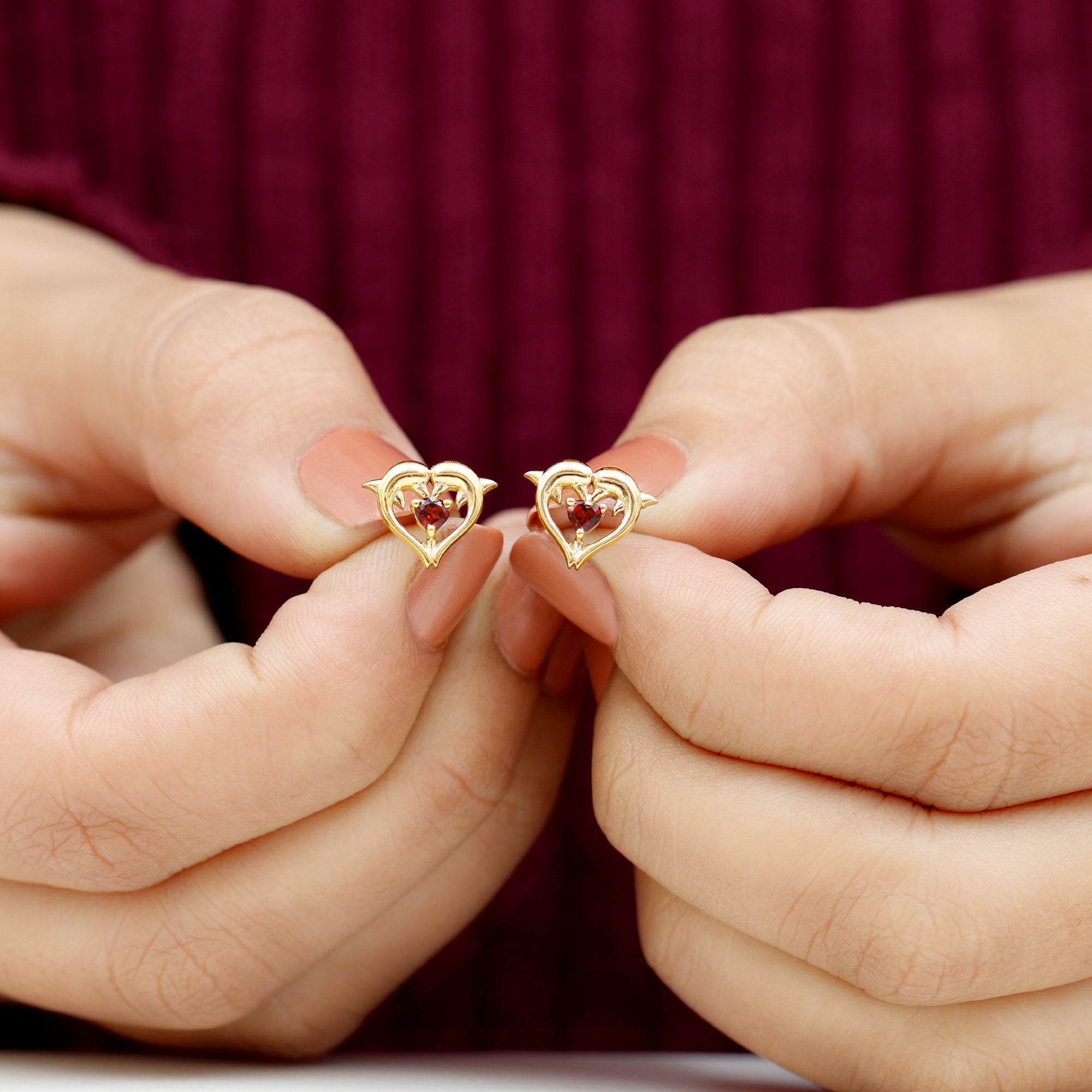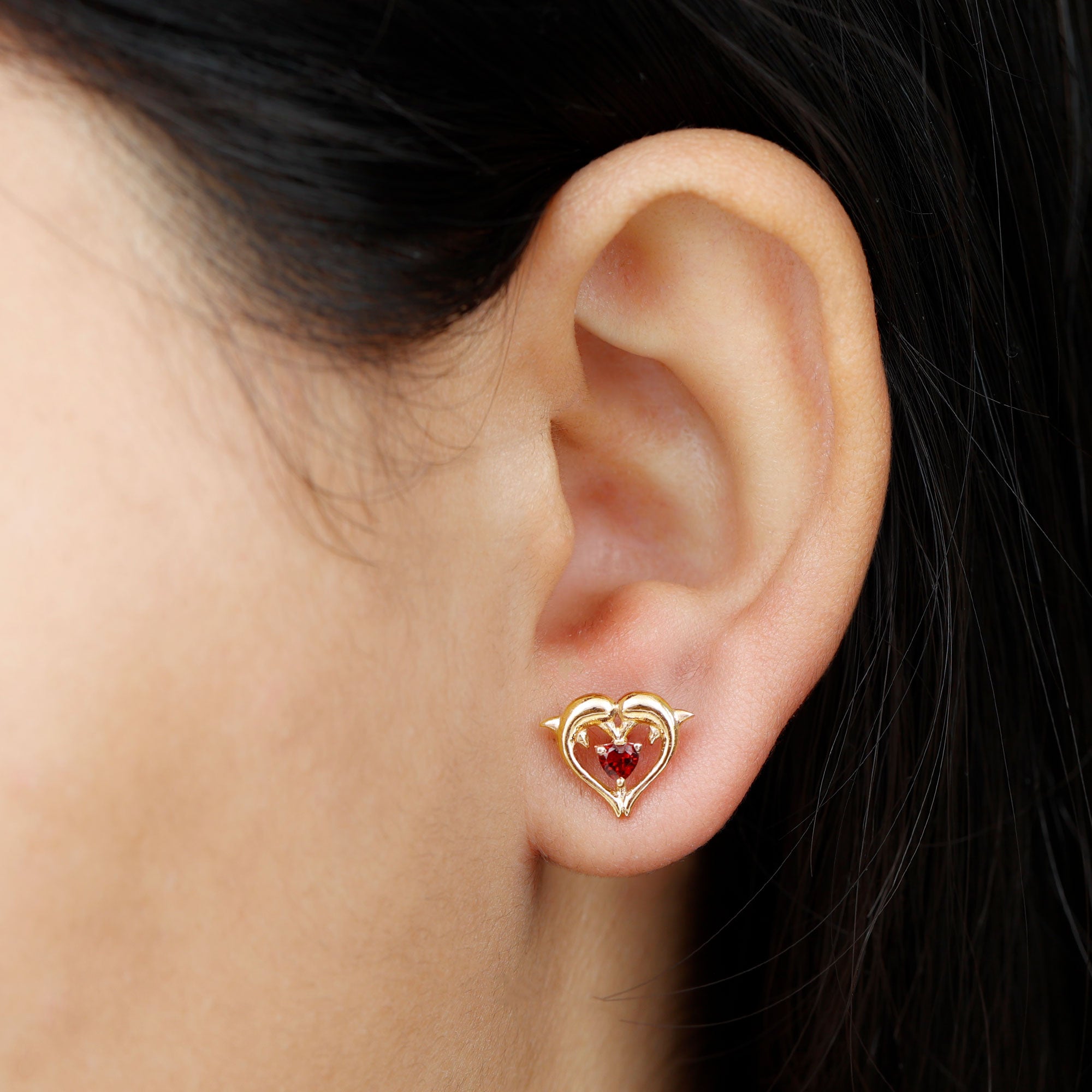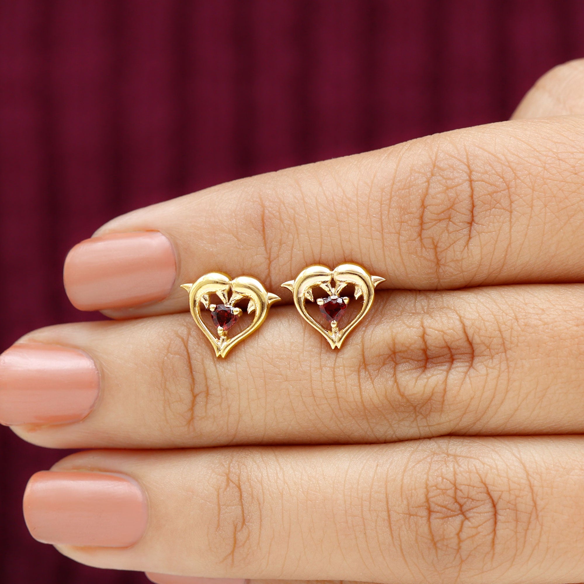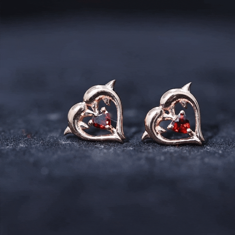 These Dolphin Heart Stud Earrings are a true treasure for all the animal lovers out there! Speaking aloud of your love for this queen of the sea, 4 MM Heart Shape Garnet sits pretty at the center secured by 3 Prong Setting. Two metal-crafted dolphins come together to surround the centerpiece, effortlessly enclosing the design in a Heart Shape. These Certified Dolphin Heart Earrings are secured by a Screw Back Closure to allow for an effortless and snug fit against the earlobe.