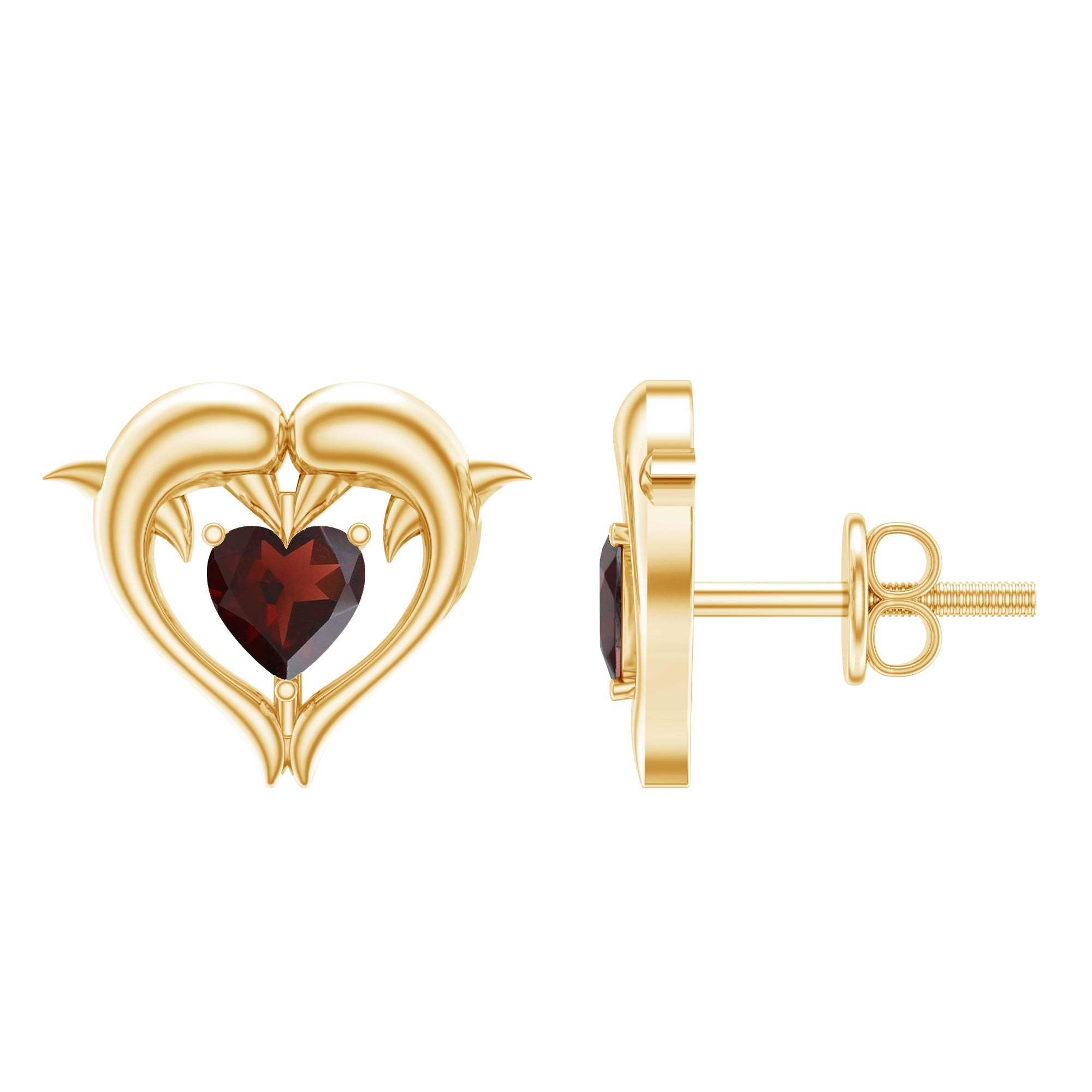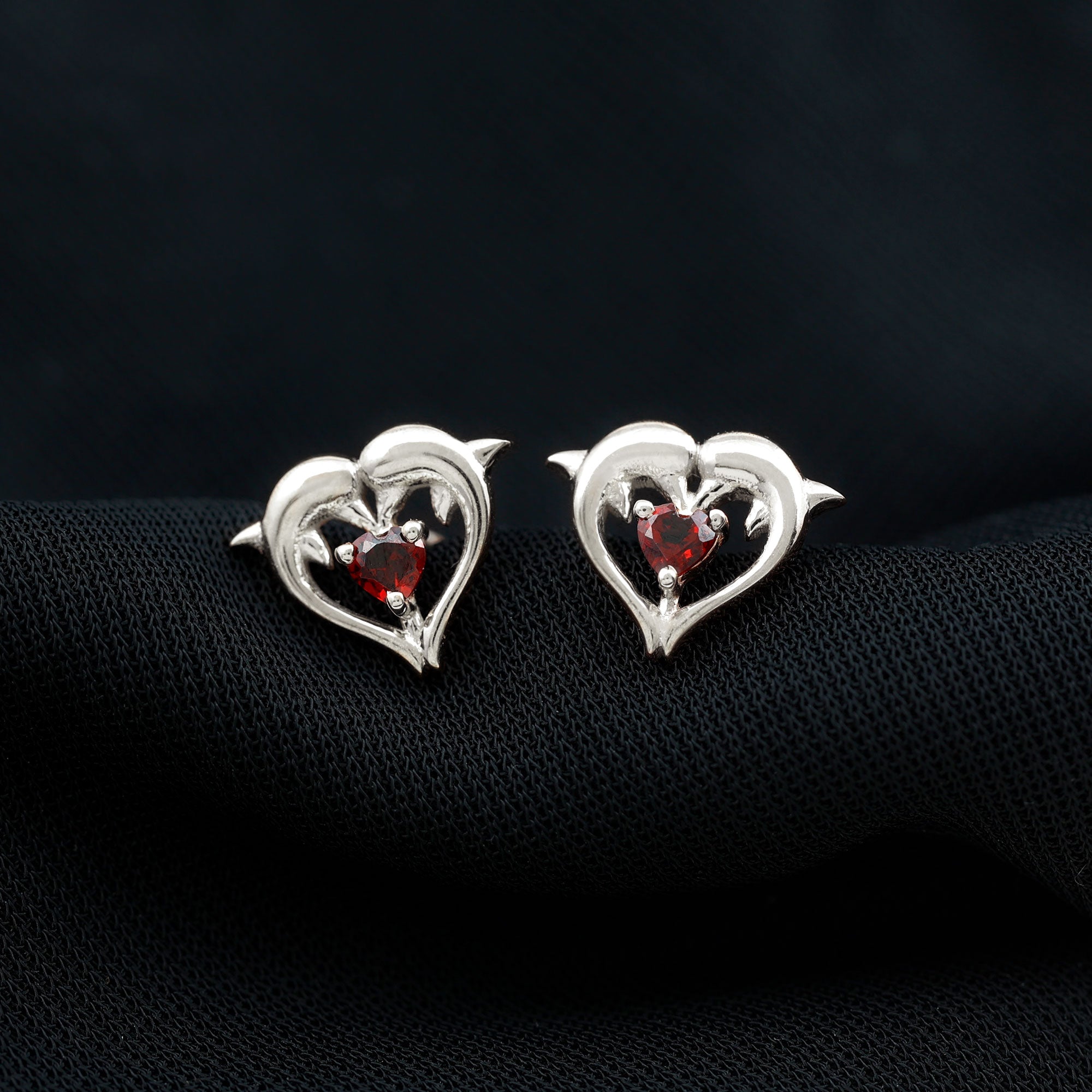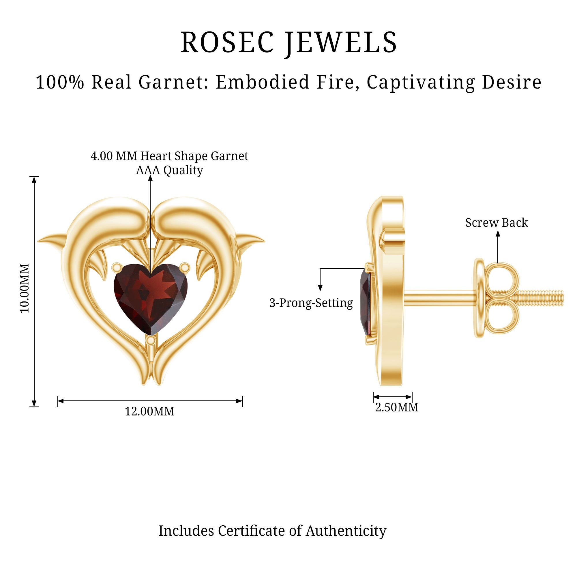 These Dolphin Heart Stud Earrings are a true treasure for all the animal lovers out there! Speaking aloud of your love for this queen of the sea, 4 MM Heart Shape Garnet sits pretty at the center secured by 3 Prong Setting. Two metal-crafted dolphins come together to surround the centerpiece, effortlessly enclosing the design in a Heart Shape. These Certified Dolphin Heart Earrings are secured by a Screw Back Closure to allow for an effortless and snug fit against the earlobe.