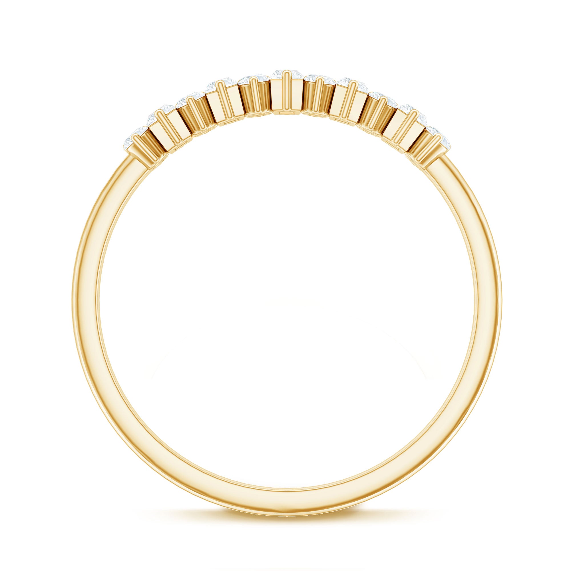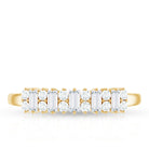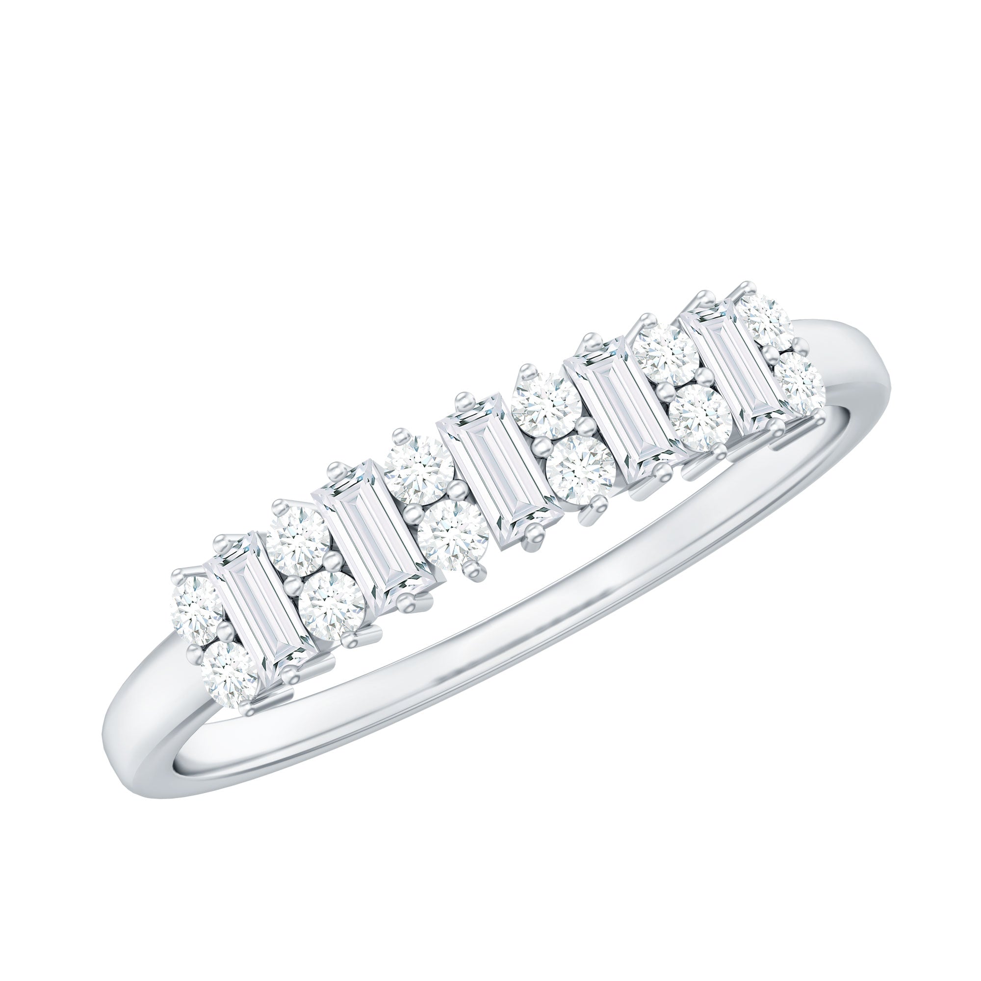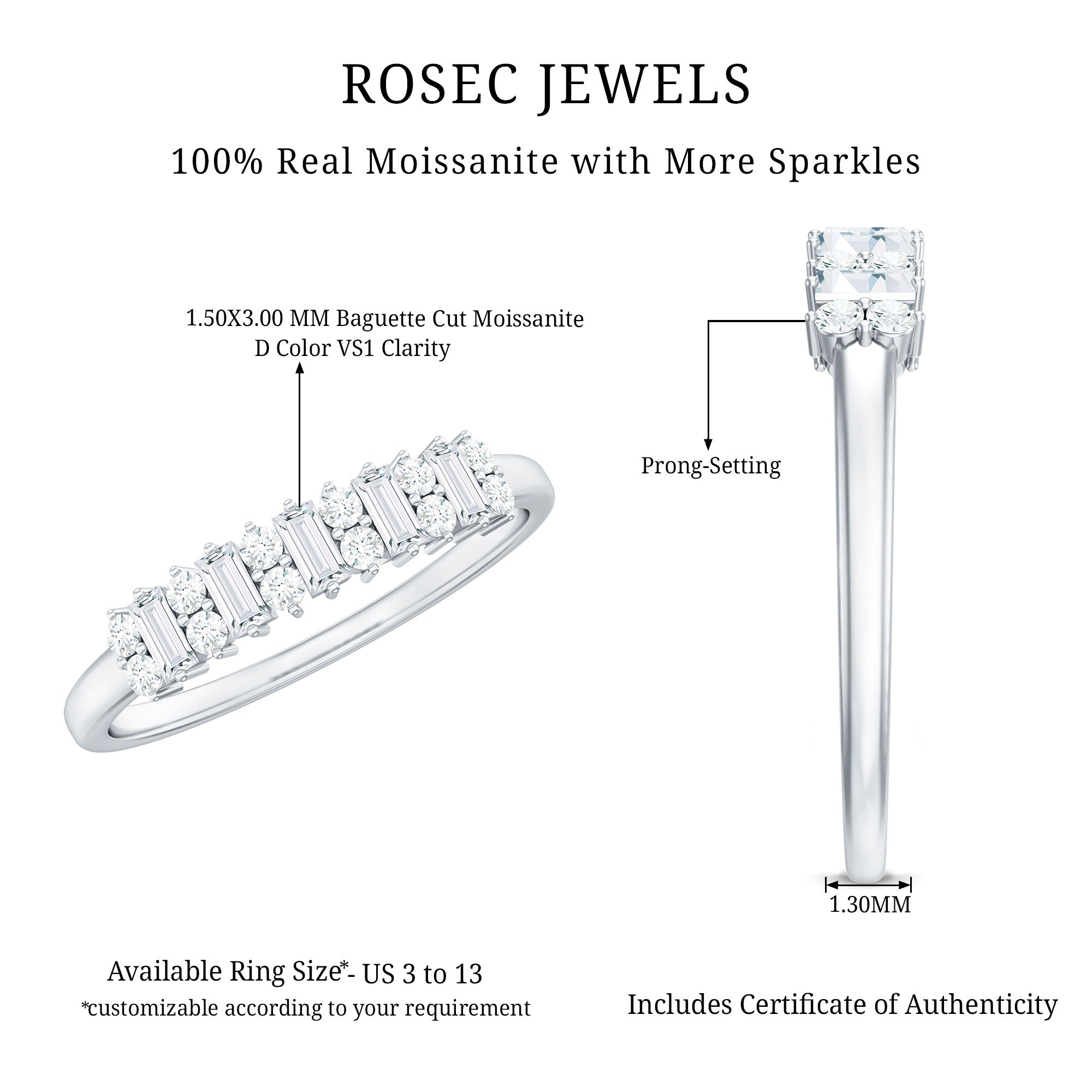 Shining with simple elegance, this Moissanite Anniversary Ring combines classic style with everyday comfort. The front part of the band features a beautiful pattern of baguette and round cut moissanite stones. Placed in an alternating pattern, the two shapes create a lovely flow of shine across the top of the band. The back of the Wedding Anniversary Ring is smooth and plain, making it very comfortable to wear all day long. Whether you are at work, going out with friends, or just relaxing at home, this Moissanite Half Eternity Ring feels light and easy on your finger. This versatile Moissanite Wedding Band is perfect for many occasions. It works wonderfully as a stylish wedding band, a meaningful anniversary gift, or a trendy stackable ring to add to your collection. You can wear it on its own to enjoy its simple beauty or stack it with your engagement ring for a full and glamorous bridal look. Offering a great balance between luxury and comfort, this Baguette and Round Wedding Band is designed to be worn every day. Its sparkling stones and sleek design make it a timeless piece that suits any style.