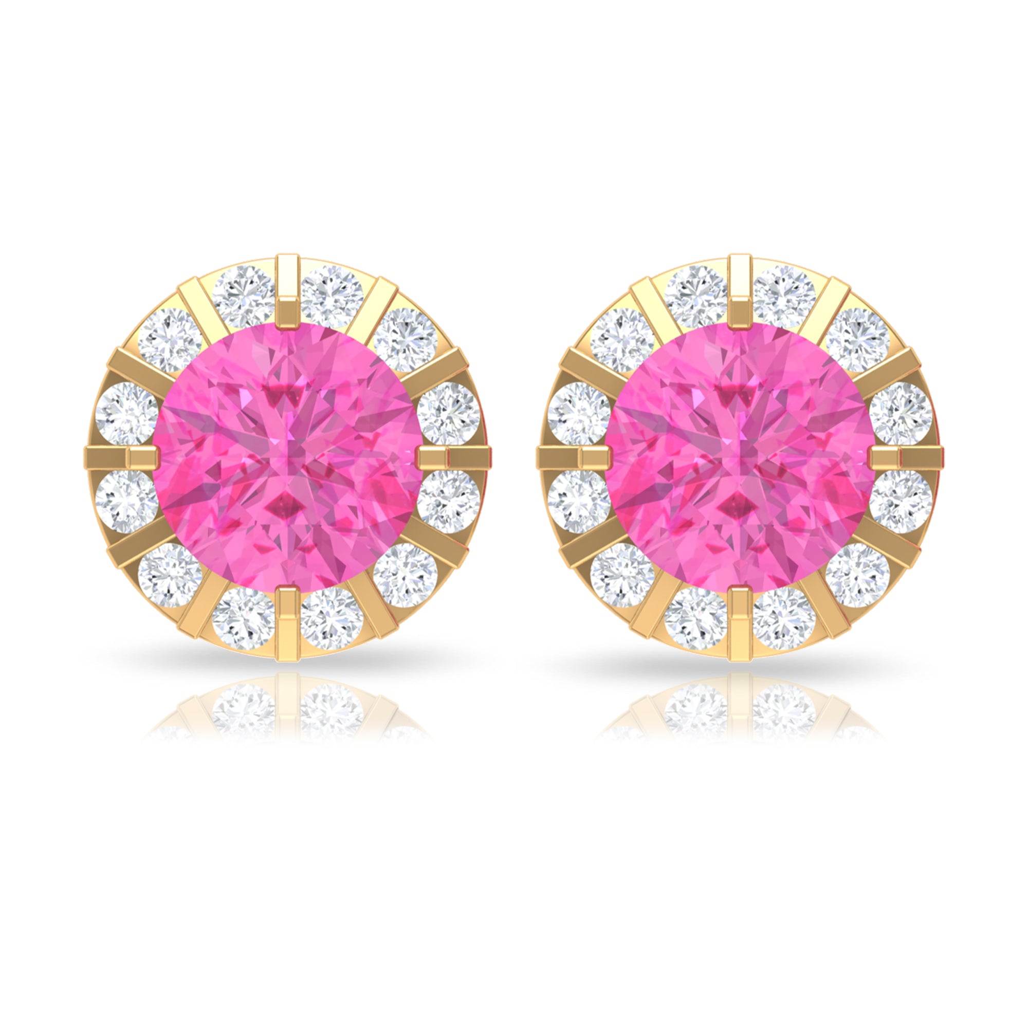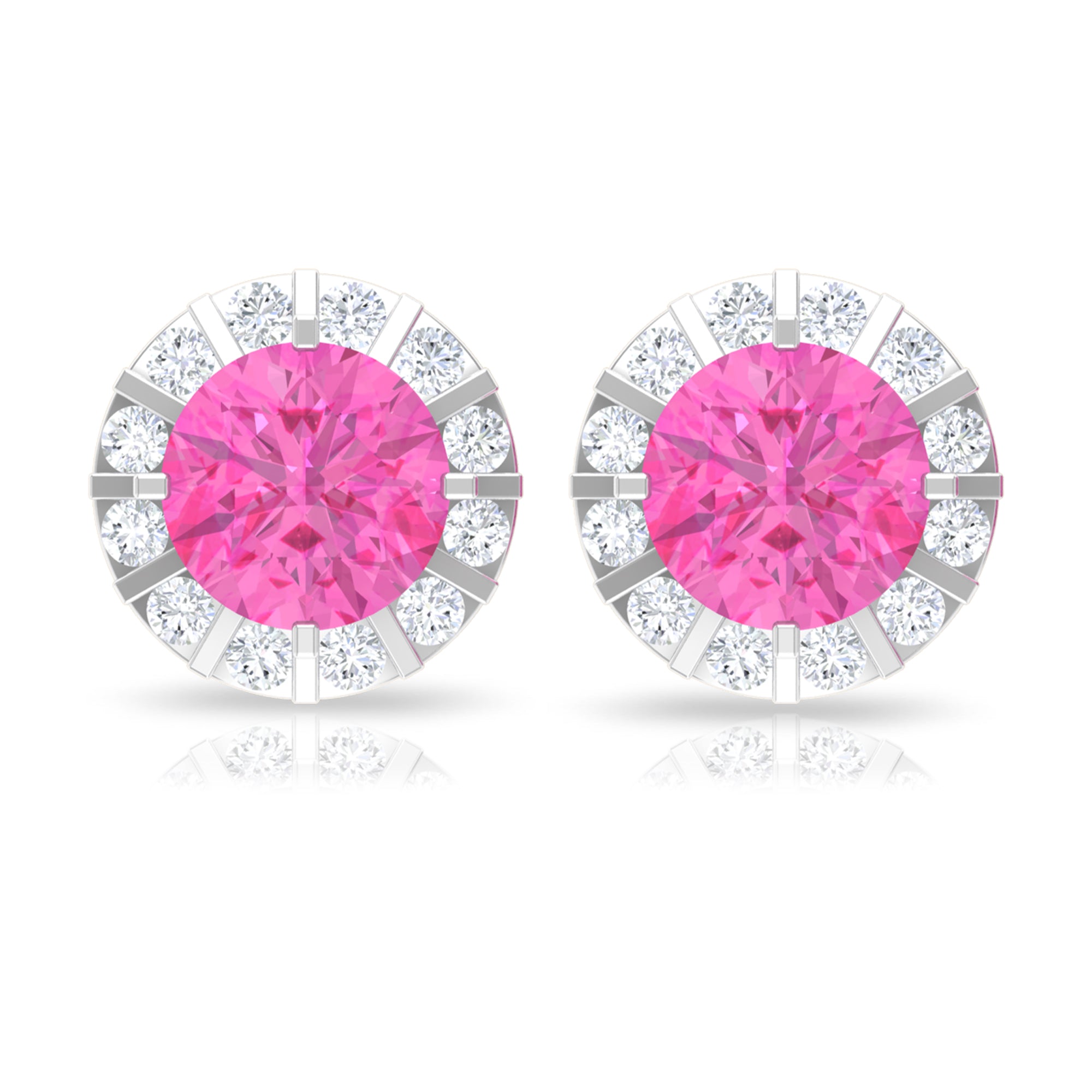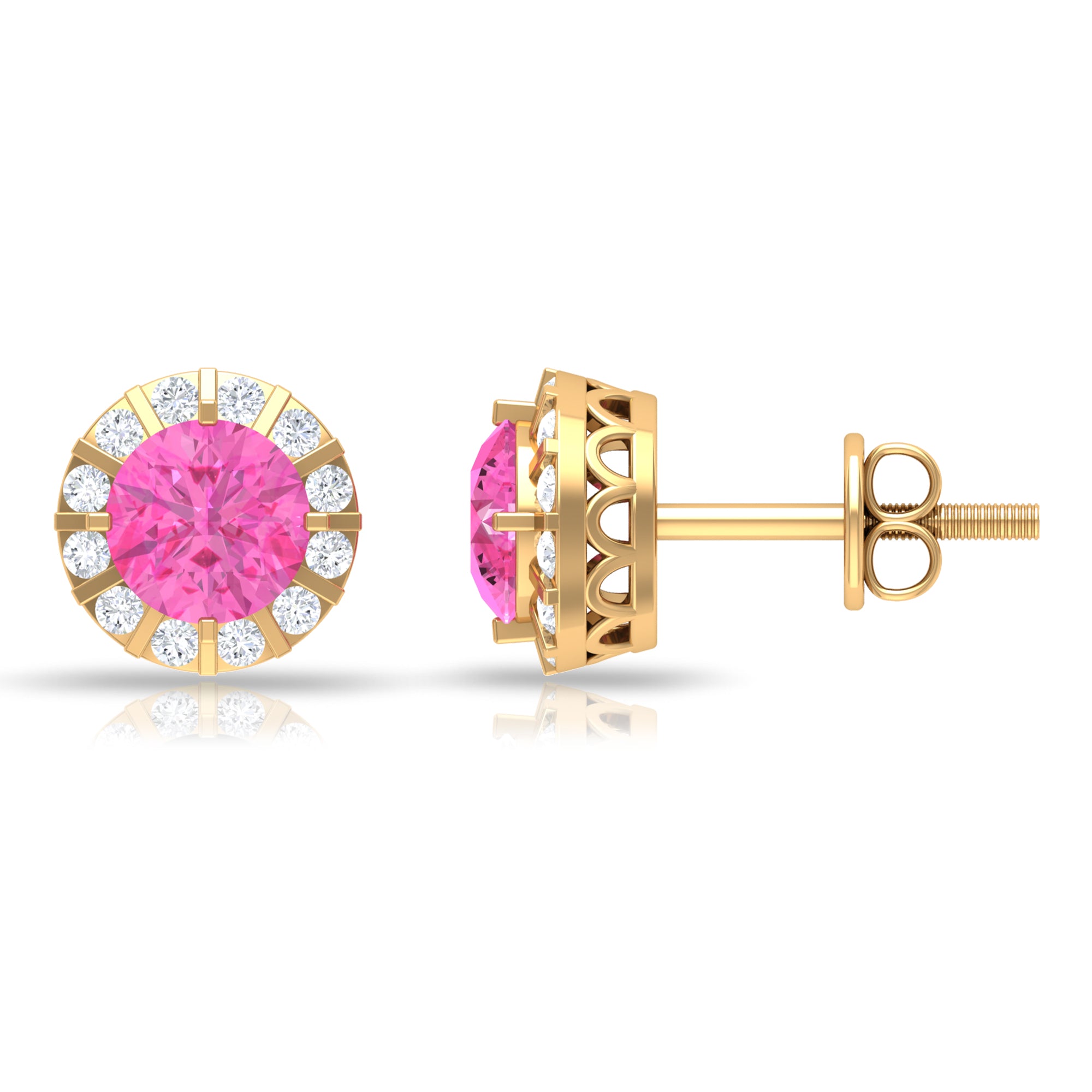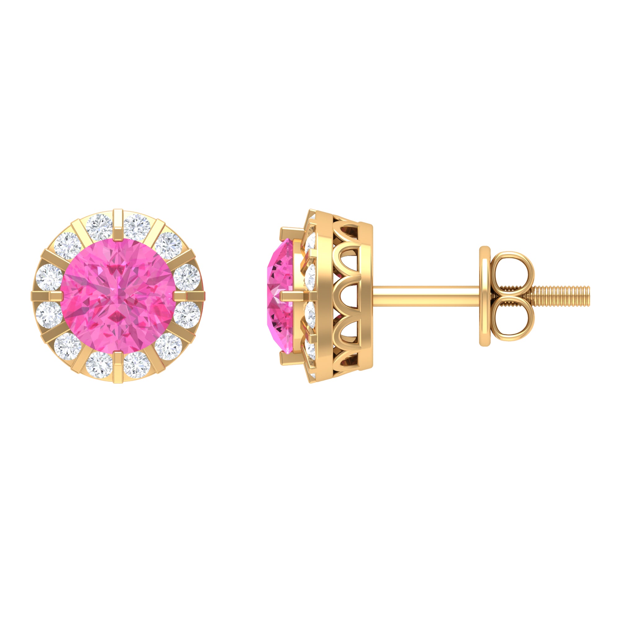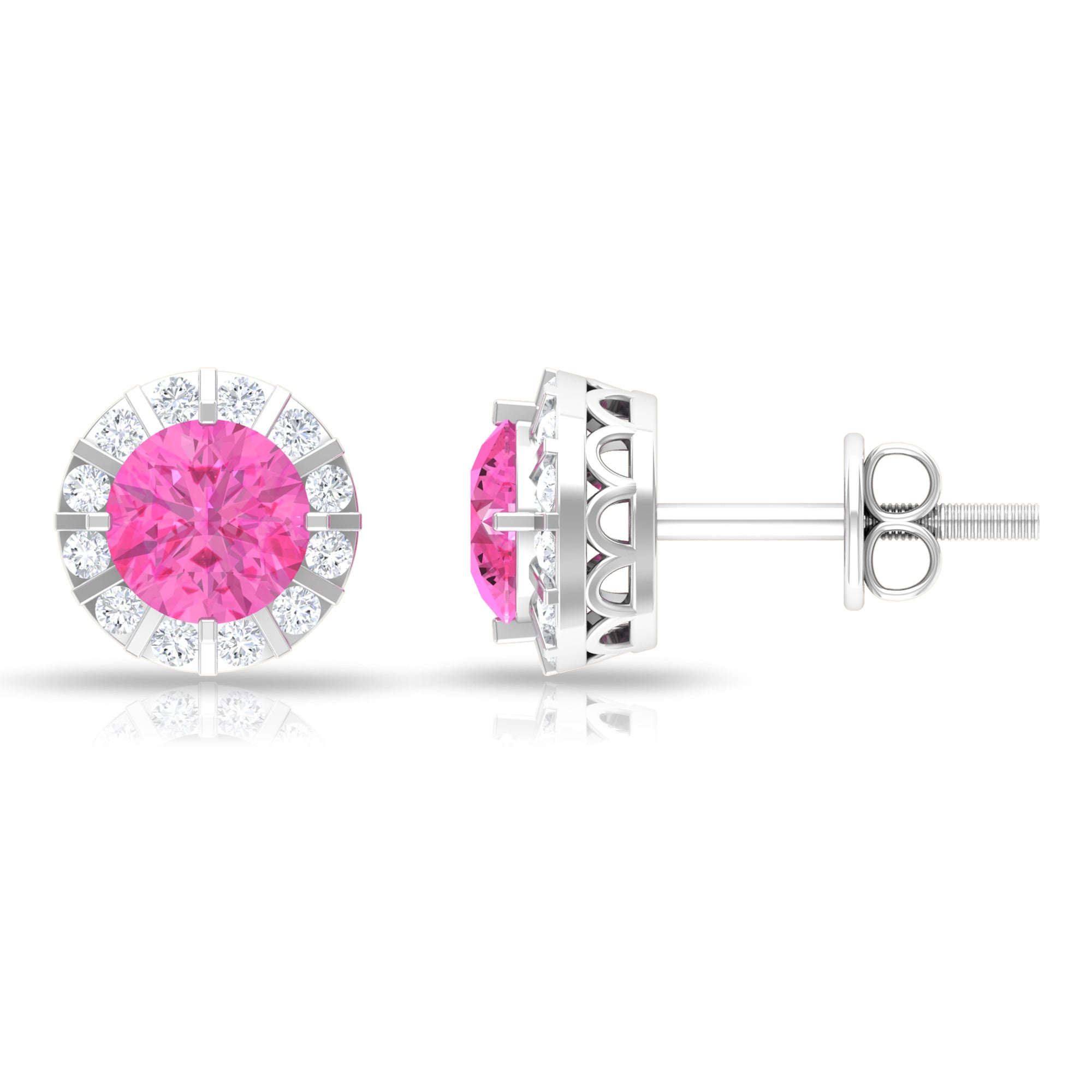Twinkle with our Stud Earrings featuring Round Shape Pink Sapphire and Round Shape Diamond Gemstone. This Pink Sapphire Halo Stud Earring is set in Prong Setting with Screw Back safety. It will be a unique Mothers Day gift for a Woman.