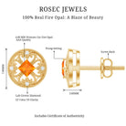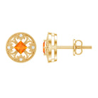 Inspired by the charm of old-world elegance, these Fire Opal Stud Earrings shine with warmth and timeless grace. Made with care in 14K yellow gold plated silver, these Round Stud Earrings feature a bright princess cut fire opal at the center. Surrounding the center stone is a beautiful, antique style design with delicate swirls and tiny bead details. The pattern feels classic and elegant, inspired by antique jewelry. Small round lab created diamonds are set in between, adding just the right sparkle and shine. They bring a soft contrast that highlights the deep color of the fire opal even more. These October Birthstone Earrings have screw backs, so they stay securely in place while being comfortable to wear all day. Whether you are getting dressed up for a special event or just want to brighten up your everyday outfit, these Vintage Opal Earrings are a lovely choice. Fire opal is known to represent passion and creativity, while the lab-created diamonds add a touch of purity and brilliance. Together, they create a meaningful piece you will enjoy wearing again and again. These Opal and Diamond Earrings are perfect if you love vintage-style jewelry with a modern twist. Whether it’s a gift for someone special or a treat for yourself, this pair brings warmth, style, and timeless beauty in one elegant design.