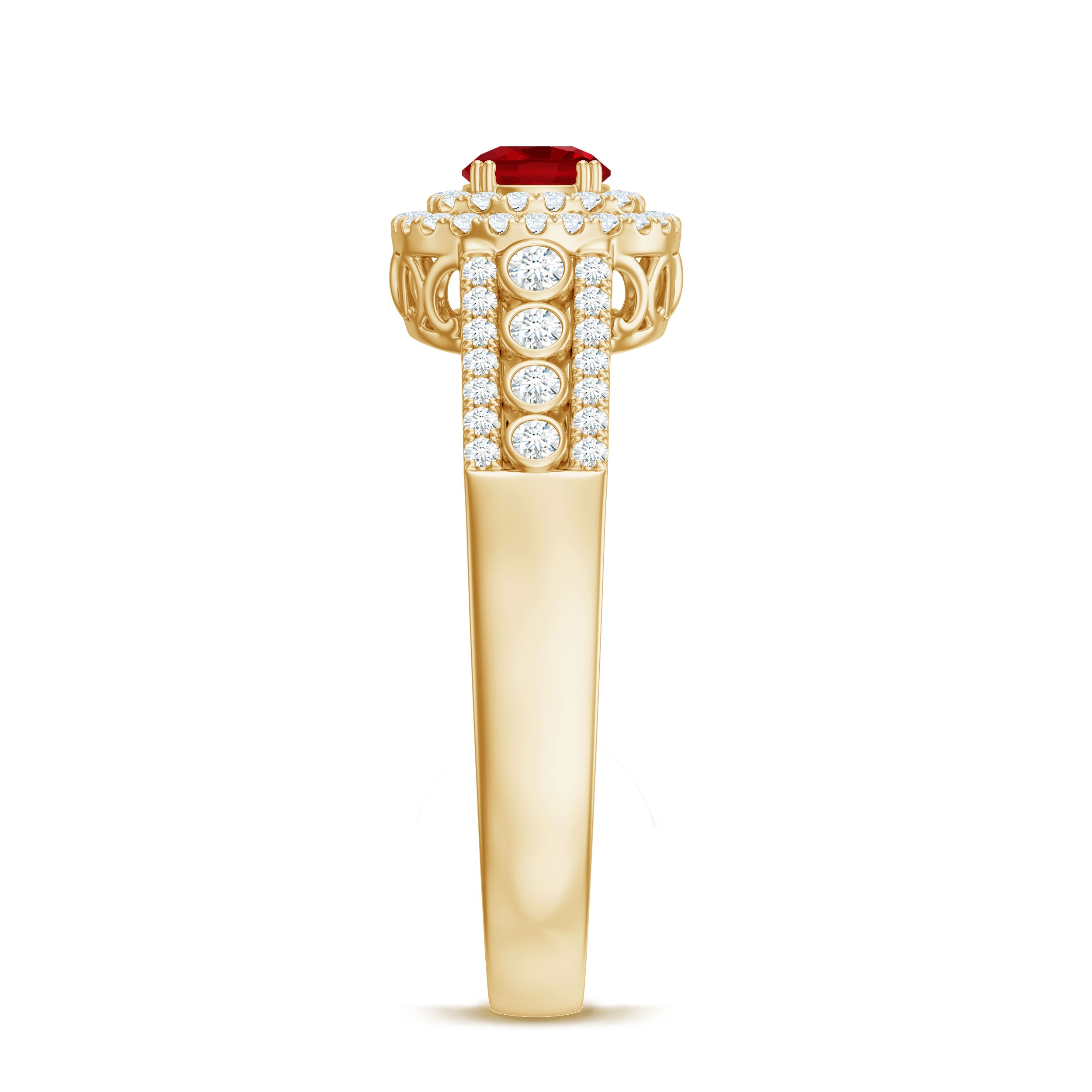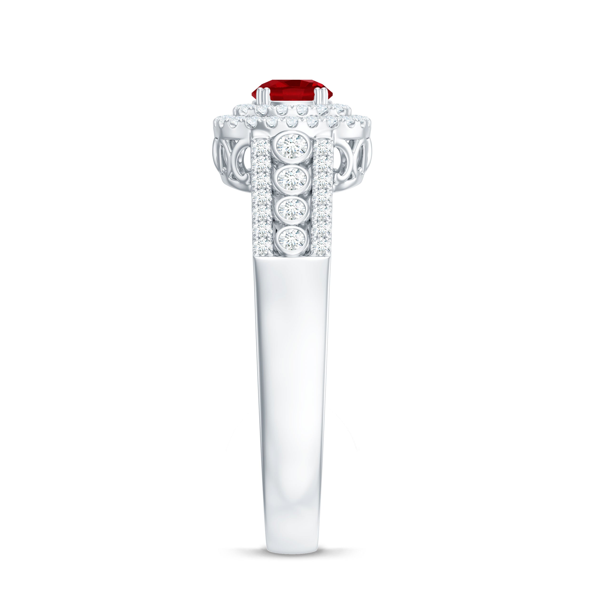 Step into the spotlight with a ring that is bold, sparkly, and full of charm. Designed with a vintage soul and a modern twist, this Lab Created Ruby Engagement Ring brings together all the right details to make your moment unforgettable. It is handcrafted with a 4 MM round shaped ruby, set neatly in prongs. Surrounding it is a dazzling double halo of moissanites, creating a burst of sparkle that grabs attention without saying a word. What makes this Ruby and Moissanite Ring extra special is the wide band. It is crafted with three rows of brilliant moissanite stones that add even more shine and give off that gorgeous Art Deco-inspired vibe. Every part of this Antique Looking Engagement Ring is meant to catch the light and turn heads, all while keeping things elegant and timeless. The rich red hue of the AAAA quality lab ruby paired with the icy brilliance of D color and VS1 clarity moissanites creates a perfect contrast that stands out from the usual designs. It arrives beautifully packed in a jewelry box and comes with a certificate of authenticity, so you know you are getting something truly special. Romantic and a little bit vintage, this Double Halo Ring is all about love that sparkles just as much as it lasts.