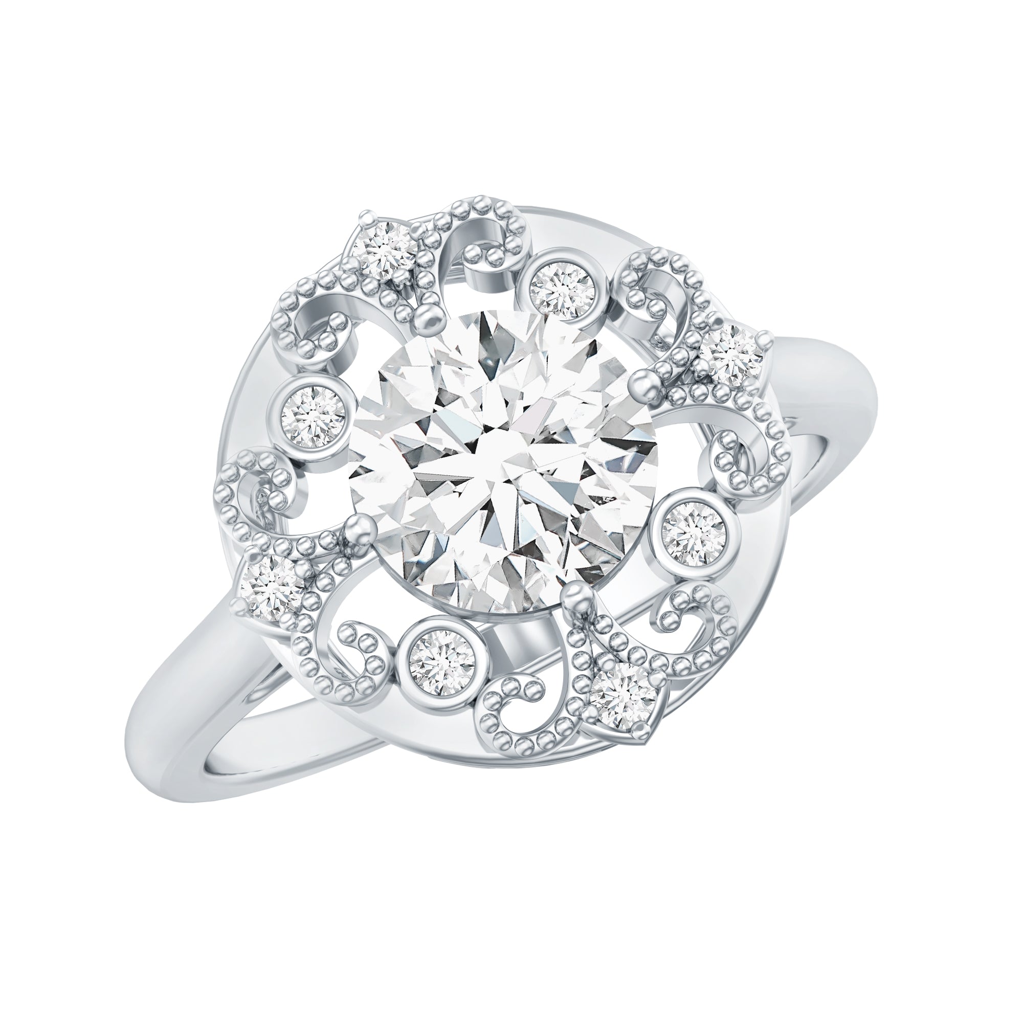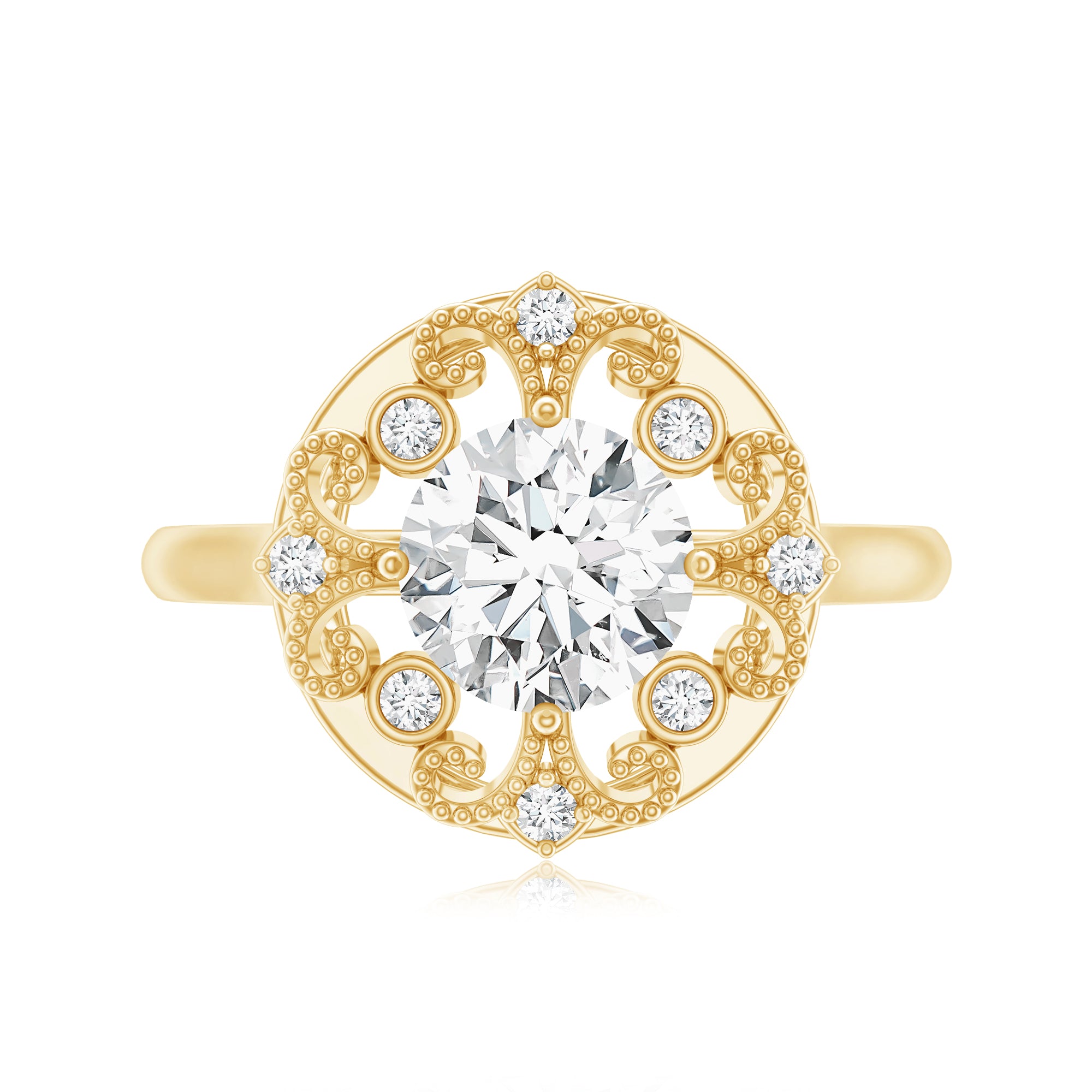 This Moissanite Engagement Ring will make her feel special on the big day. This ring is embellished with the 6 MM Round Shape Moissanite delicately placed in Prong Setting encircled by a Halo of Petite Moissanite. This Classic Engagement Ring is inspired by the vintage jewelry collection. Declare your feelings for your partner by getting this Vintage Inspired Engagement Ring as it will stay close to her forever. The shank of the ring is decorated with Moissanite along with the beaded detailing. Celebrate your bond with this stunning Halo Ring that beholds the shine of D-Vs1 Quality Moissanite.