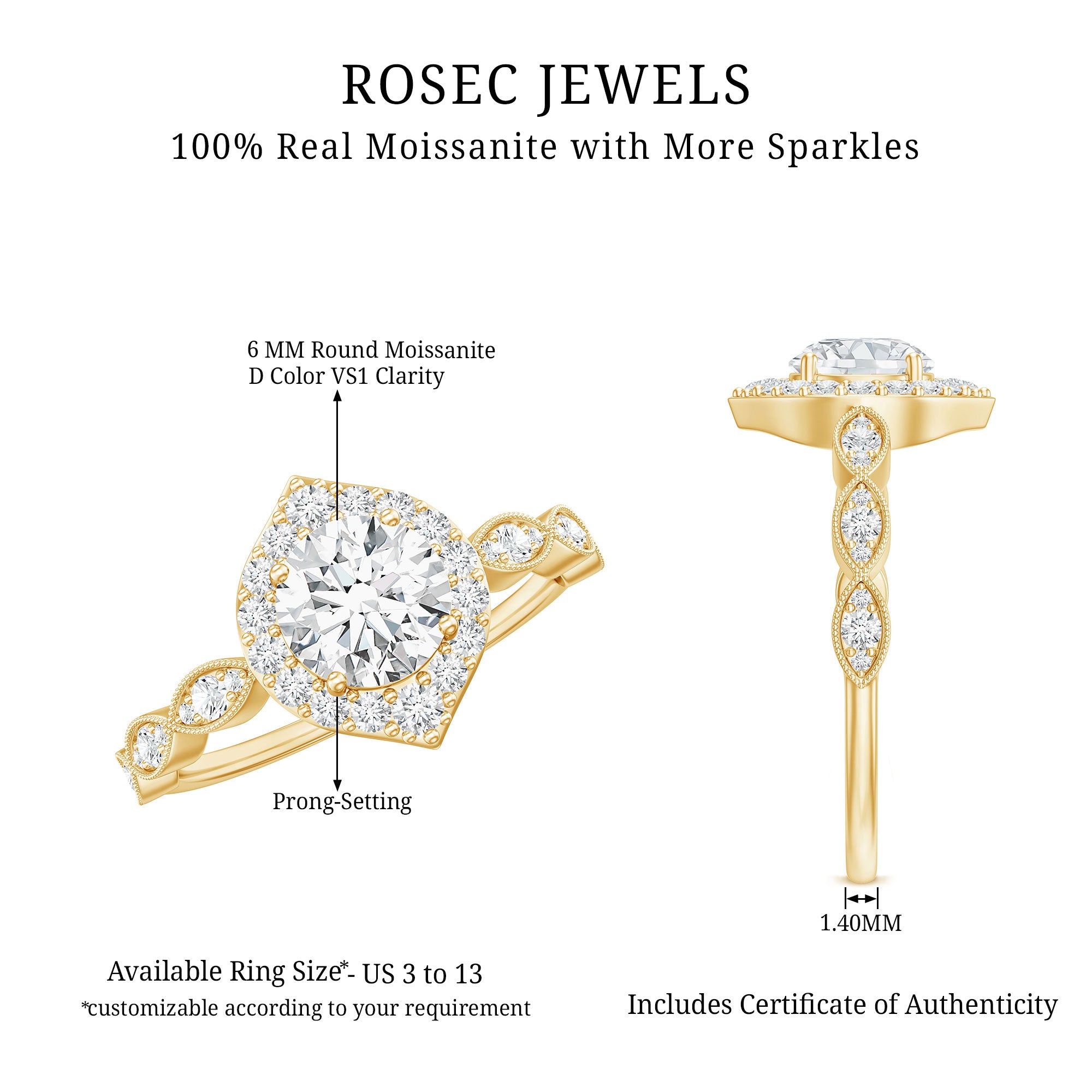 This Moissanite Engagement Ring will make her feel special on the big day. This ring is embellished with the 6 MM Round Shape Moissanite delicately placed in Prong Setting encircled by a Halo of Petite Moissanite. This Classic Engagement Ring is inspired by the vintage jewelry collection. Declare your feelings for your partner by getting this Vintage Inspired Engagement Ring as it will stay close to her forever. The shank of the ring is decorated with Moissanite along with the beaded detailing. Celebrate your bond with this stunning Halo Ring that beholds the shine of D-Vs1 Quality Moissanite.