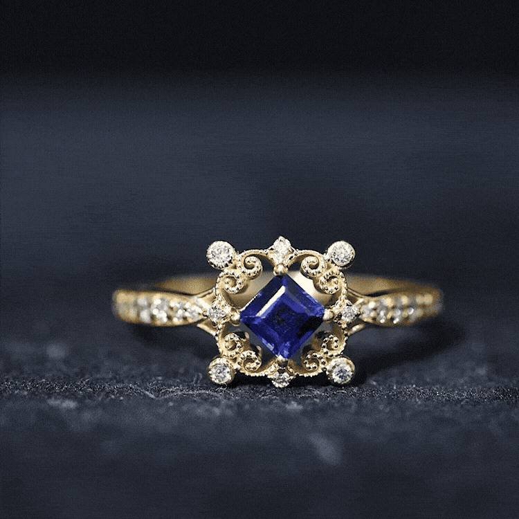 Make a timeless statement with this breathtaking Antique Engagement Ring, featuring a Princess Cut Created Blue Sapphire set in a Prong Setting surrounded by sparkling Diamond Accents and intricate Beaded Details. Expertly crafted in Solid Gold, this Created Blue Sapphire ring is the epitome of elegance and makes the perfect choice for any special occasion.