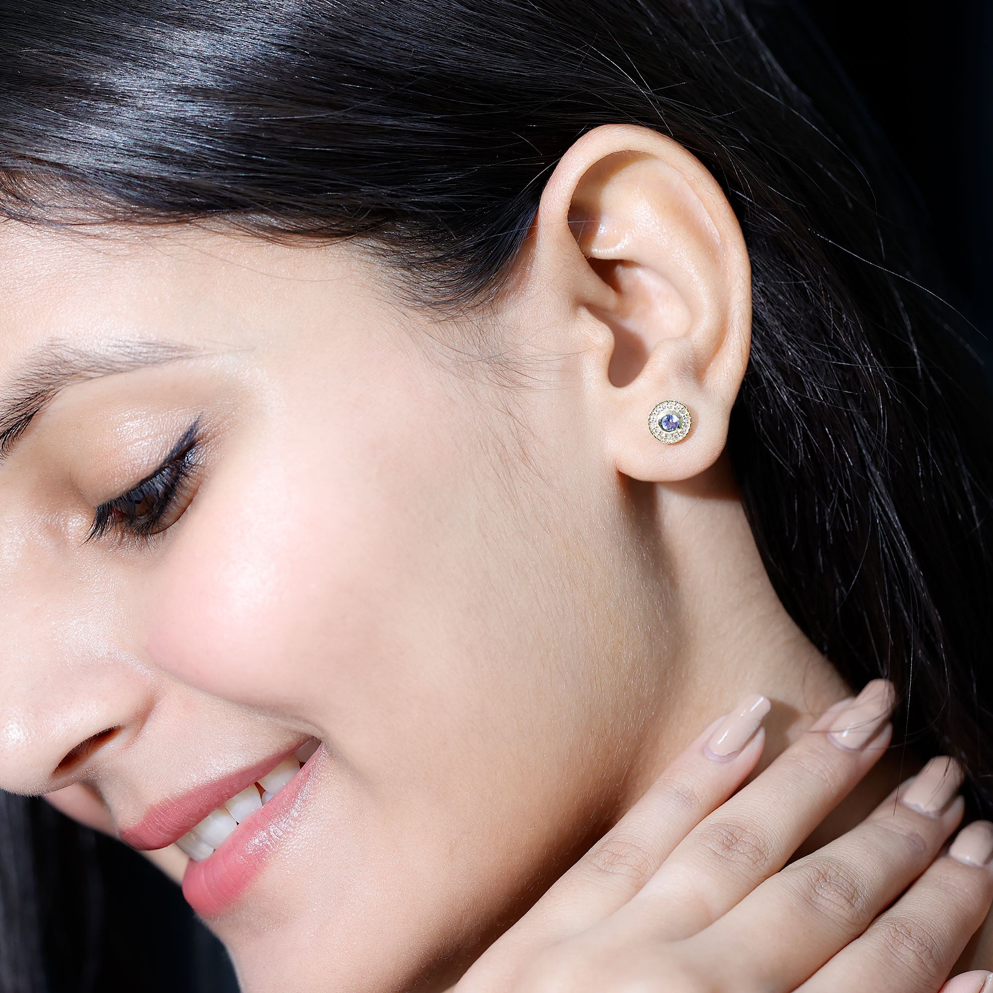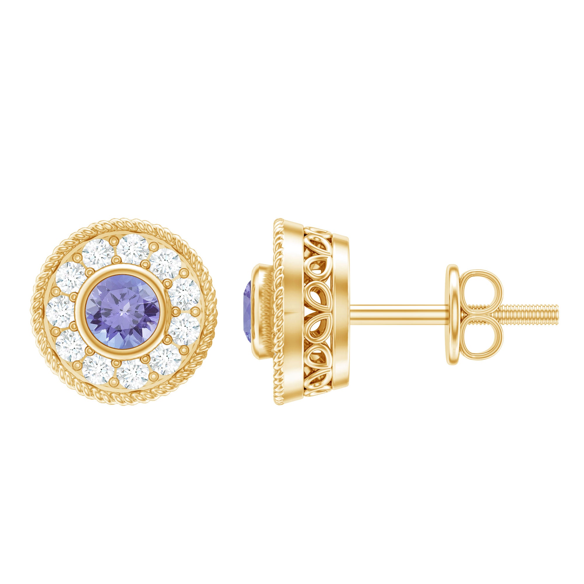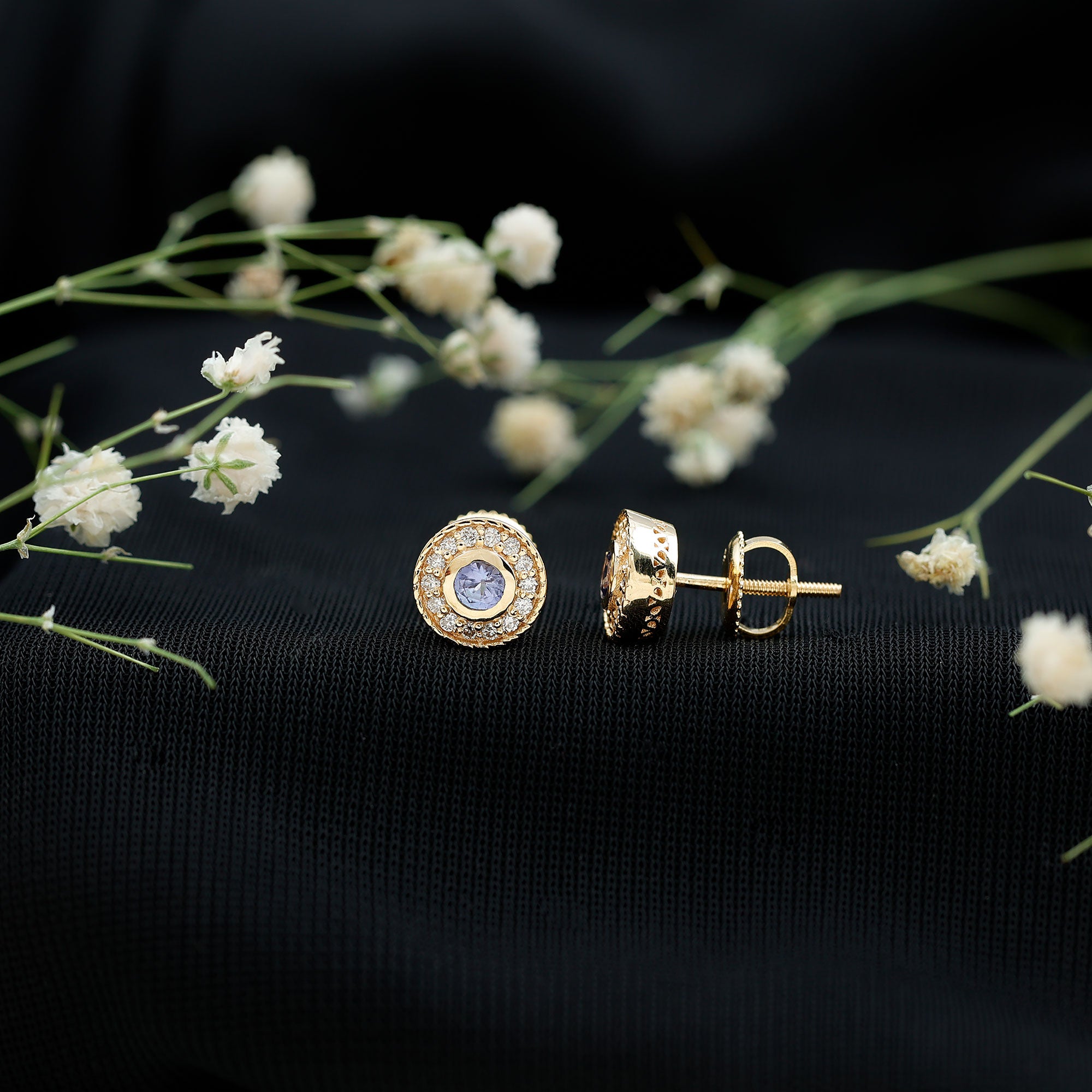 Flaunt these mesmerizing Halo Earrings with your casual or party attire and leave everyone enchanted and talking about you. Encrusted with Round Shape Tanzanite in the center secured by Bezel Setting and dainty Round Diamonds studded as Halo. Your jewelry collection wont be complete without including these gorgeous Tanzanite Earrings. Celebrate special occasions by getting these Unique Earrings as a present for your close ones.