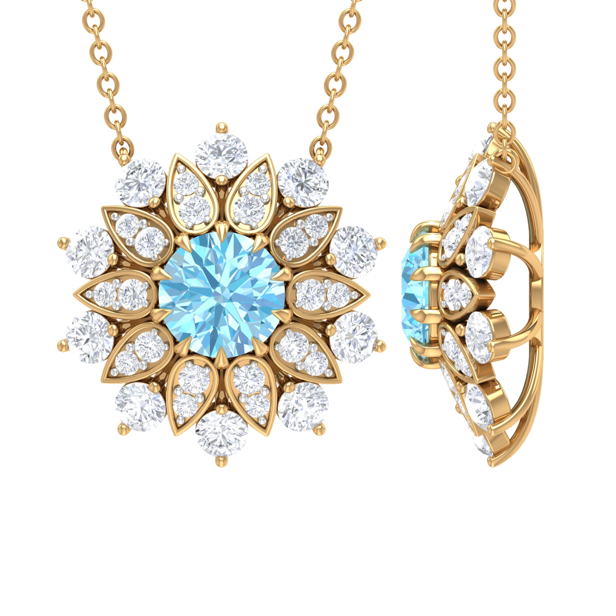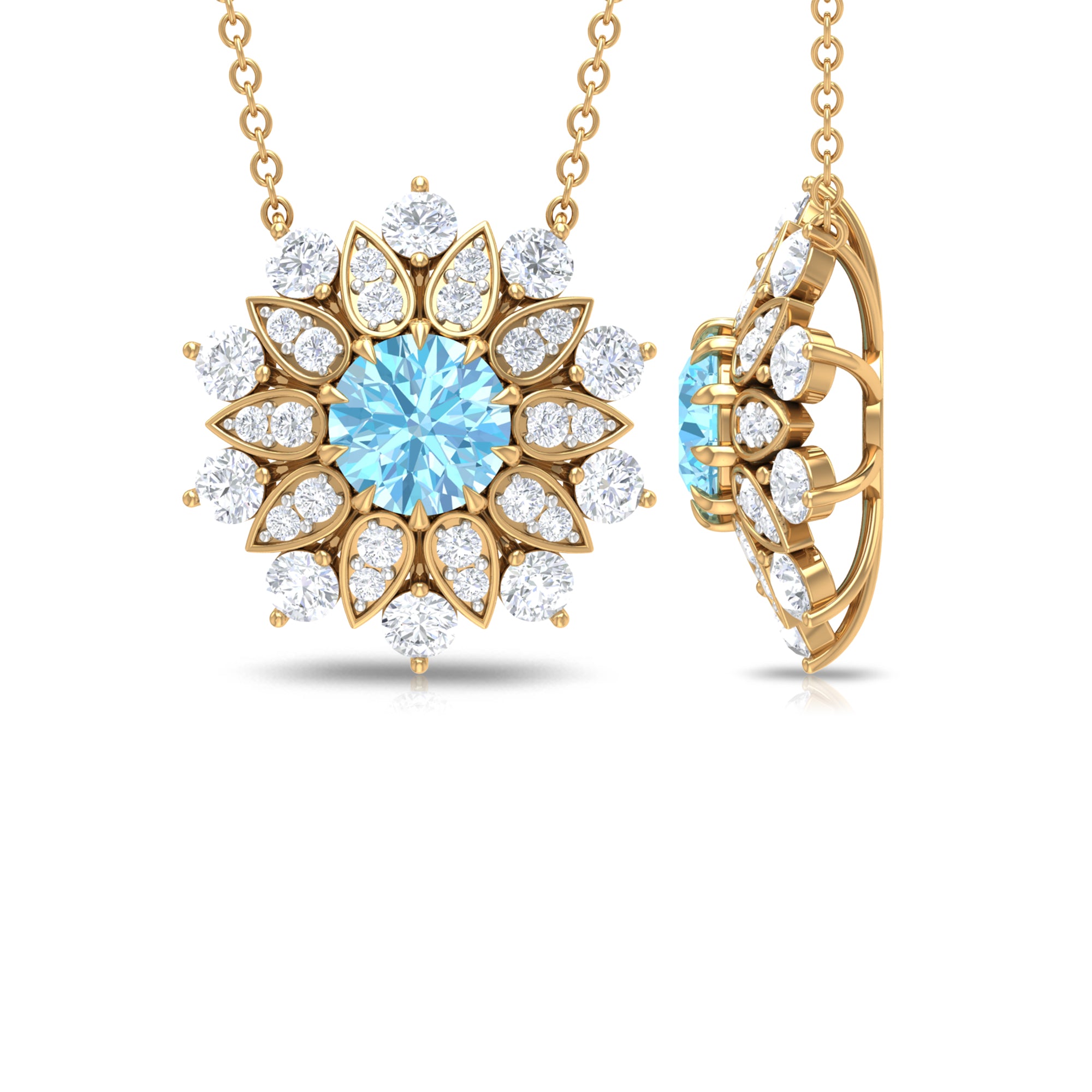Illuminate your style with our Aquamarine and Moissanite Flower Statement Necklace. A captivating Aquamarine graces the center of this floral-inspired masterpiece, symbolizing tranquility and grace. Surrounding it, shimmering Moissanite gemstones form delicate petals, creating an intricate and enchanting design. This necklace is not just jewelry; its a statement of elegance and natural beauty. Whether youre wearing it to complement your outfit or to celebrate March birthdays, this necklace will always command attention. With its timeless allure and floral motif, its a piece that captures the essence of sophistication and grace, making it a cherished addition to your jewelry collection.