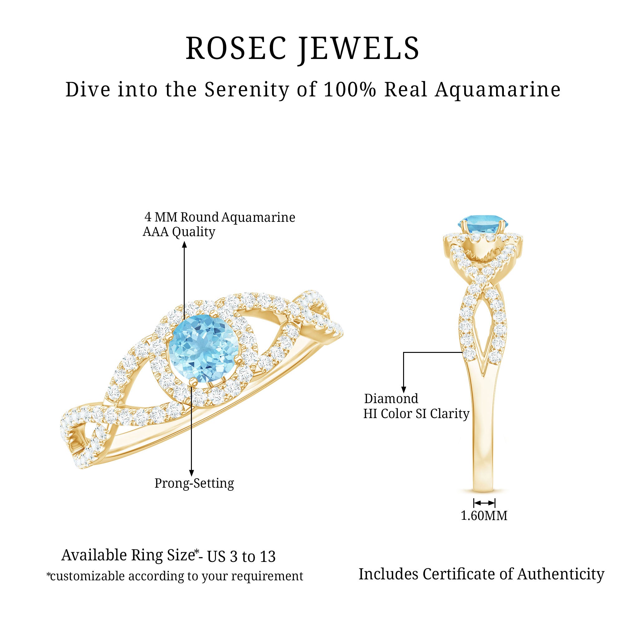 This stunning engagement ring showcases the mesmerizing beauty of a round Aquamarine as its centerpiece, elegantly secured in a classic prong setting. The shank of the ring features an intricate crisscross design adorned with sparkling Diamond stones, elevating the overall allure and luxury of the ring. With its enchanting beauty and timeless elegance, this Aquamarine engagement ring is a perfect symbol of your love and commitment.