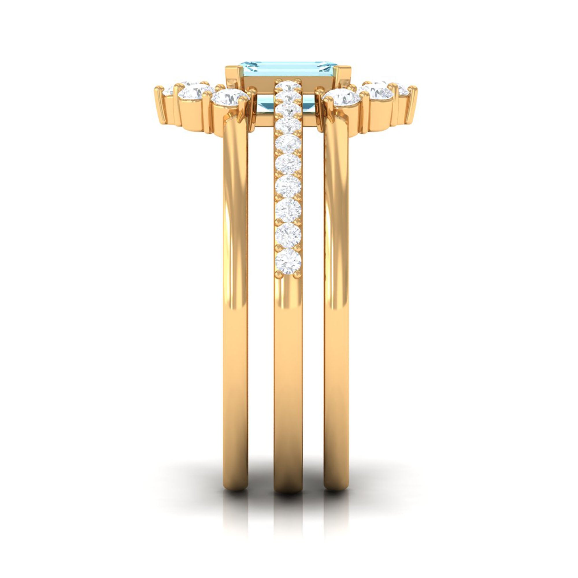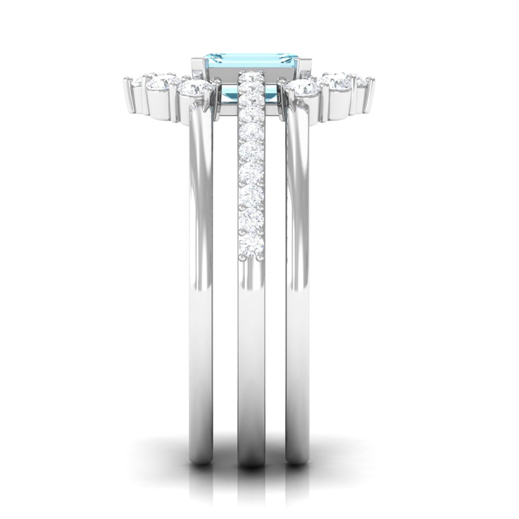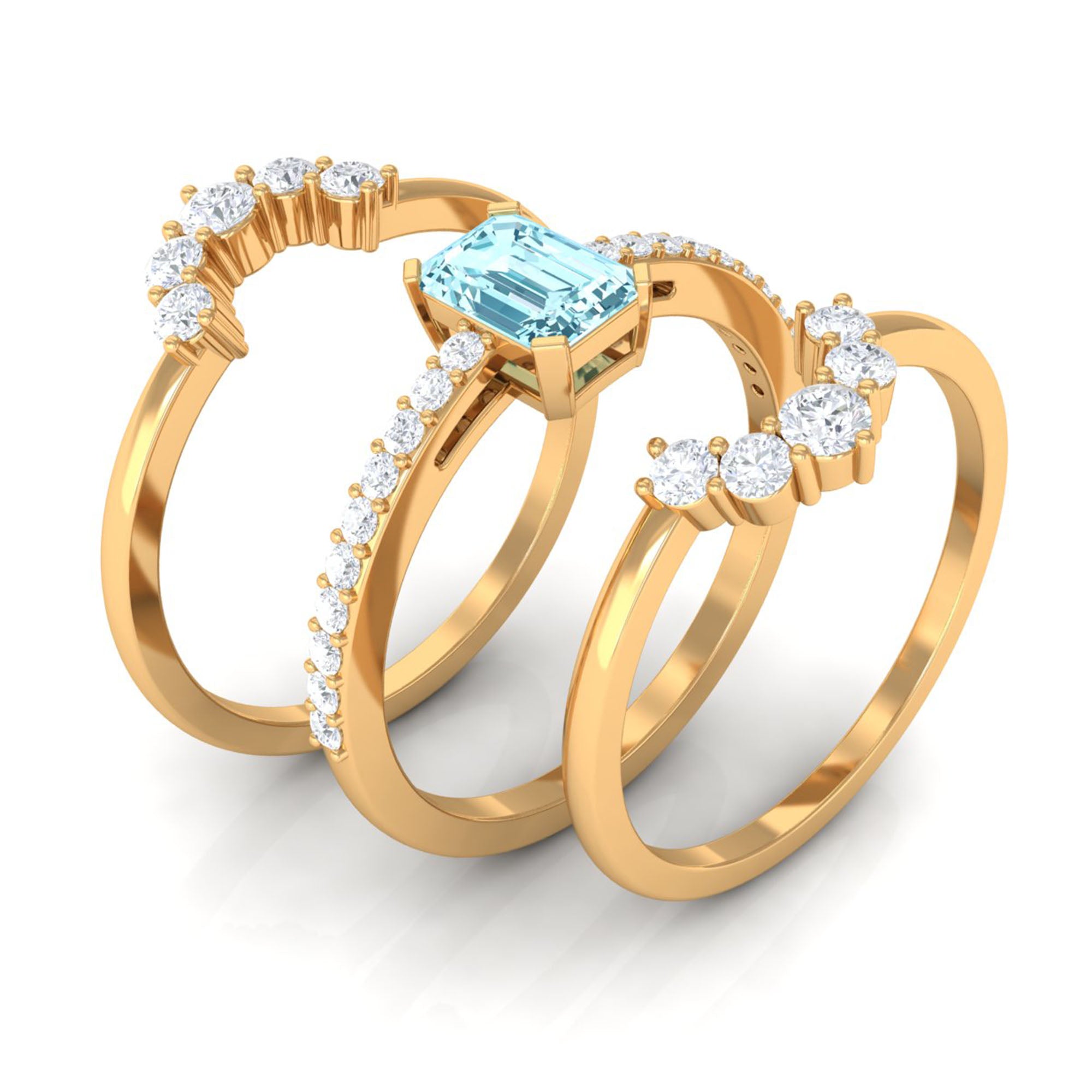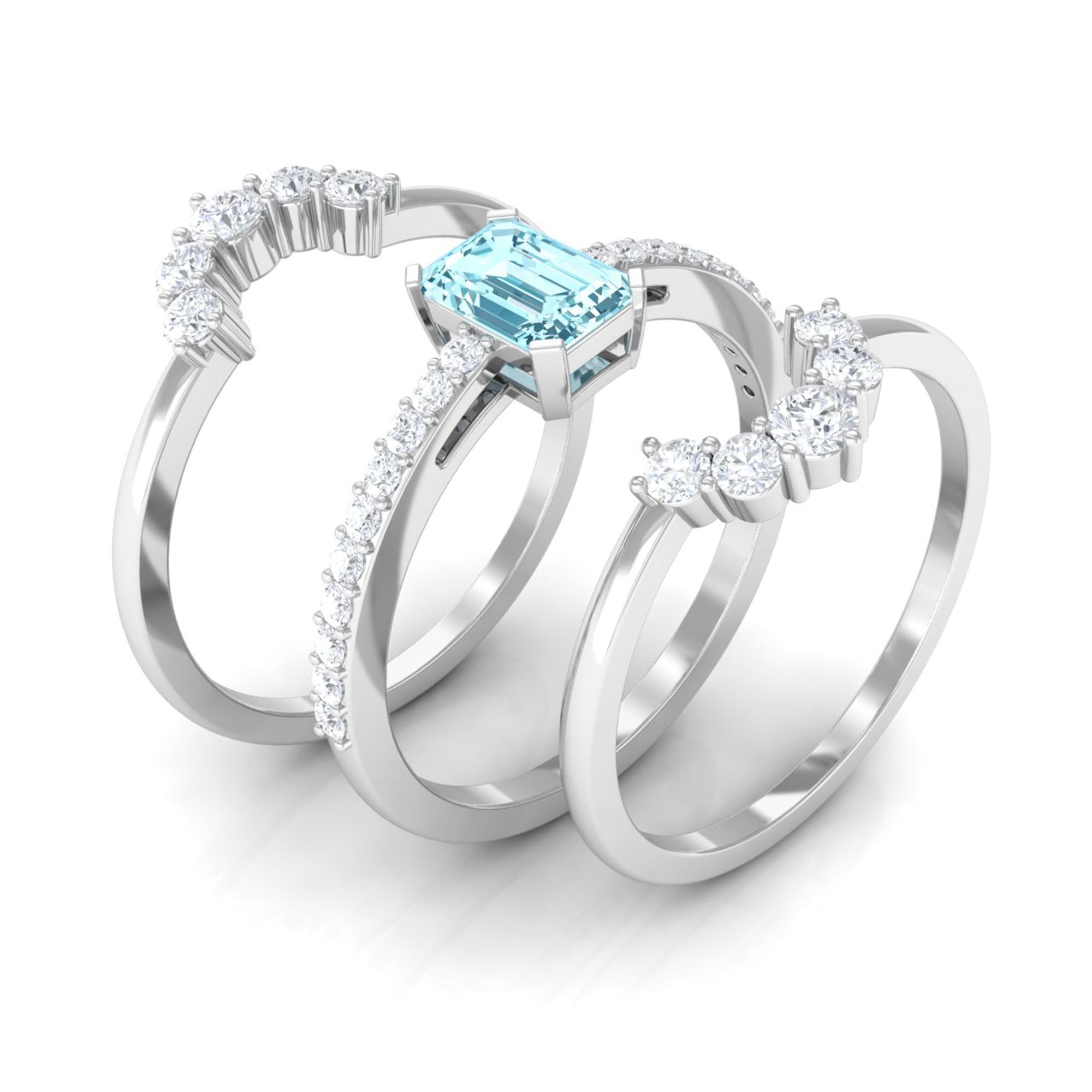 Make your day more special and unforgettable with this alluring Engagement Ring Set. Embellished with Emerald Cut Aquamarine studded as Solitaire while more dainty Round Shape Diamond studded on the two matching band. So, this Trio Ring Set will complement her beautiful dress and will let her grab all the attention on the big day.