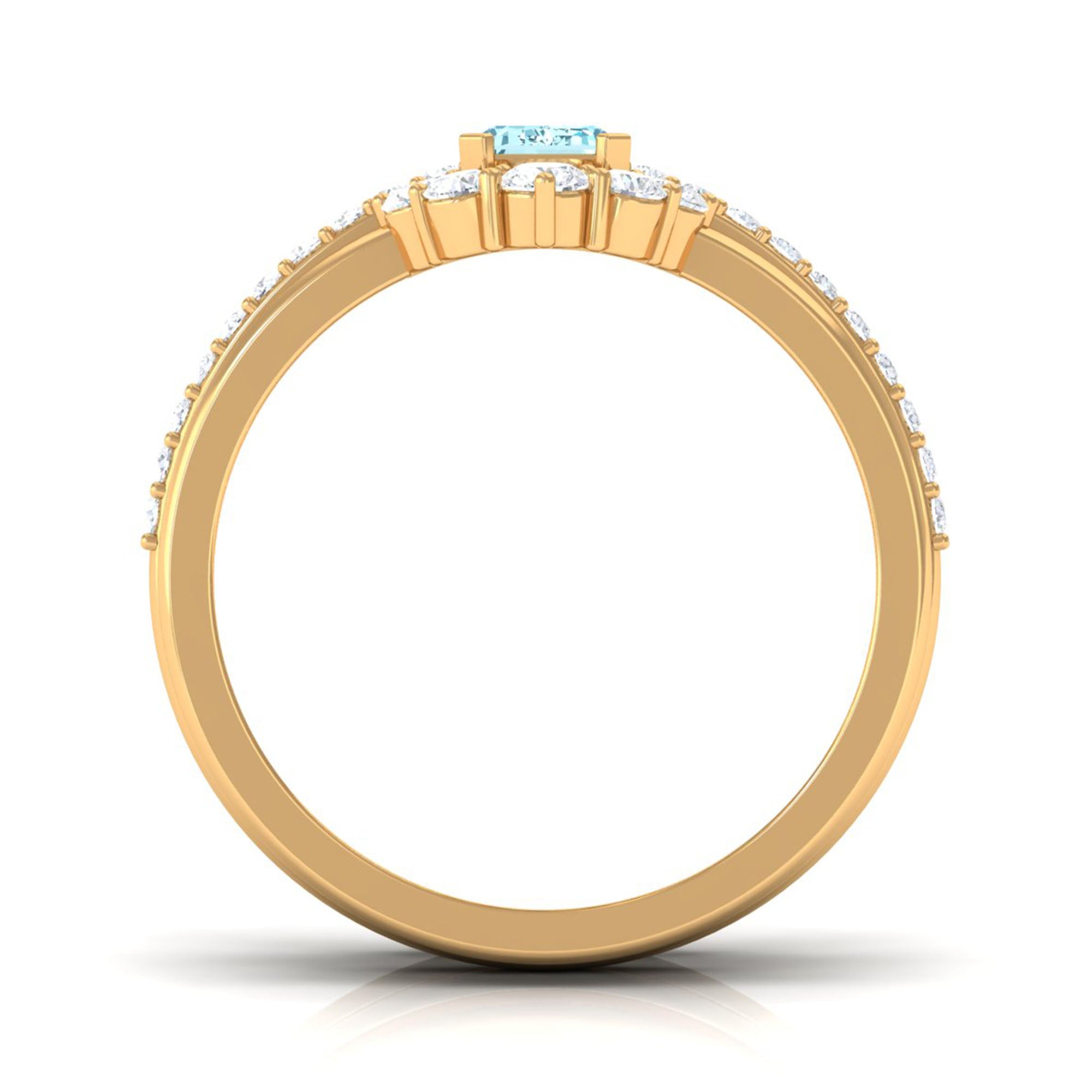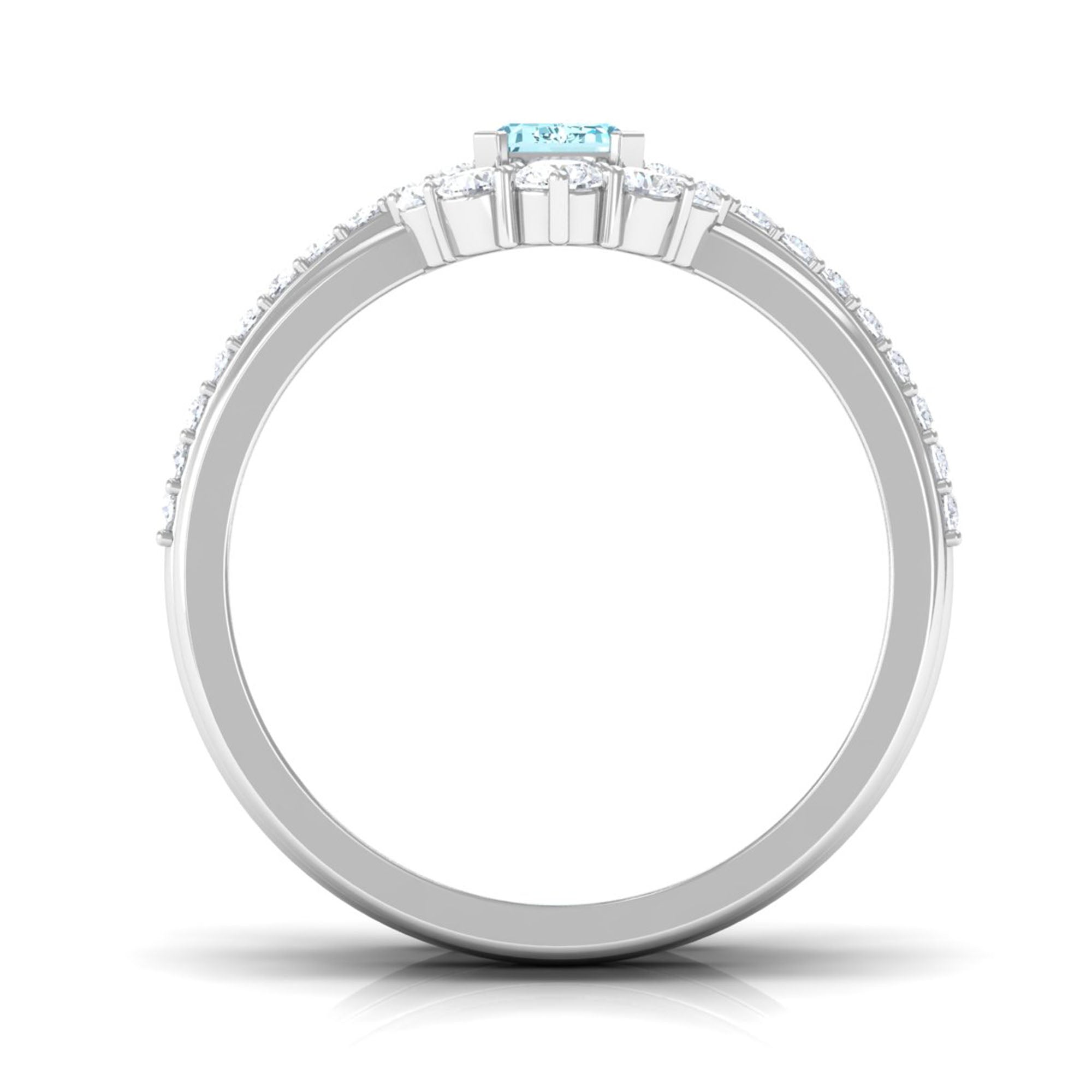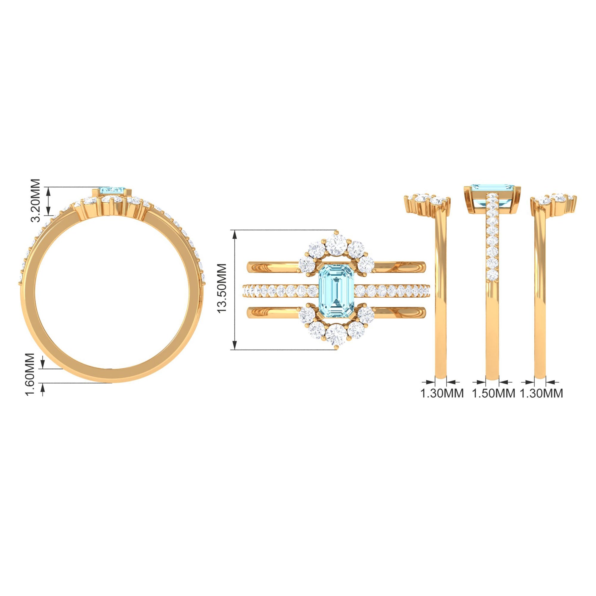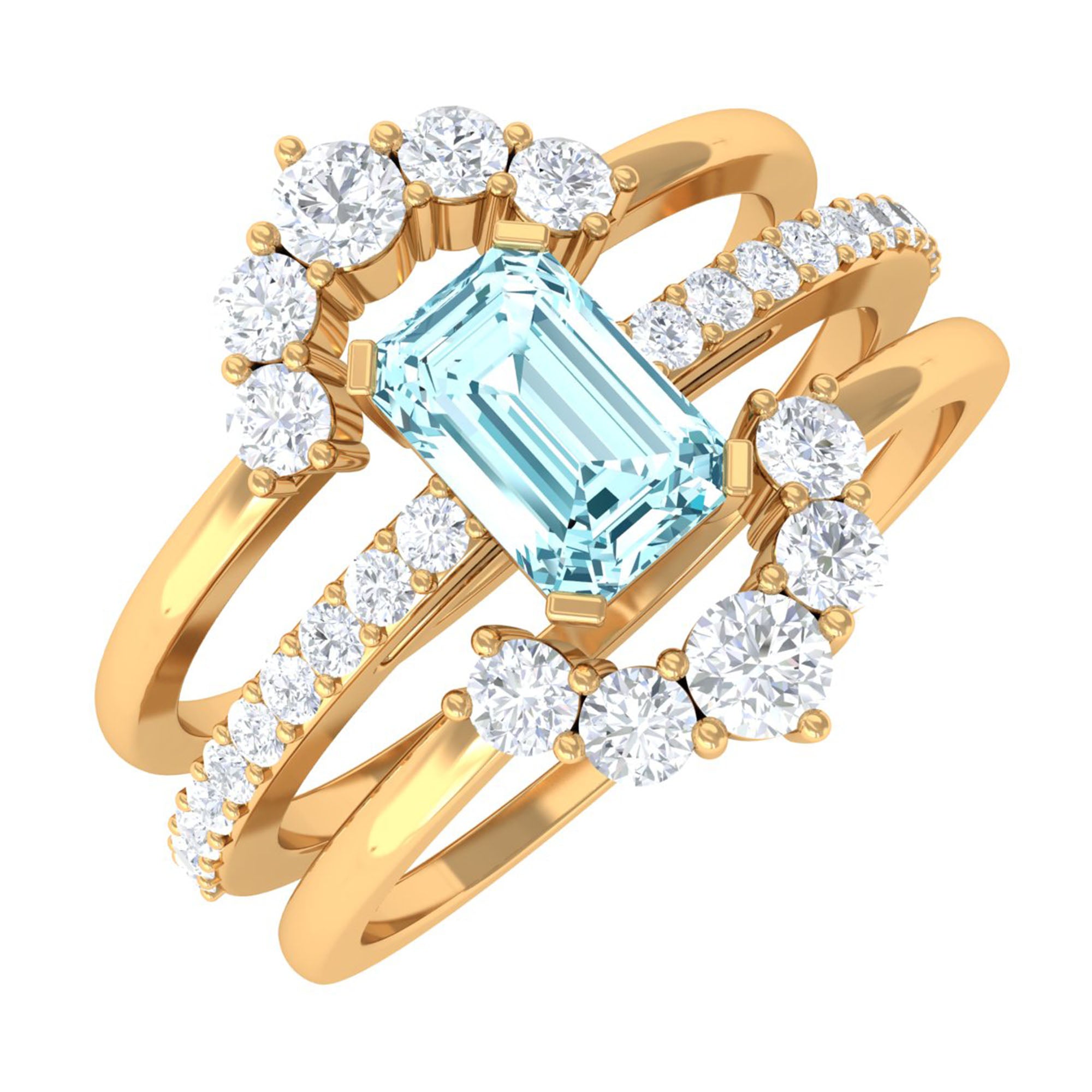 Make your day more special and unforgettable with this alluring Engagement Ring Set. Embellished with Emerald Cut Aquamarine studded as Solitaire while more dainty Round Shape Diamond studded on the two matching band. So, this Trio Ring Set will complement her beautiful dress and will let her grab all the attention on the big day.