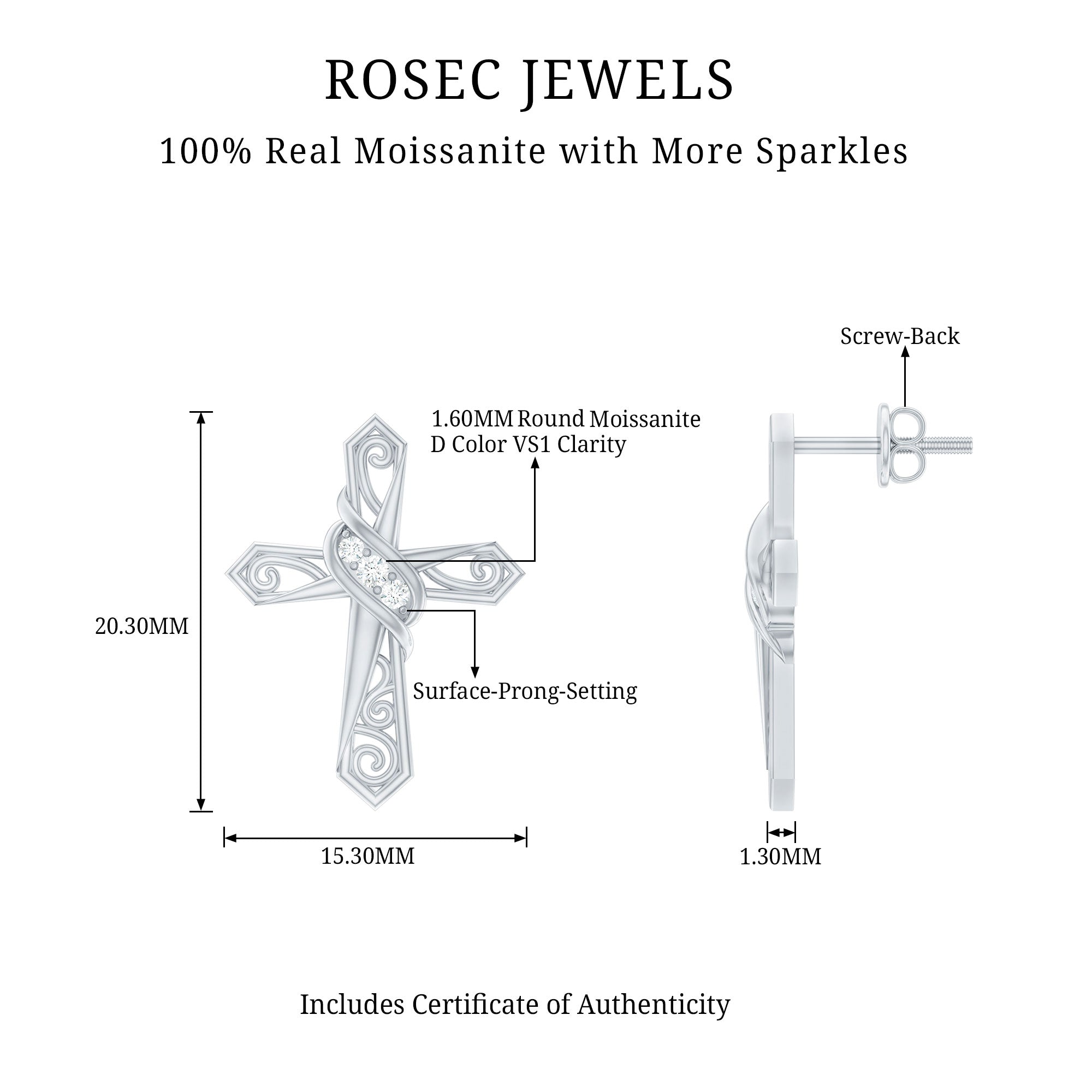 Embrace your belief artistically by wearing these Moissanite Art Deco Earrings crafted with 14K White Gold Plated Silver. The earrings feature 3 Moissanite stones placed diagonally at the center of a metallic cross frame depicting your spiritual values. The vintage pattern is engraved with artistic detailing that beautifies the overall look of these earrings. These Cross Earrings behold the classic shine of D-VS1 Quality Moissanite which makes it perfect to keep your beliefs close to your heart. The Earrings with Screw on Backs stay on place which ensures the safety of the jewel. These earrings will be delivered to you in premium packing with the certificate of authenticity.