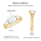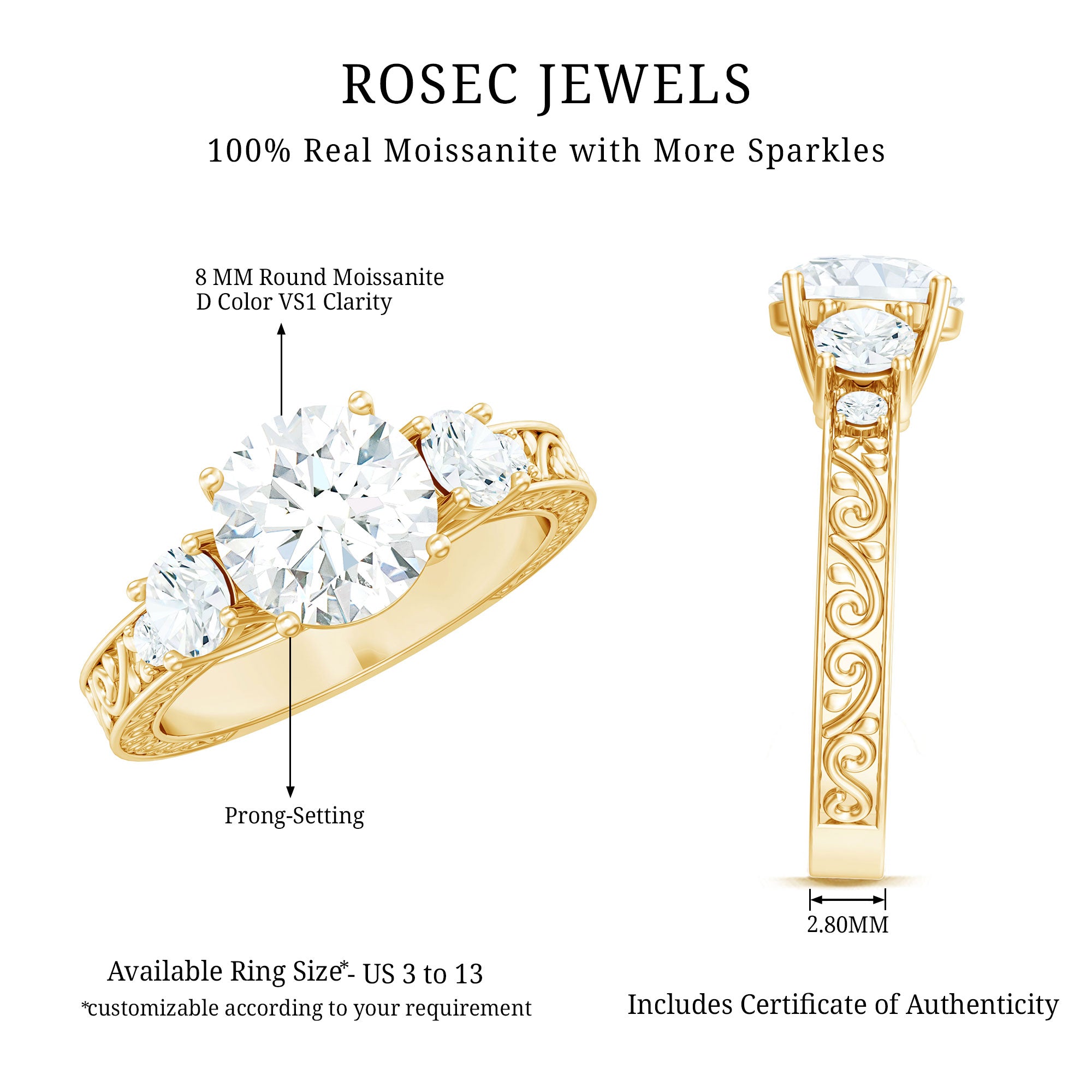 Adorn your hand with this stunning Vintage Engagement Ring. An 8 MM Round Shape Moissanite takes center stage as a solitaire, complemented by additional Round Moissanite stones in Prong setting. This Vintage Engraved Ring exudes timeless charm and a dazzling allure. The 3 Stone Ring beholds the shine of D-VS1 Quality Moissanite which will make your lady astonished on her big day. This Round Moissanite Ring will be delivered to you in a signature jewelry box for storage to keep it safe and dust-free when not in use. Your purchase will include the certificate of gemstone authentication to ensure the quality of the ring.