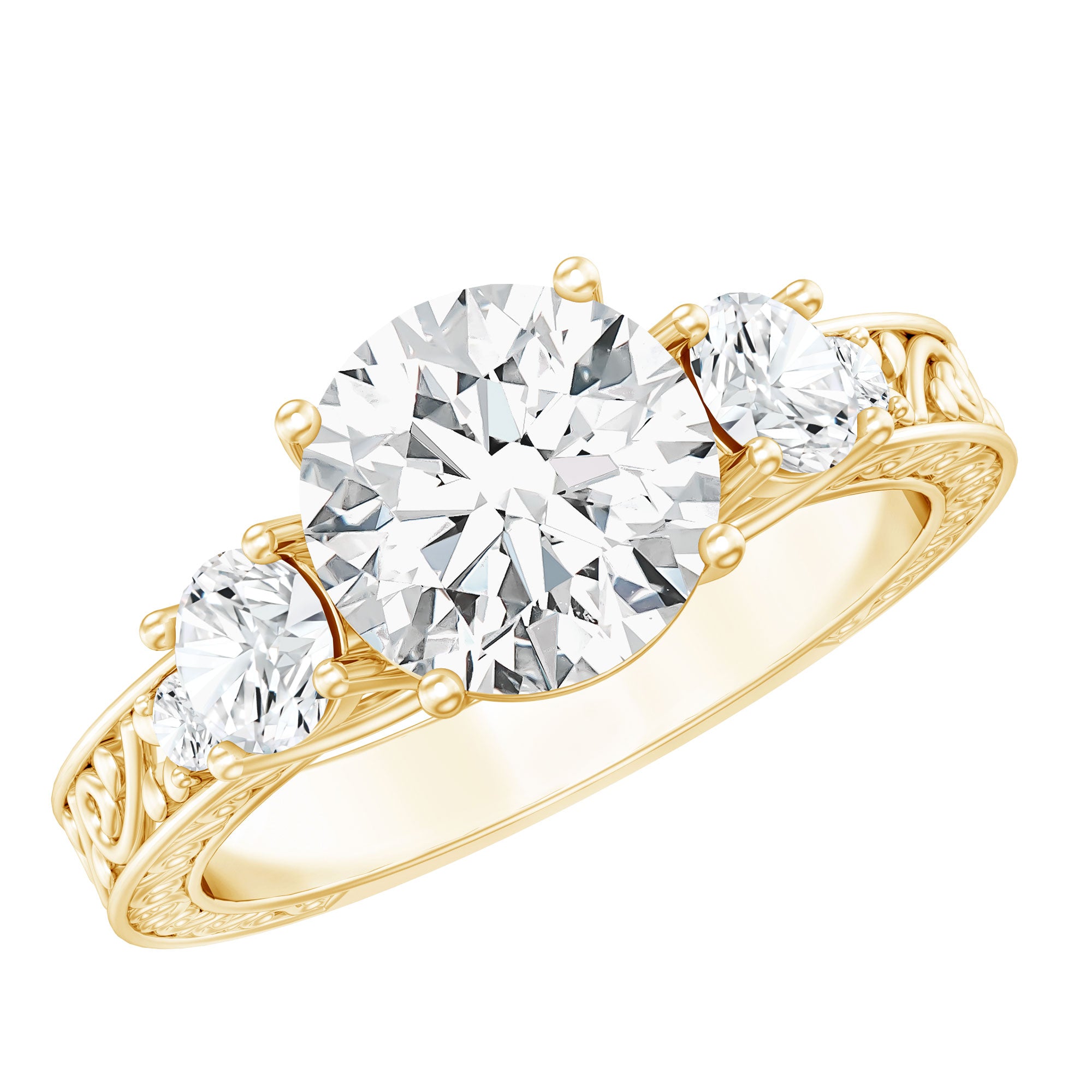 Adorn your hand with this stunning Vintage Engagement Ring. An 8 MM Round Shape Moissanite takes center stage as a solitaire, complemented by additional Round Moissanite stones in Prong setting. This Vintage Engraved Ring exudes timeless charm and a dazzling allure. The 3 Stone Ring beholds the shine of D-VS1 Quality Moissanite which will make your lady astonished on her big day. This Round Moissanite Ring will be delivered to you in a signature jewelry box for storage to keep it safe and dust-free when not in use. Your purchase will include the certificate of gemstone authentication to ensure the quality of the ring.