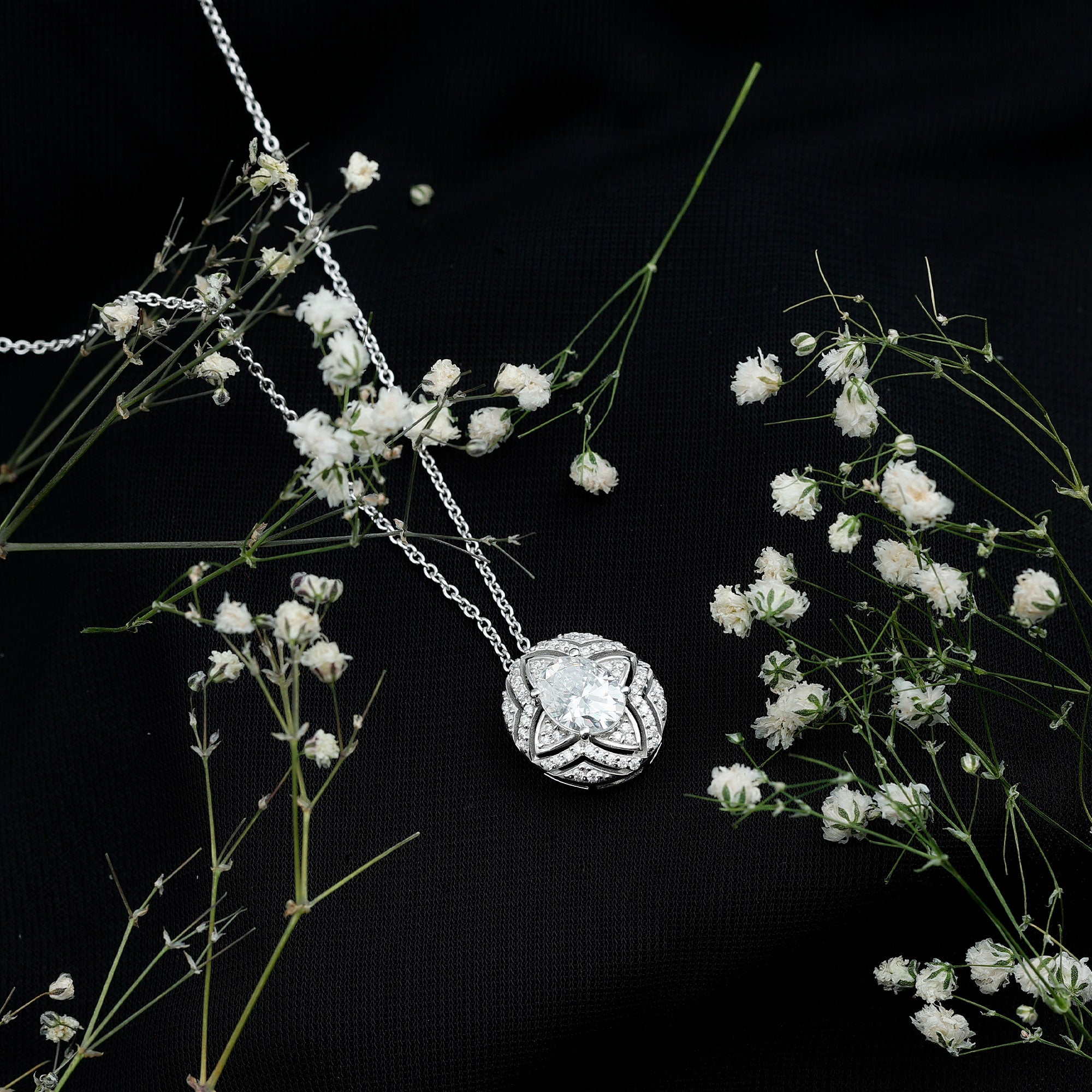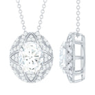 Be the talk of the town with this sparkling Moissanite Pendant Necklace, precisely crafted with 14K White Gold Plated Silver. The pendant features a 7X9 MM Oval Shape Moissanite secured in Prong Setting and adorned with smaller Moissanite stones that beautify the overall look. This Art Deco Pendant dazzles unmatchable shine of D-VS1 Quality Moissanite and is accentuated with a Hidden Bail. This Statement Pendant dangles in a sturdy cable chain which makes it perfectly sit on the neckline. The Designer Necklace will be delivered to you in a signature velvet pouch with the certificate of authenticity.