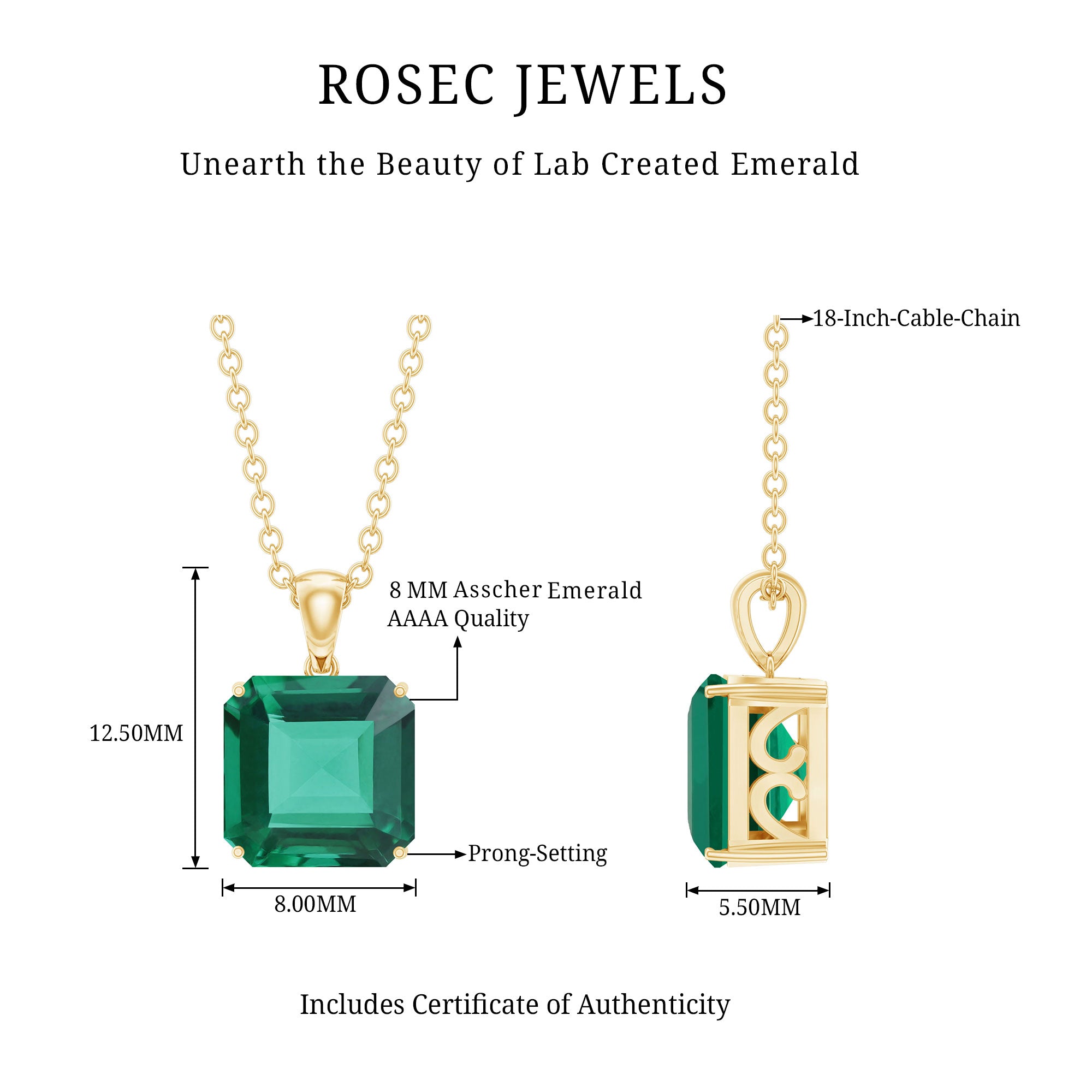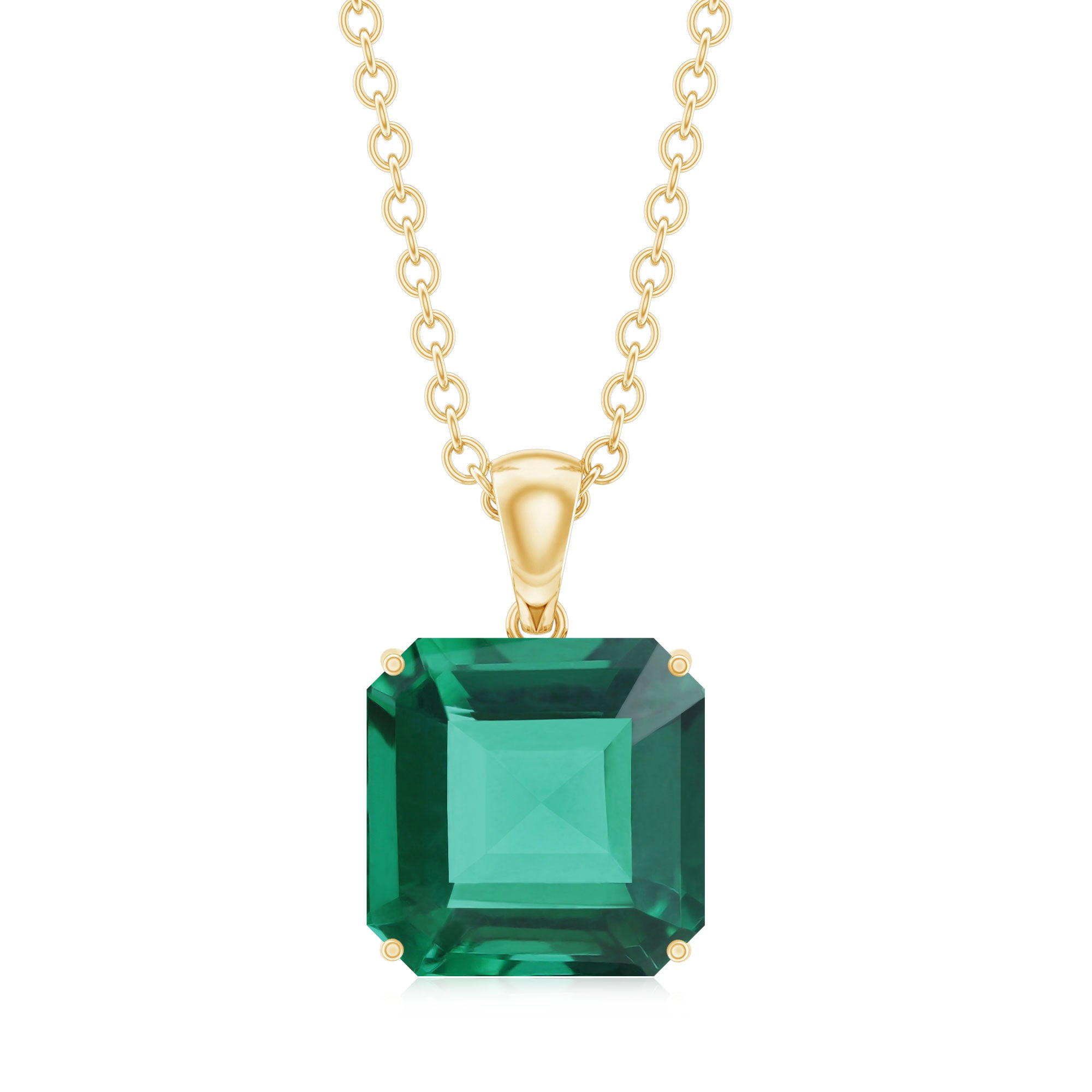 Turn heads and earn compliments with a touch of green that speaks volumes. This Lab Grown Emerald Necklace brings rich color and sparkle together in one elegant design. Set in 14k yellow gold plated silver, the Solitaire Pendant Necklace features a gorgeous 8 MM asscher cut lab created emerald that catches the light beautifully. Held in 4 prong setting, the bold green stone is the star of the show, simple, striking, and full of charm. The polished nail connects the emerald smoothly to a delicate yet durable chain that sits comfortably on your neck, making it perfect for everything from brunch dates to workdays to evening plans. It is one of those pieces that goes with literally anything. And the best part? Since the emerald is lab created, this Green Stone Necklace is an eco-friendly and ethical choice, so you can look good and feel good wearing it. Whether you are treating yourself or gifting someone special, this Asscher Cut Necklace is effortlessly stylish, lightweight, and timeless. It is a jewelry-box essential that you will reach for again and again. Plus, it comes in our signature box, ready for gifting or keeping.