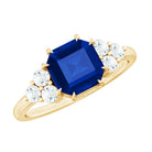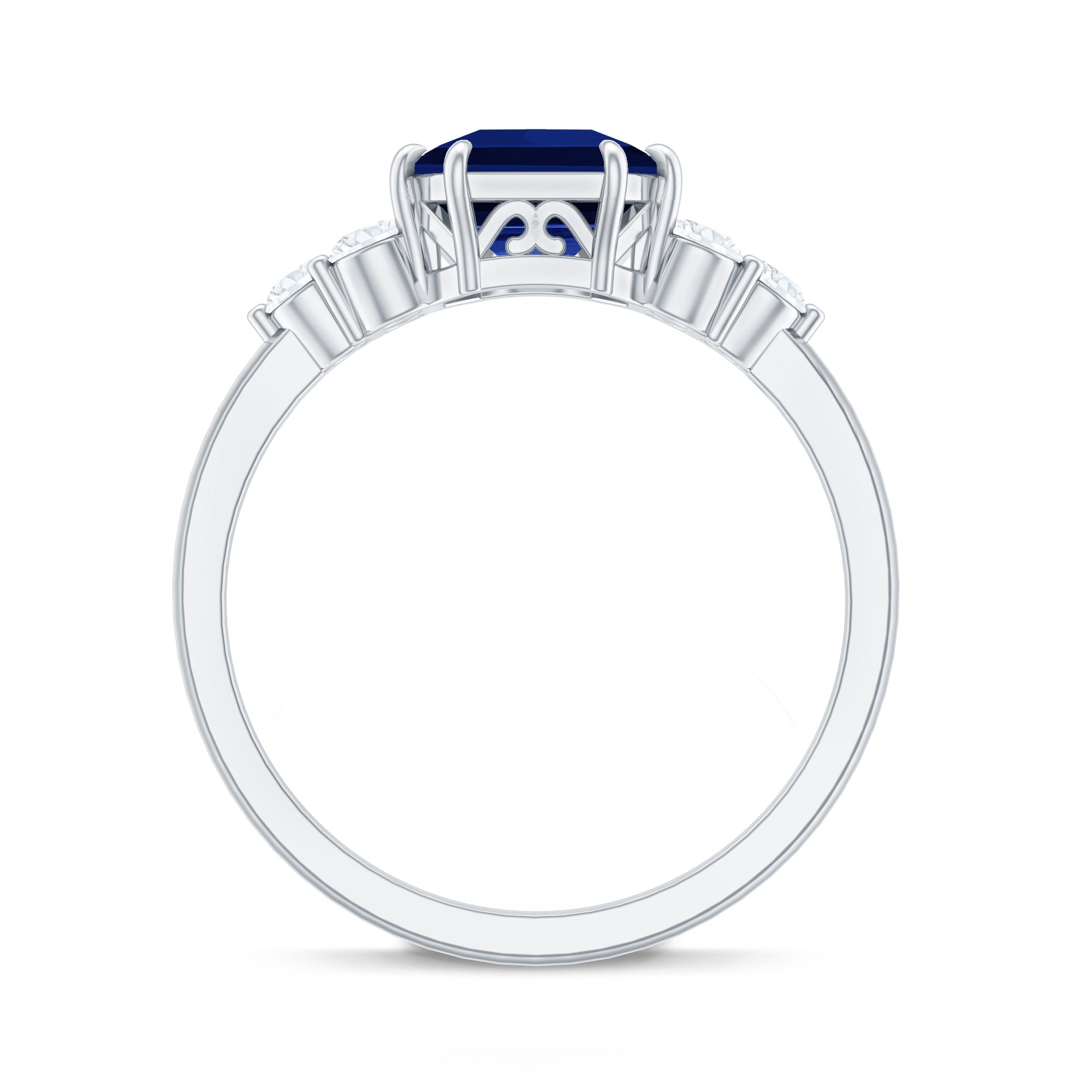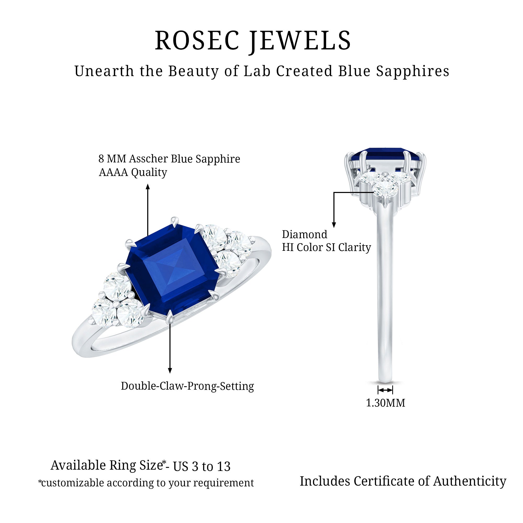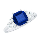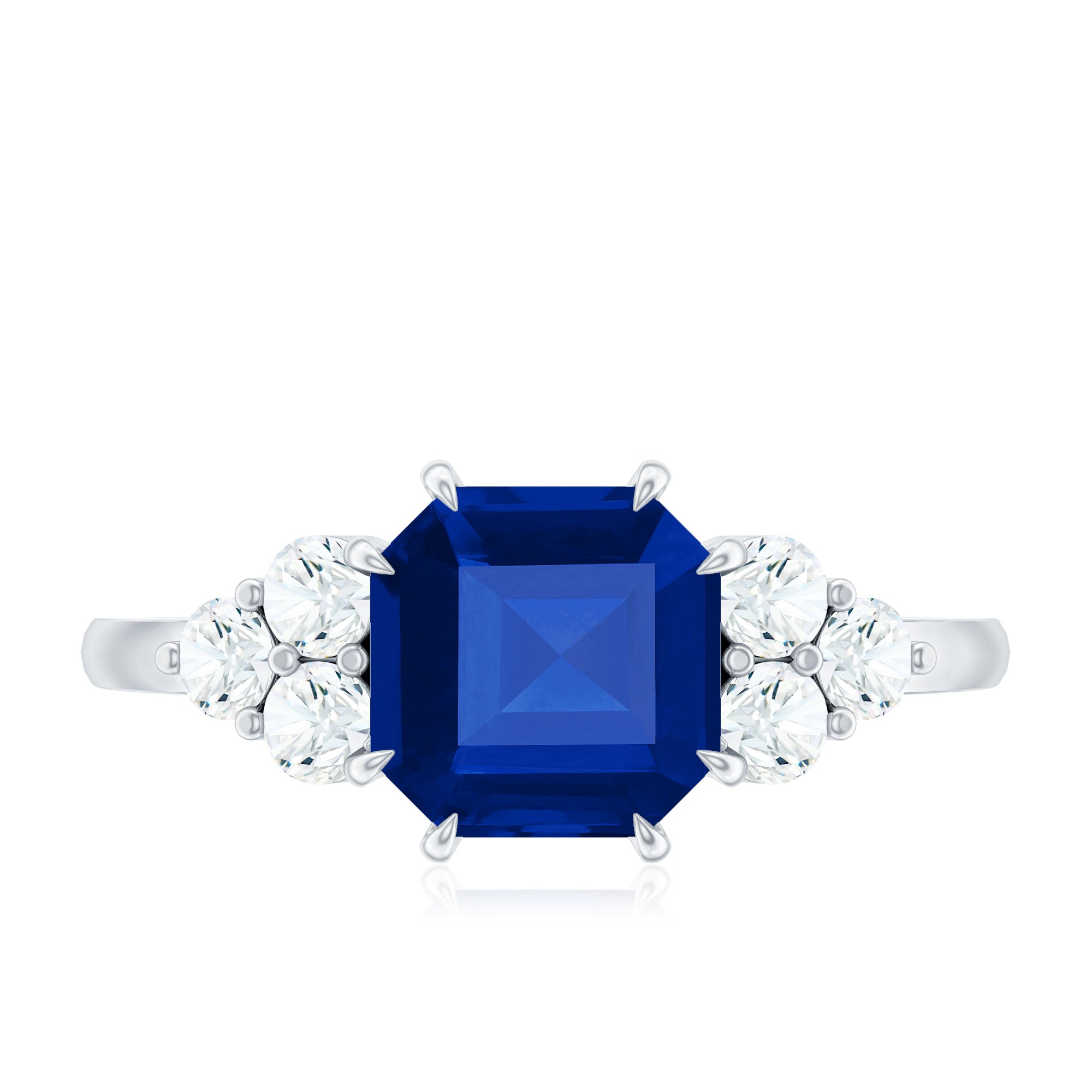 Asscher Cut Created Blue Sapphire Solitaire Engagement Ring with Diamond Trio