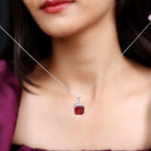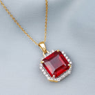 Elevate every look with the sparkling brilliance of our Lab Created Ruby Pendant. It features a 8 MM Asscher Cut Lab Grown Ruby elegantly placed in prong setting encircled by Round Shape Petite moissanite which creates a captivating halo frame, perfect for a striking look. Illuminate your fashion game with the charming allure of this July Birthstone Pendant. From casual wear to glamorous evening outfits, upgrade all your fits by wearing this Halo Pendant Necklace, designed to captivate your senses.