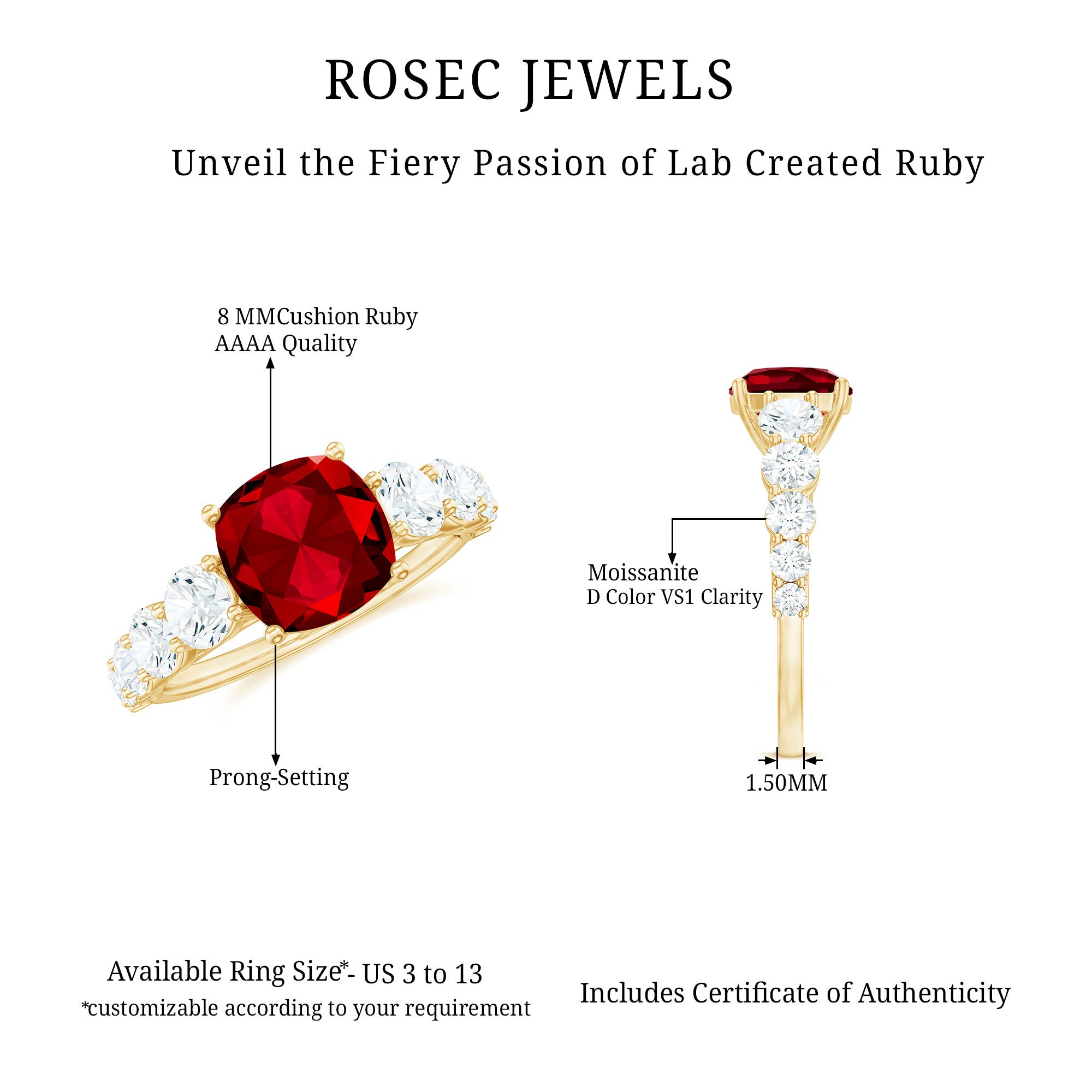 Make a bold fashion statement with this gorgeous created ruby solitaire ring, featuring an 8mm cushion-cut created ruby set as a solitaire with moissanite side stones. Crafted in solid gold, this ring exudes power and style with its vibrant red hue.