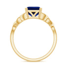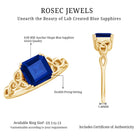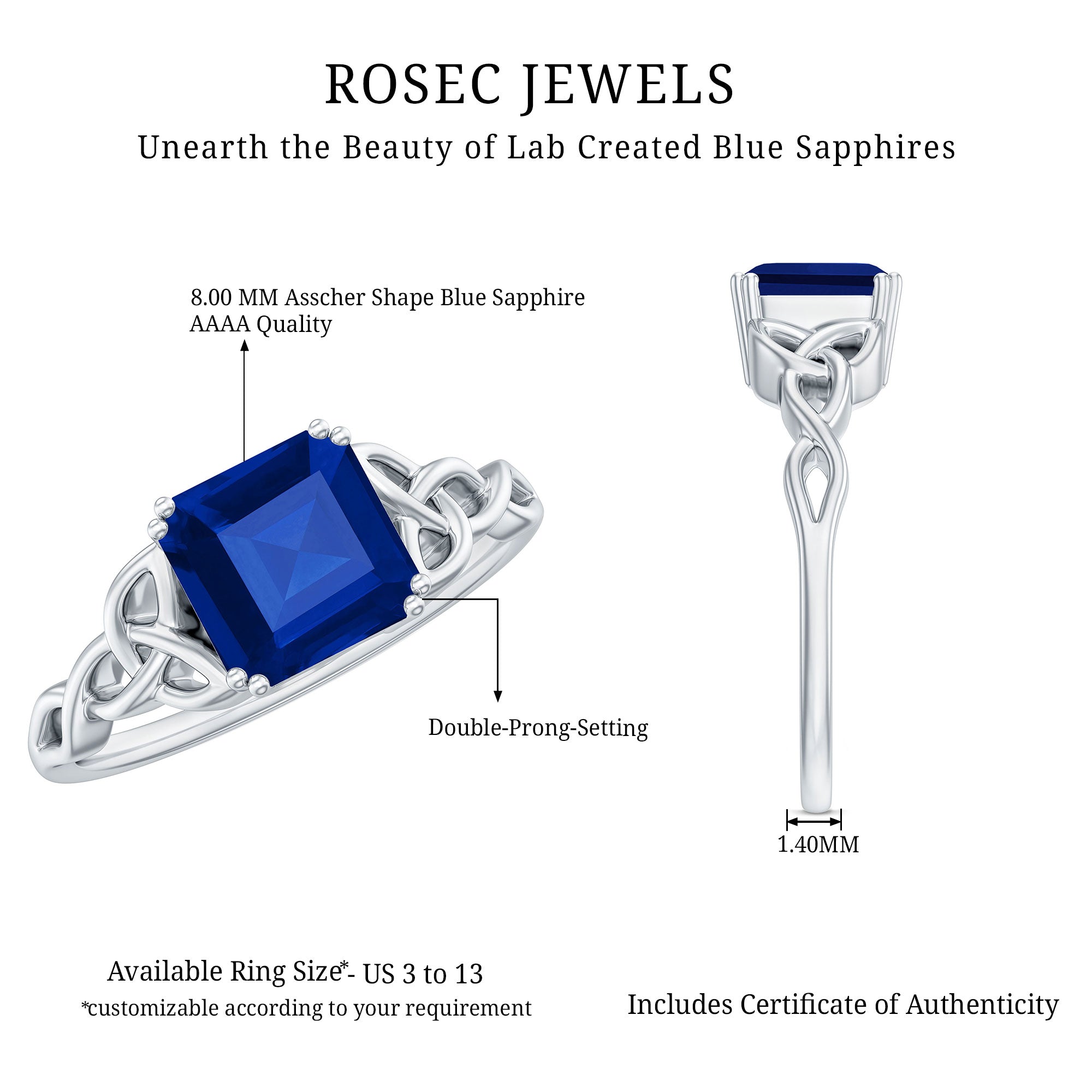 Embrace the subtle charm of this Created Blue Sapphire Ring. The Asscher Cut Created Blue Sapphire in a V Scroll Setting, adorned with Celtic Knot details on a Solitaire Ring, adds elegance to any outfit. Let your style shine with this sparkling Solitaire Created Blue Sapphire Celtic Ring.