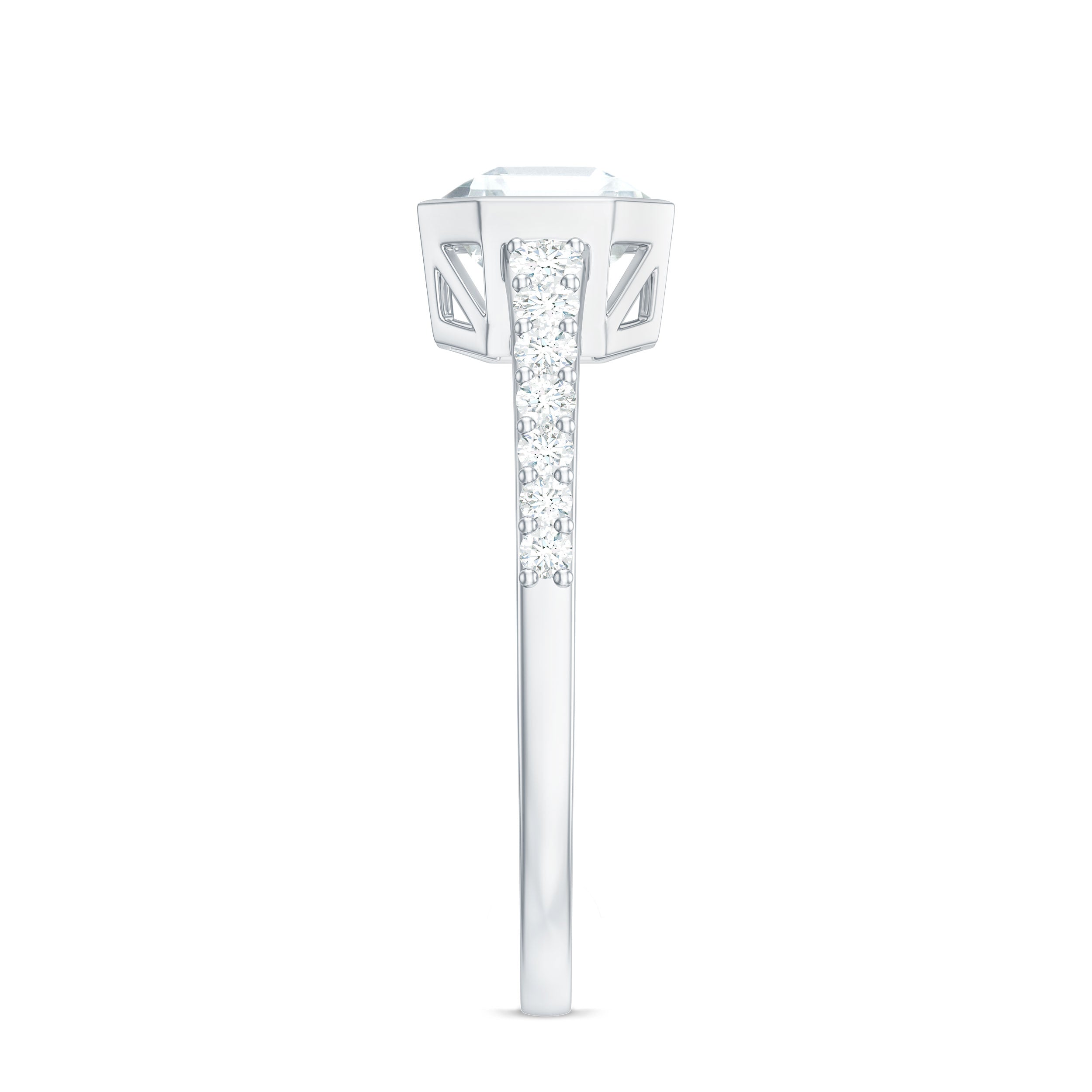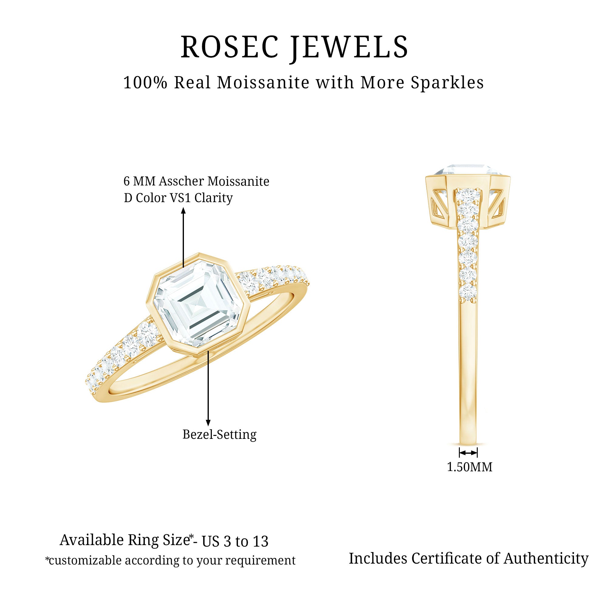 Make her feel truly cherished with our Asscher Cut Engagement Ring that captures the essence of your love. This elegant Moissanite Engagement Ring is designed to highlight both the beauty of the stone and the depth of your commitment, making it the perfect piece for your unforgettable proposal. At the center of the design is a 6 MM Asscher cut moissanite, set securely in bezel setting. With D color and VS1 clarity, this moissanite offers exceptional sparkle, clarity, and fire, all while being an ethical, sustainable choice. Adding a unique touch, the band is adorned with round cut moissanite side stones, arranged in a graduated pattern that naturally draws the eye toward the glowing center. The contrast between the bold central gem and the delicate side stones brings a perfect balance of simplicity and statement to the piece. This Moissanite Solitaire Ring combines classic charm with a fresh, contemporary edge. Its timeless shape and thoughtful details make it suitable for everyday wear or special occasions, while the clean lines and brilliance ensure it always stands out. Available in a wide range of US sizes, this 1 Carat Engagement Ring is designed for a comfortable and secure fit.