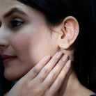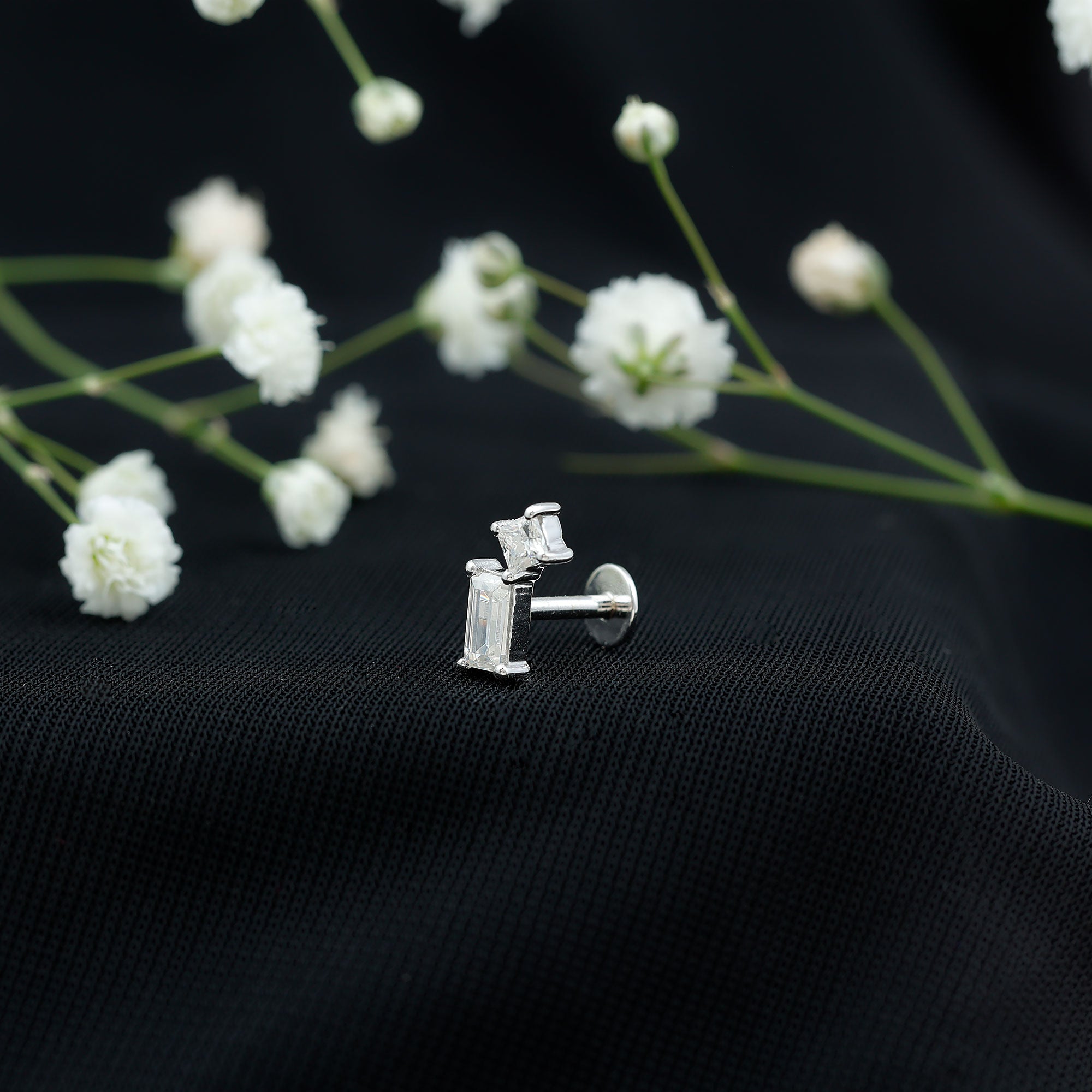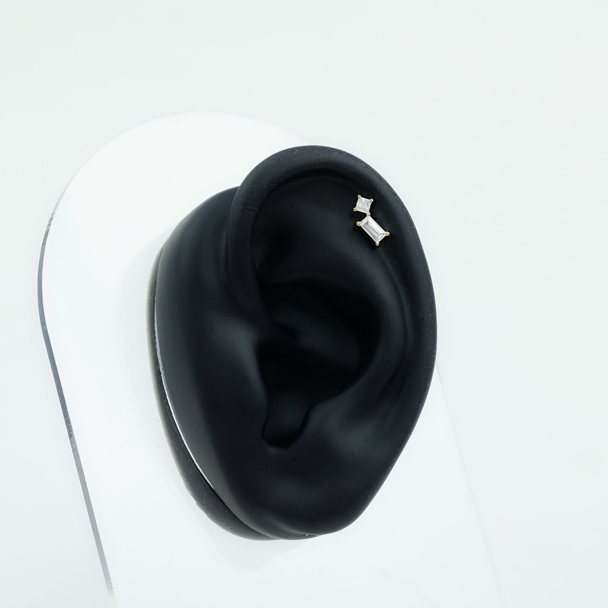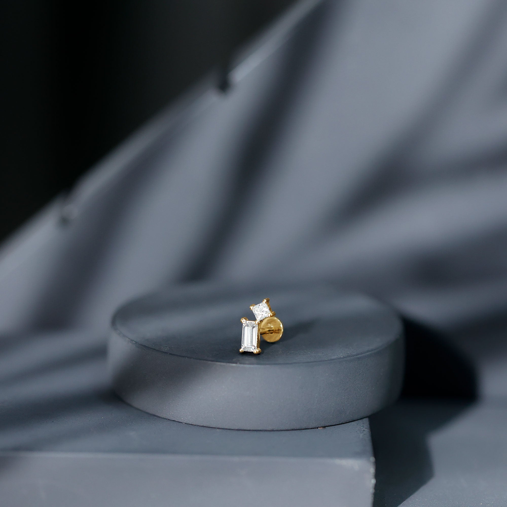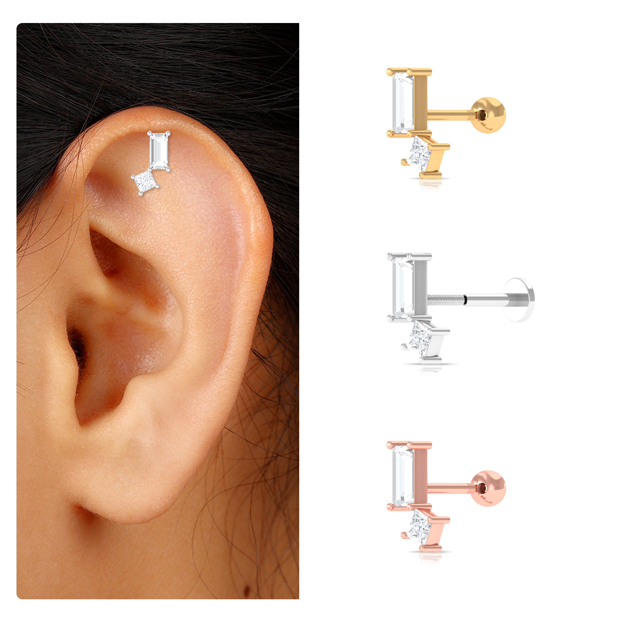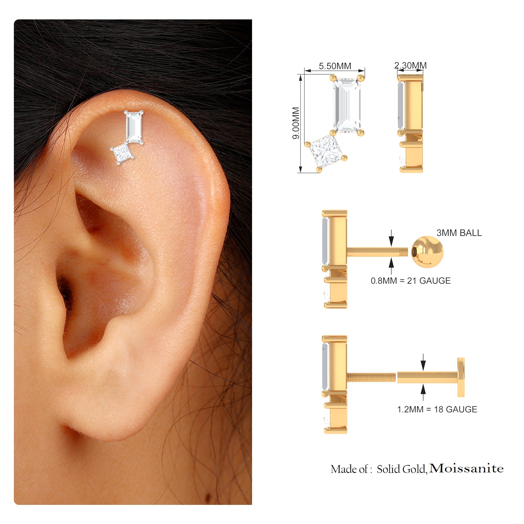 Add a touch of luxury to your look with our Moissanite Two Stone Cartilage Earring. Featuring Baguette and Princess Cut Moissanite in Prong Setting, set in Gold for a shiny appearance. This Moissanite Earring can be styled on your Helix, Conch, Cartilage, or Upper Lobe Piercing, with its Flat Back Closure keeping it securely in place.