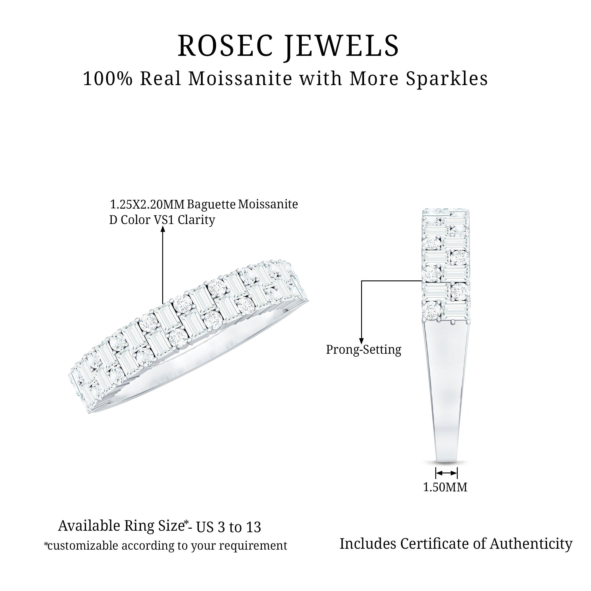 Baguette and Round Certified Moissanite Half Eternity Band Ring