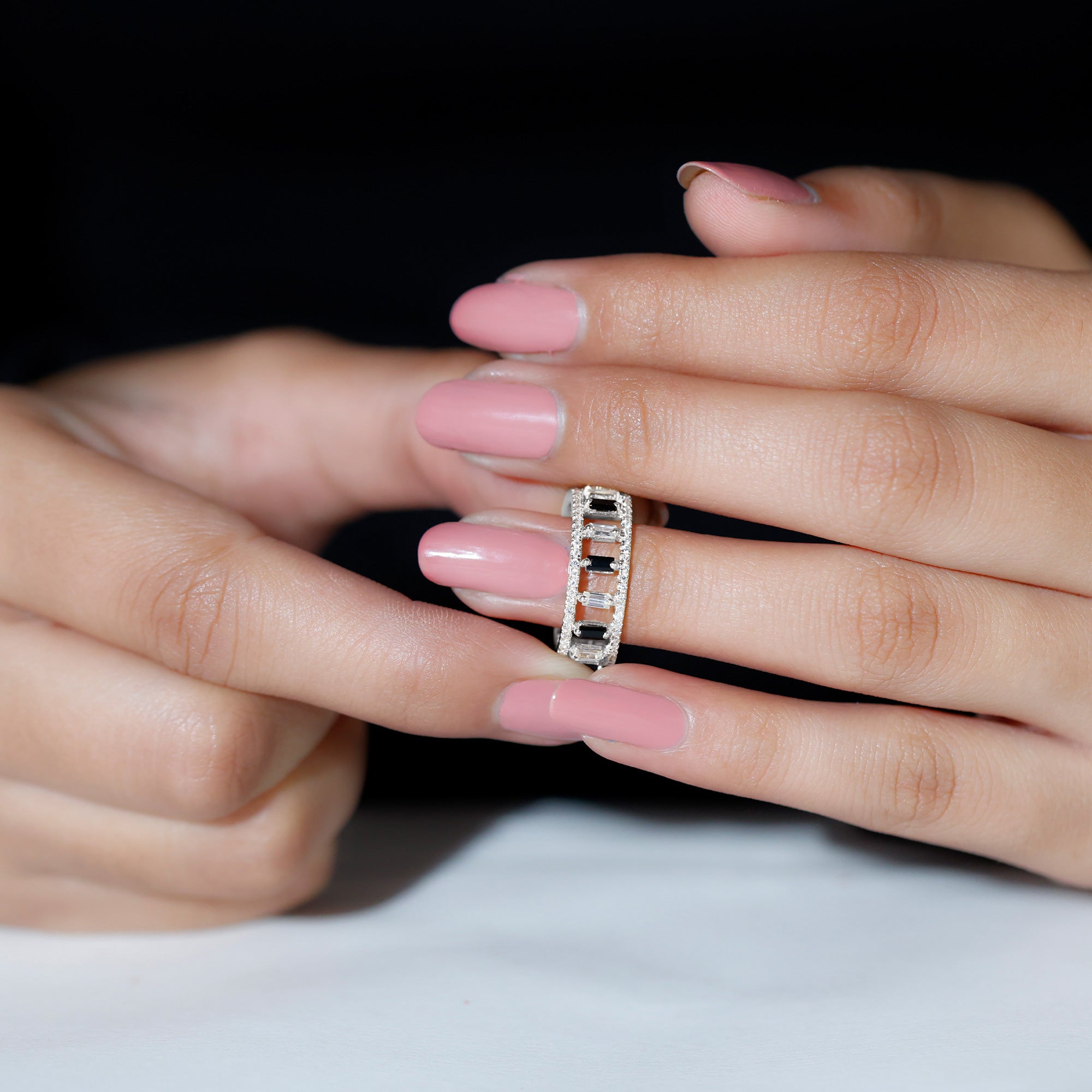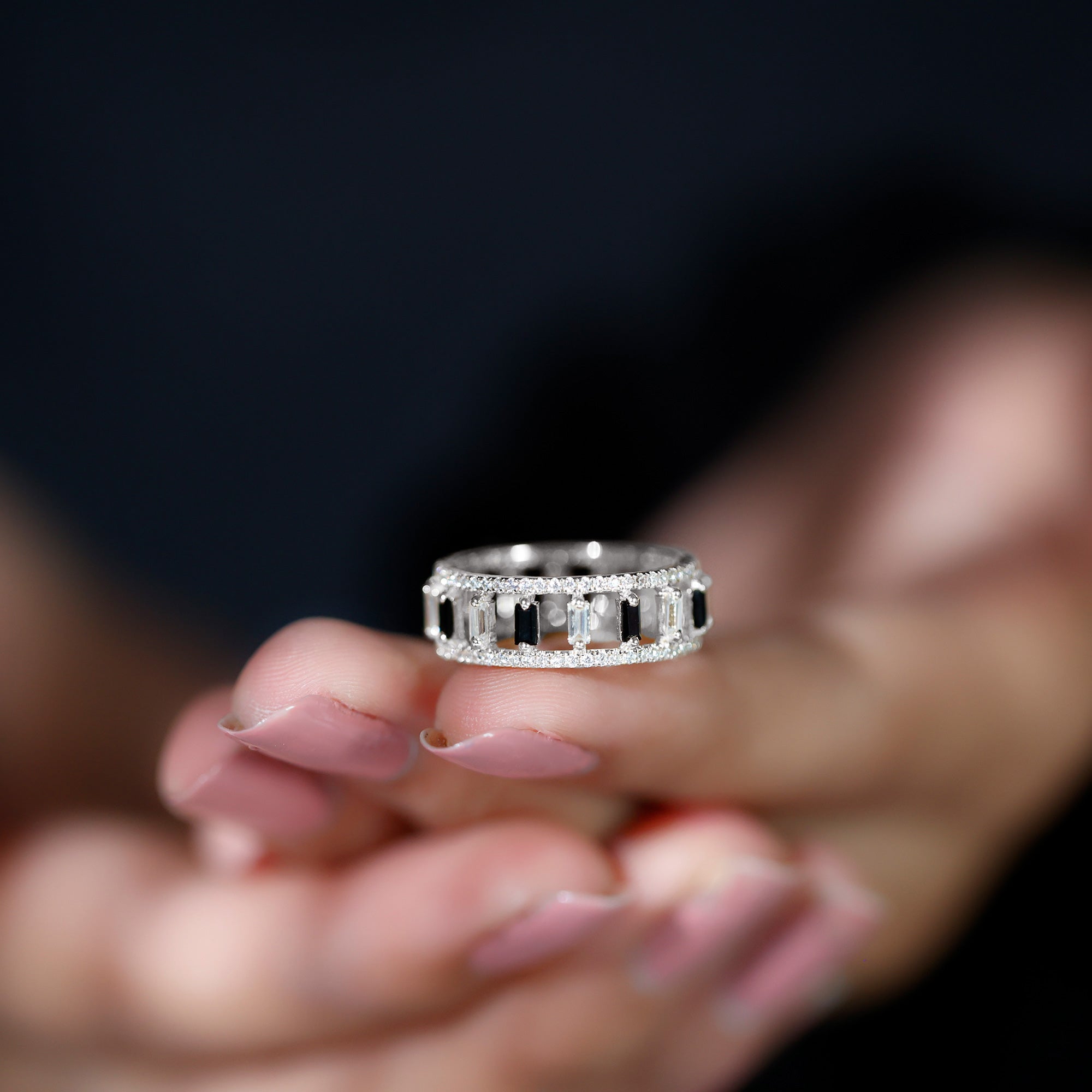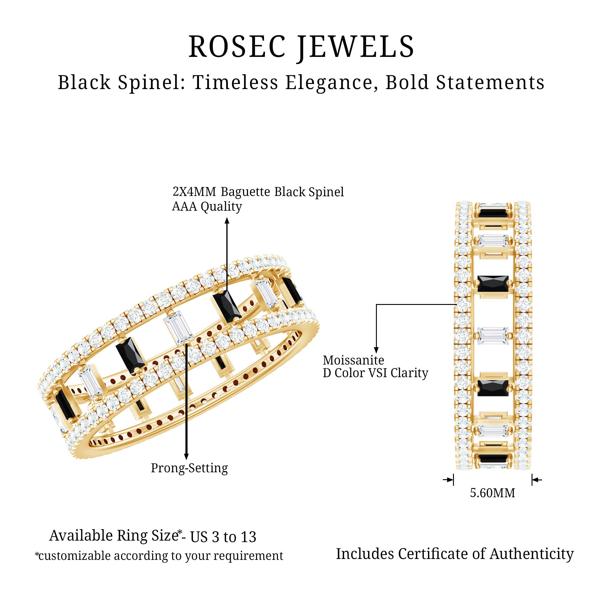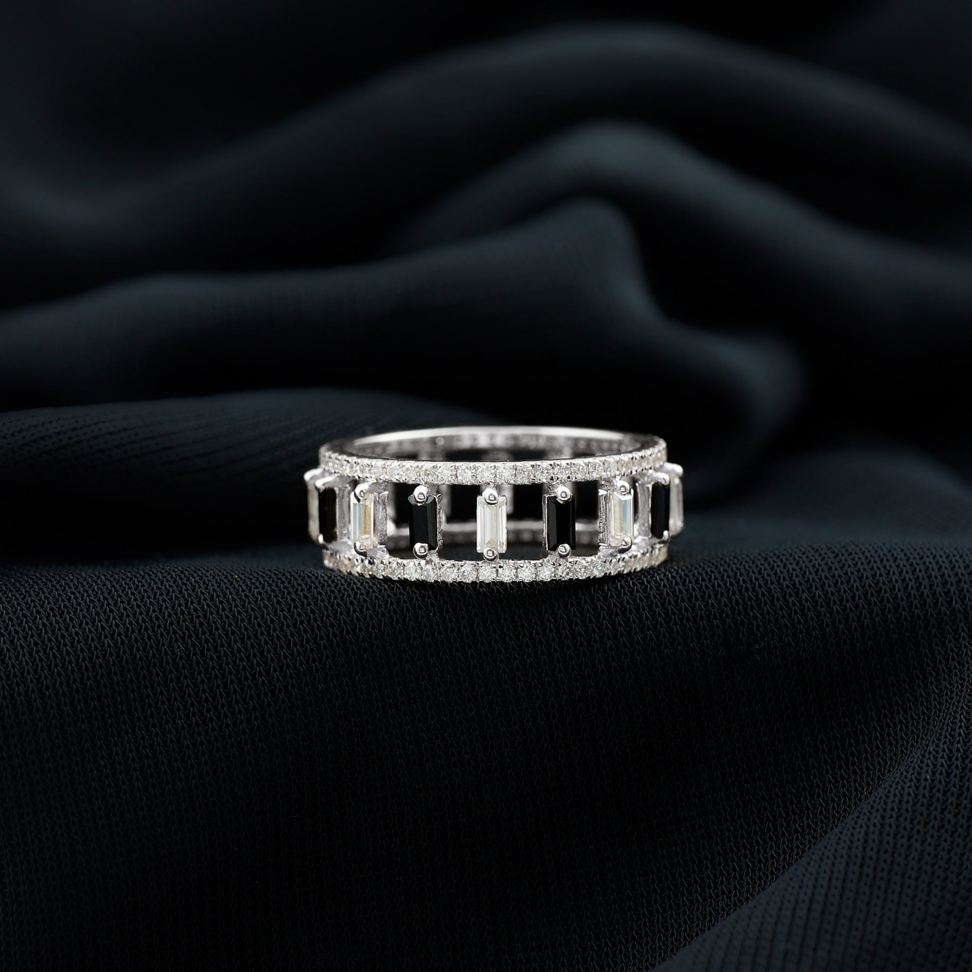 Discover the ideal of a perfect wedding band with our captivating Wedding Band. This eternity band features alternating Baguette Shape Black Spinel and Moissanite stones, creating a striking and harmonious contrast. Our skilled artisans have elevated the allure of this design by adding Round-Cut Moissanite accents, making it a symbol of everlasting elegance and style.