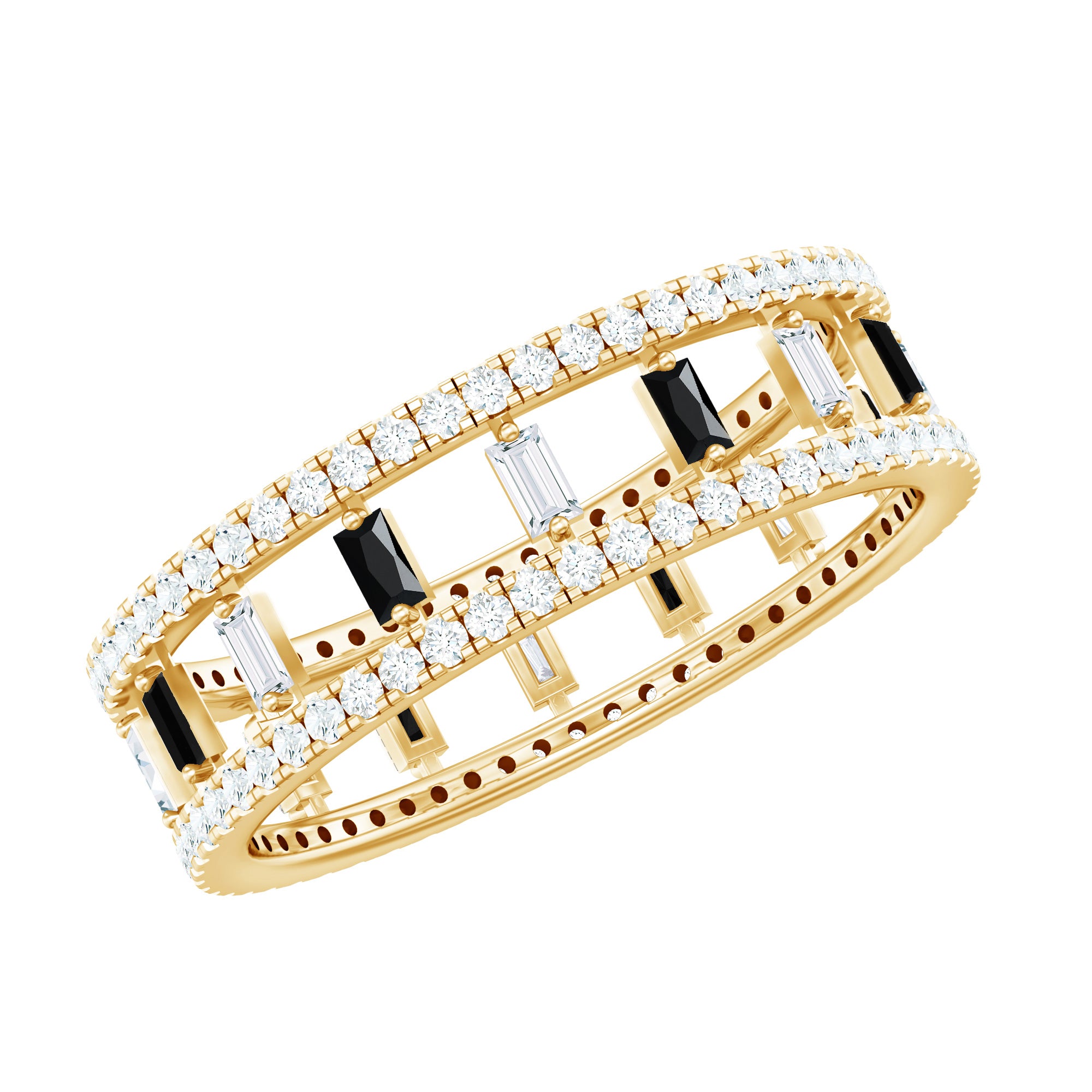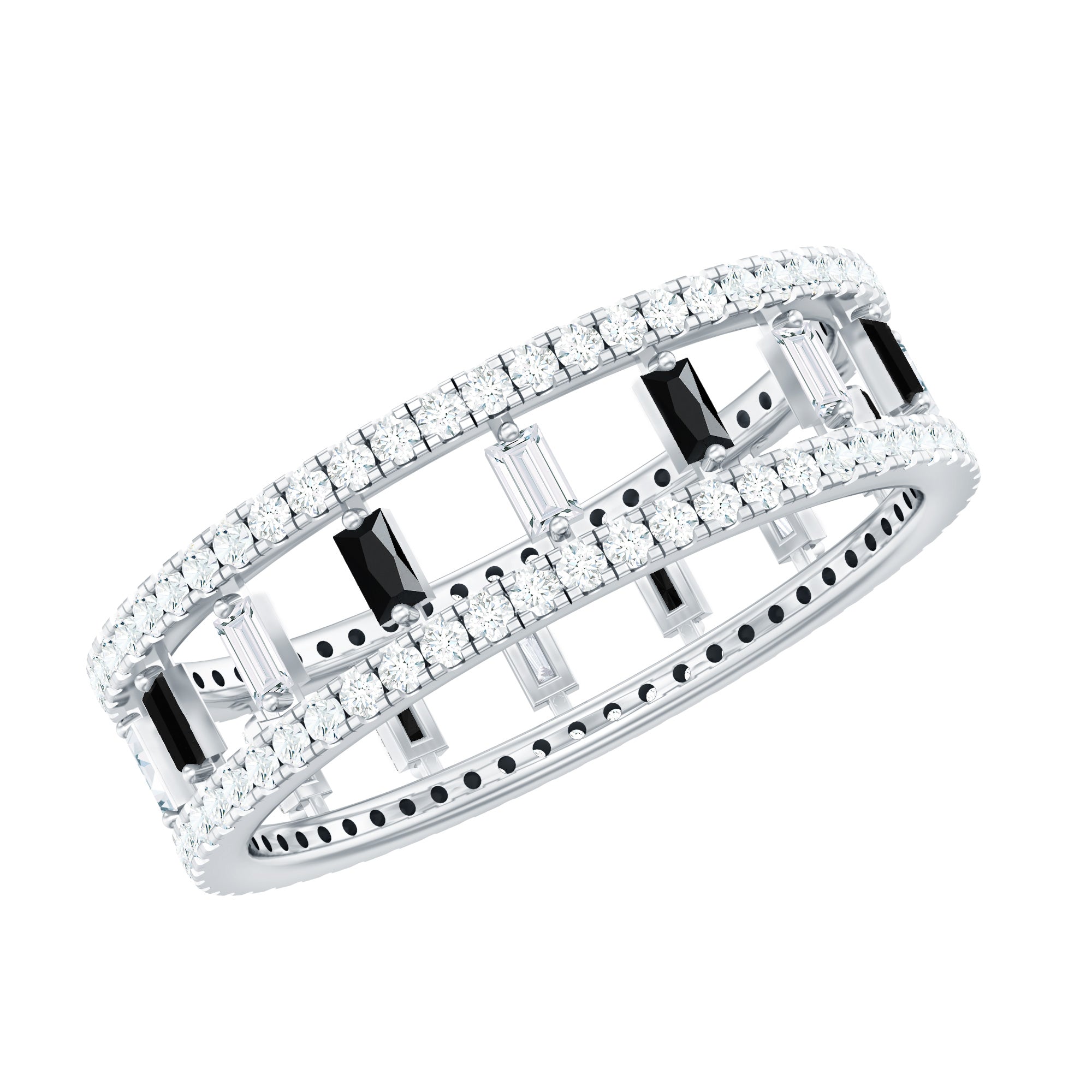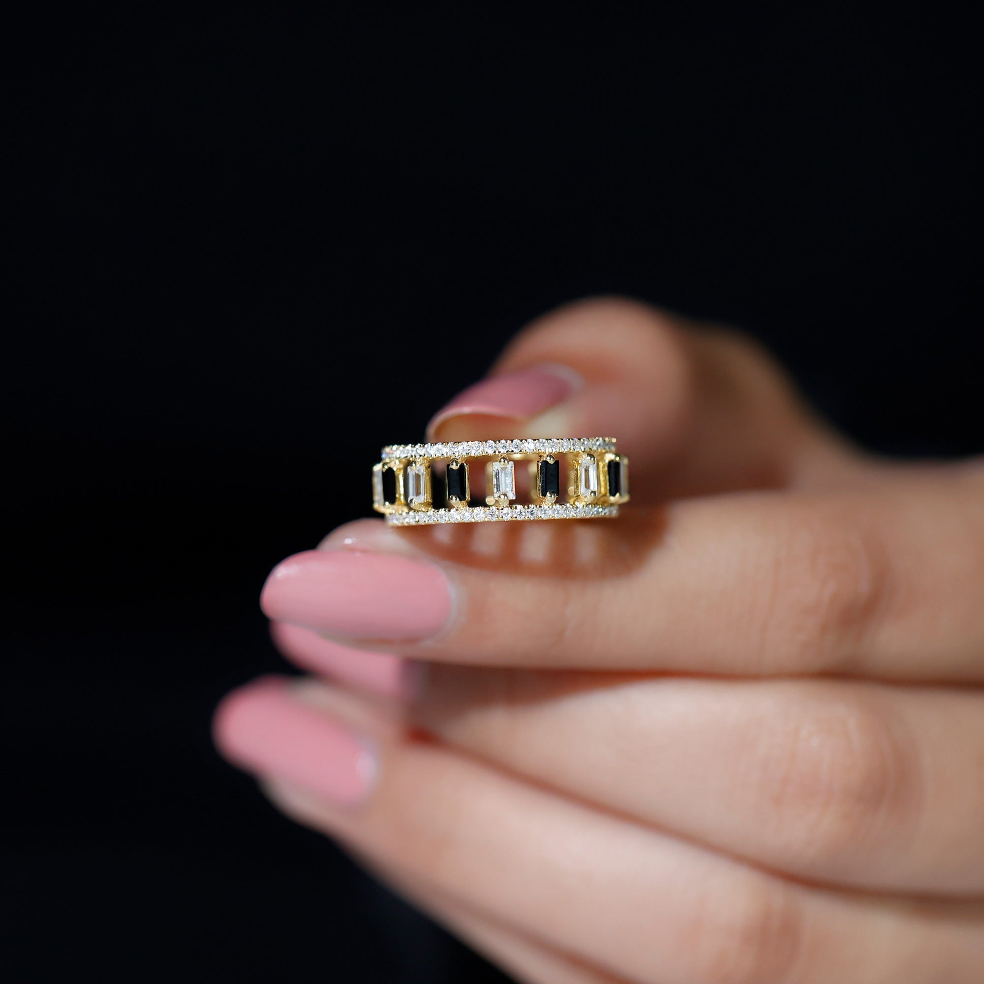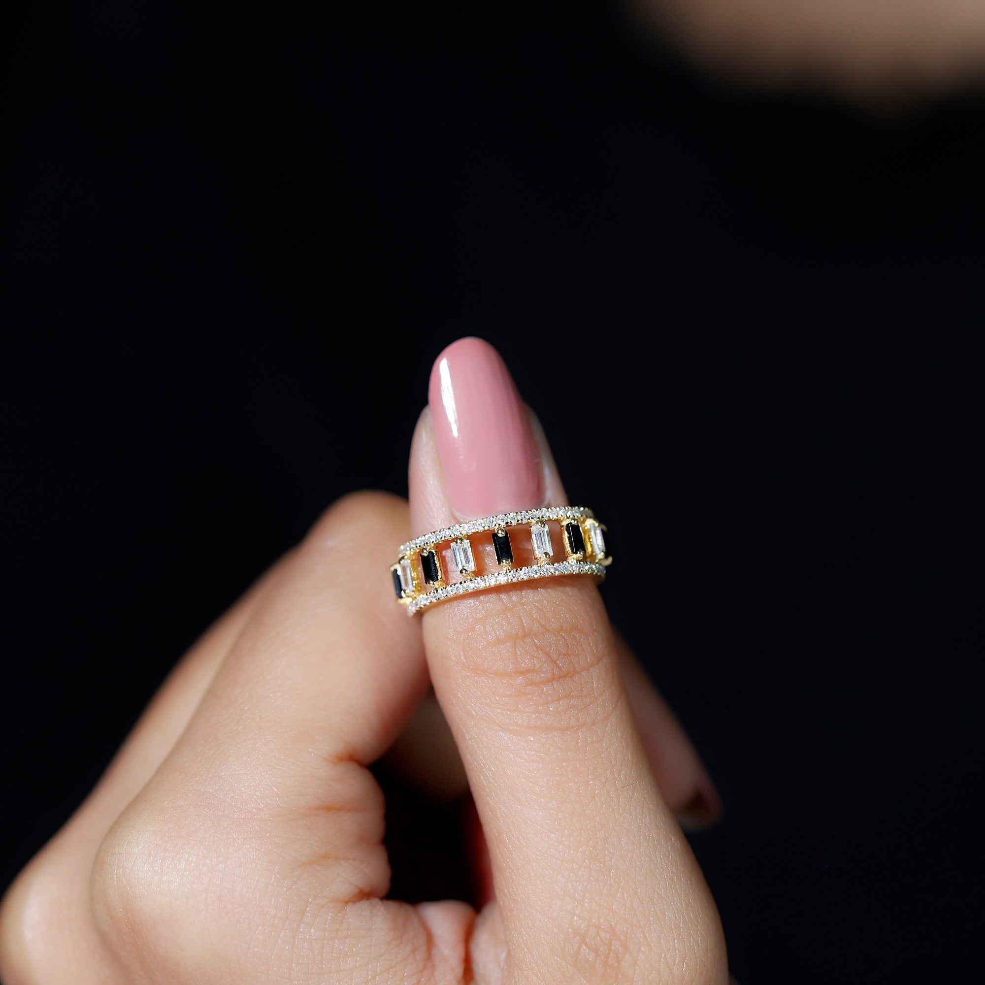 Discover the ideal of a perfect wedding band with our captivating Wedding Band. This eternity band features alternating Baguette Shape Black Spinel and Moissanite stones, creating a striking and harmonious contrast. Our skilled artisans have elevated the allure of this design by adding Round-Cut Moissanite accents, making it a symbol of everlasting elegance and style.