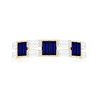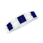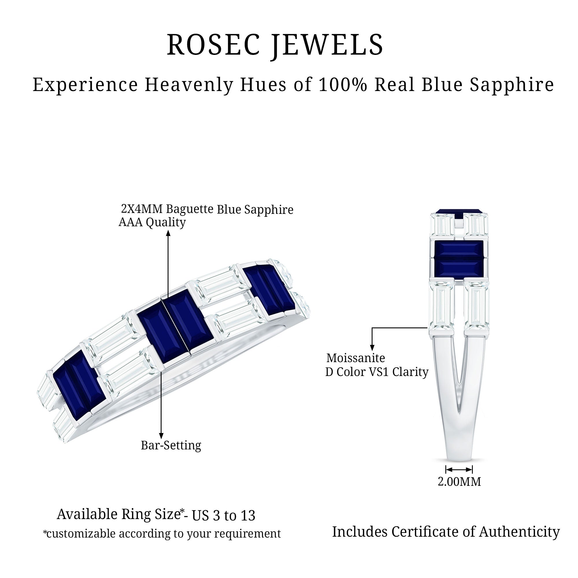 This Blue Sapphire Band Ring is a stunning gemstone jewelry. Adorned with Baguette Cut Blue Sapphire in Bar Setting and Moissanite on Half Eternity Band.