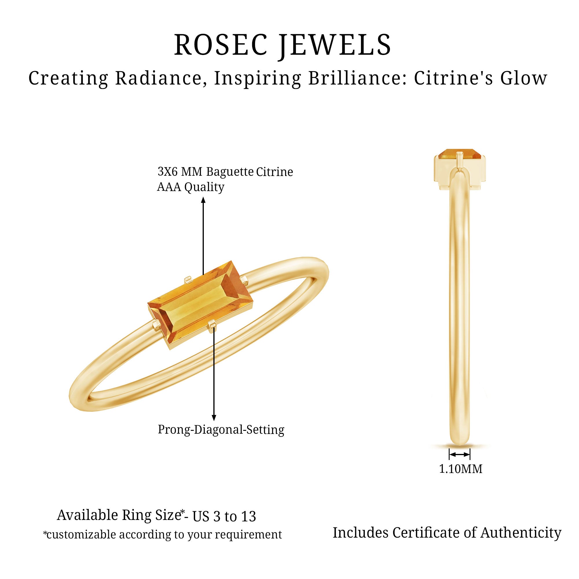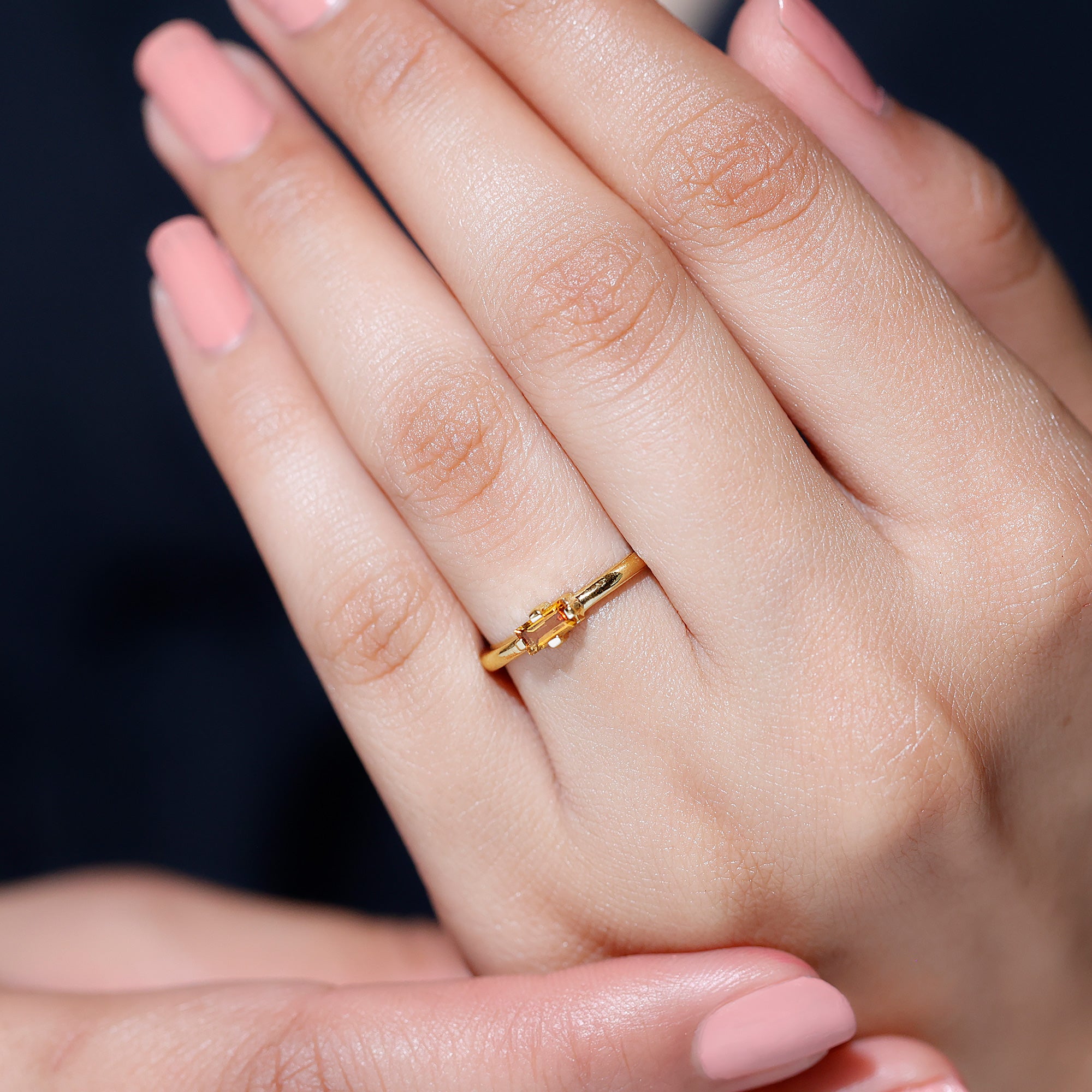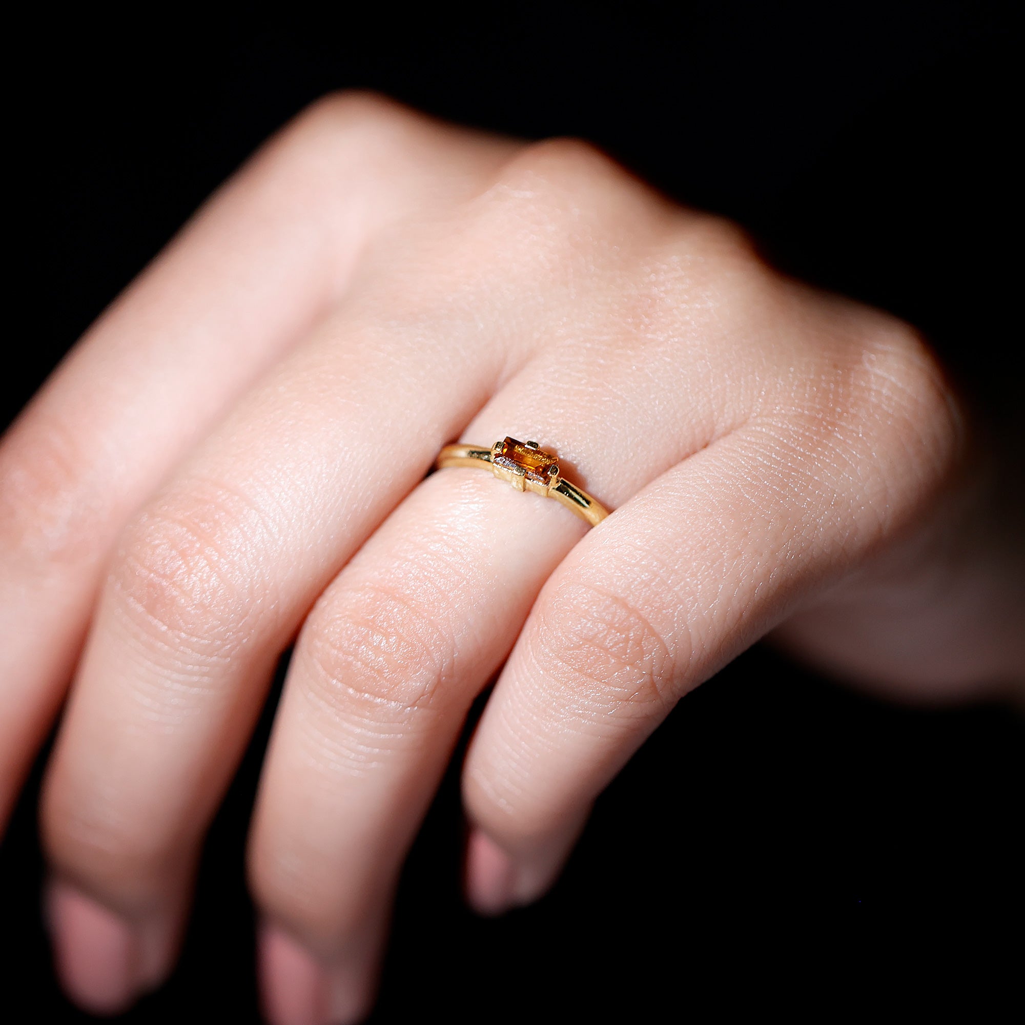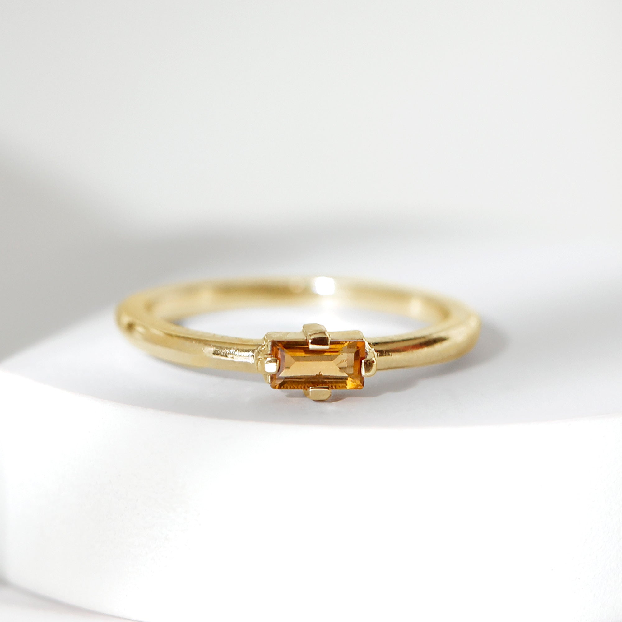 Experience the warm embrace of the Minimal Birthstone Promise Ring. This exquisite piece marries contemporary elegance with timeless significance, featuring a Baguette Shape Citrine set horizontally in 4 Prong Diagonal Setting. A symbol of promise and positivity, this ring is a chic and meaningful adornment.