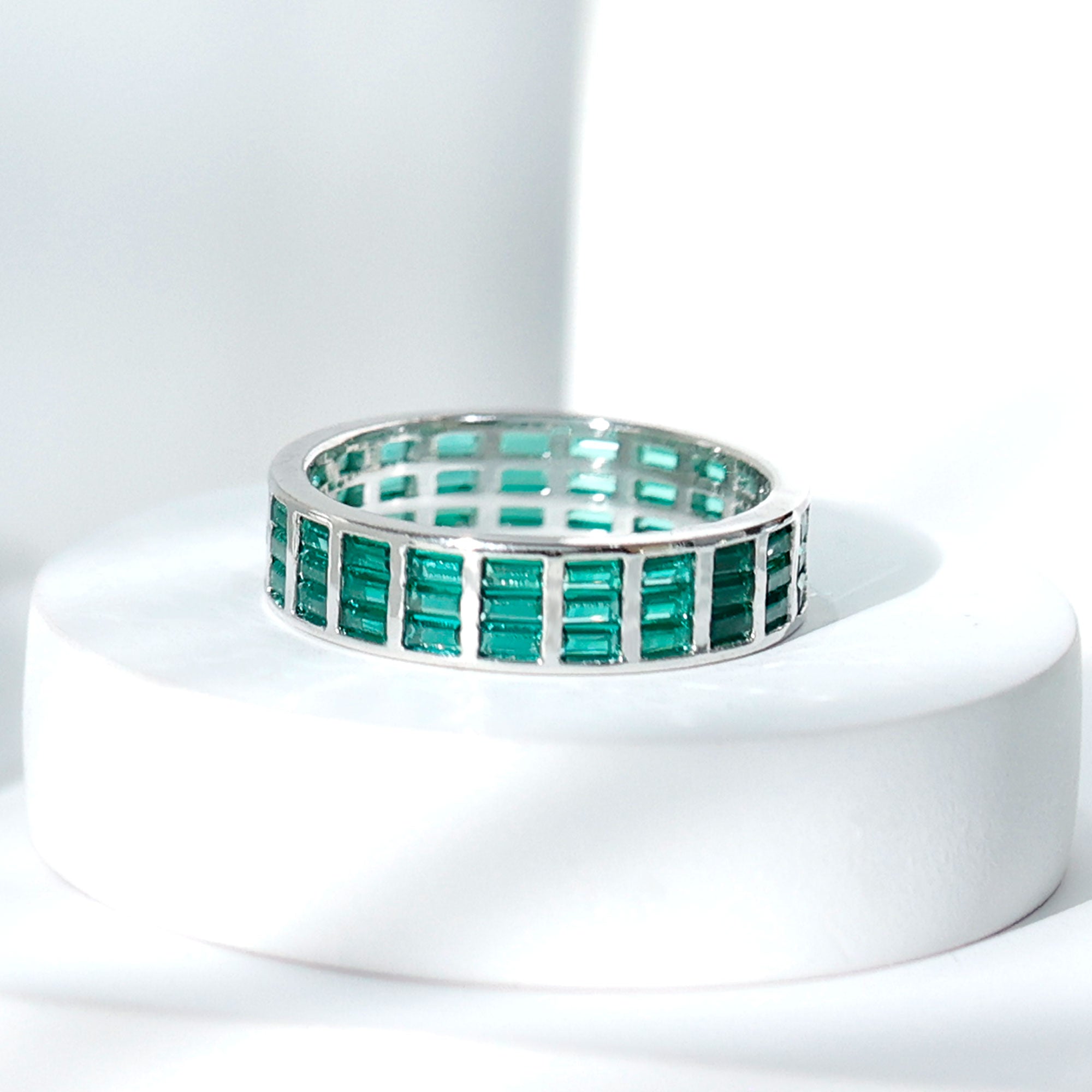 Baguette Cut Lab Grown Emerald 3 Row Eternity Band