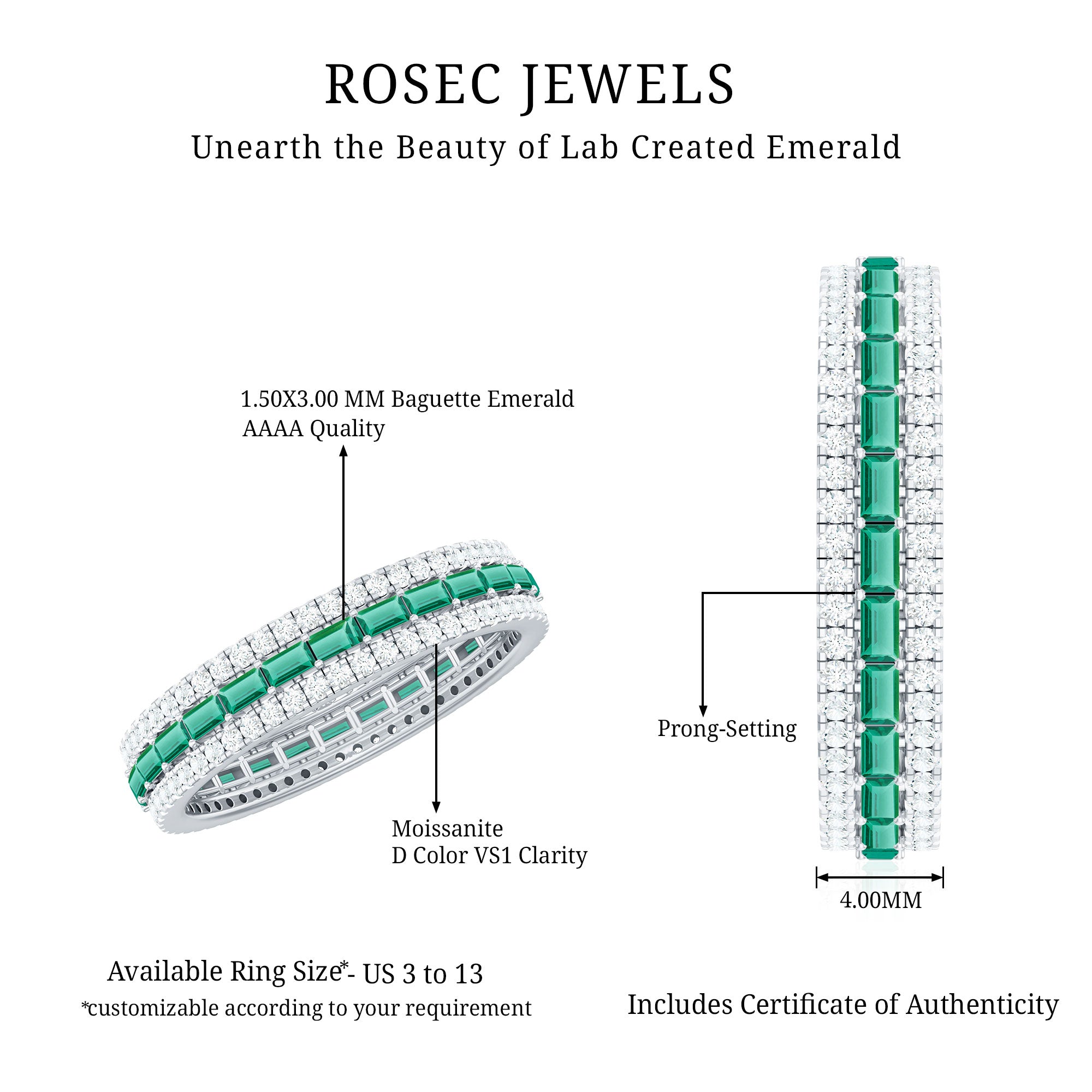 Experience the captivating allure of this exceptional Wedding Band Ring. This remarkable ring highlights a striking row of baguette cut Lab Created Emerald elegantly set in an East-West style in the center with a secure Prong Setting. It is further adorned with two rows of Moissanite stones set on both sides of the band, creating a unique and irresistible charm. The combination of AAAA quality lab grown emeralds and D-VS1 quality moissanites gives the Three Row Eternity Band a magical touch, making it a special piece for any woman who wants to add color and sophistication to her style. The design is elegant yet classic, making it suitable for everyday wear or special occasions. It is a great choice as a wedding band or an anniversary gift, something that will always remind you of your cherished moments together. Made with care to last, this Emerald Wedding Band is a symbol of commitment and beauty.