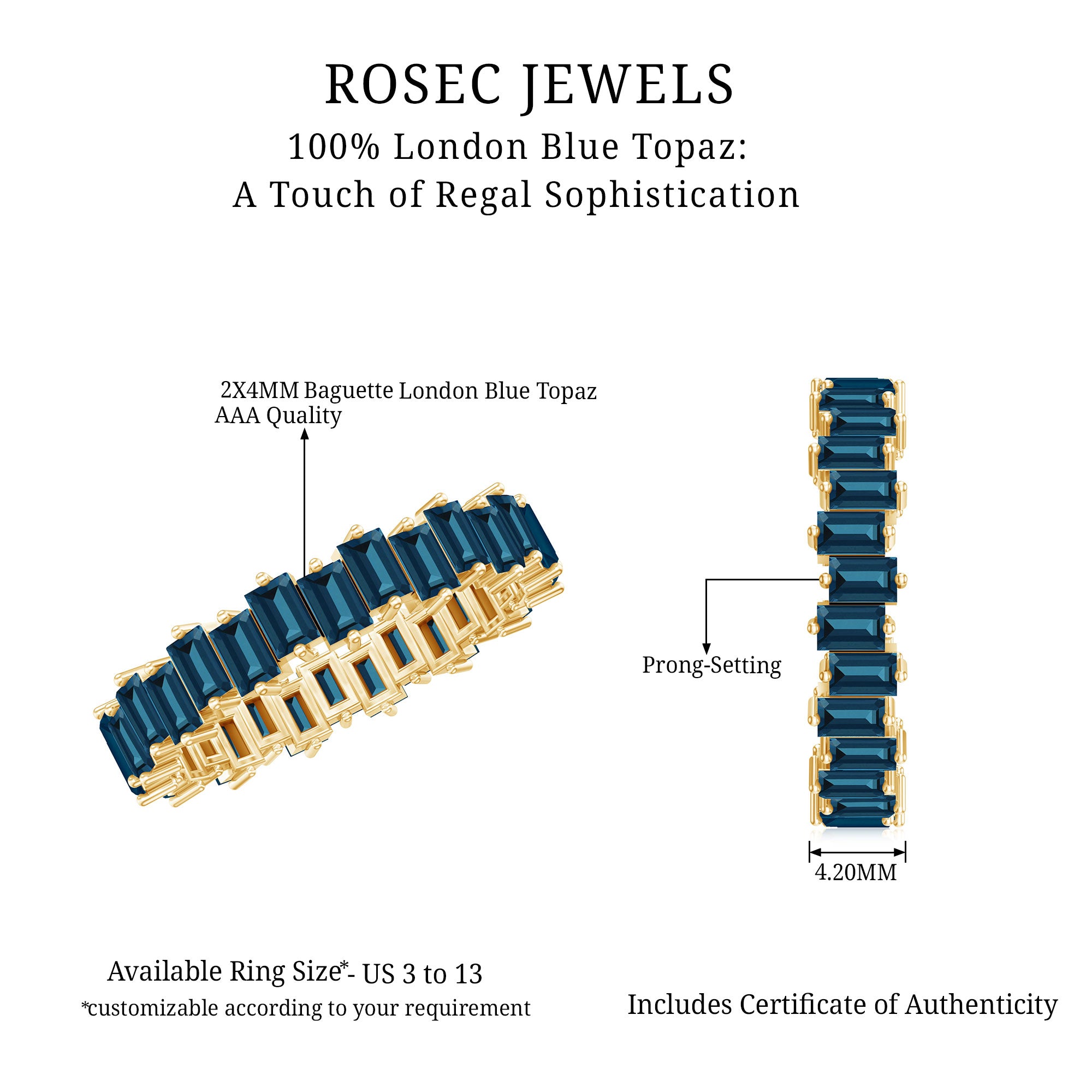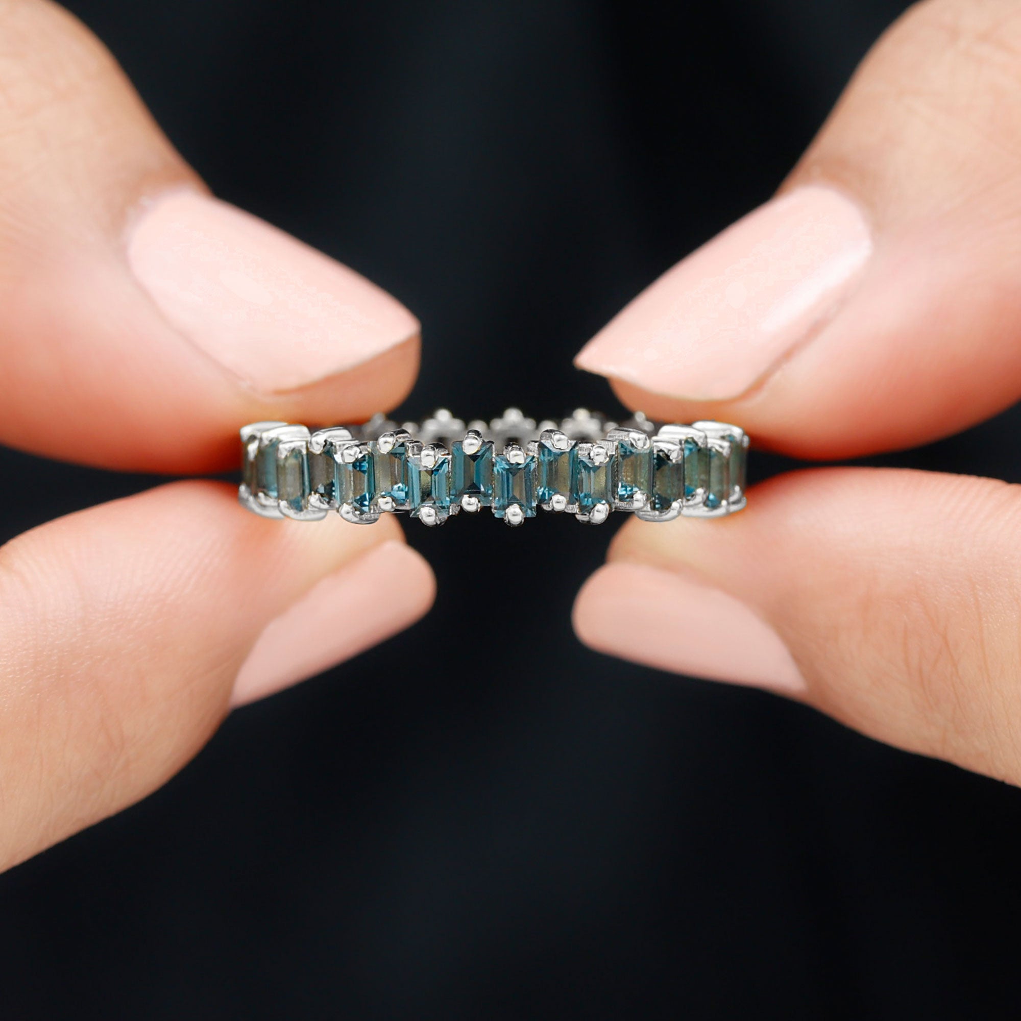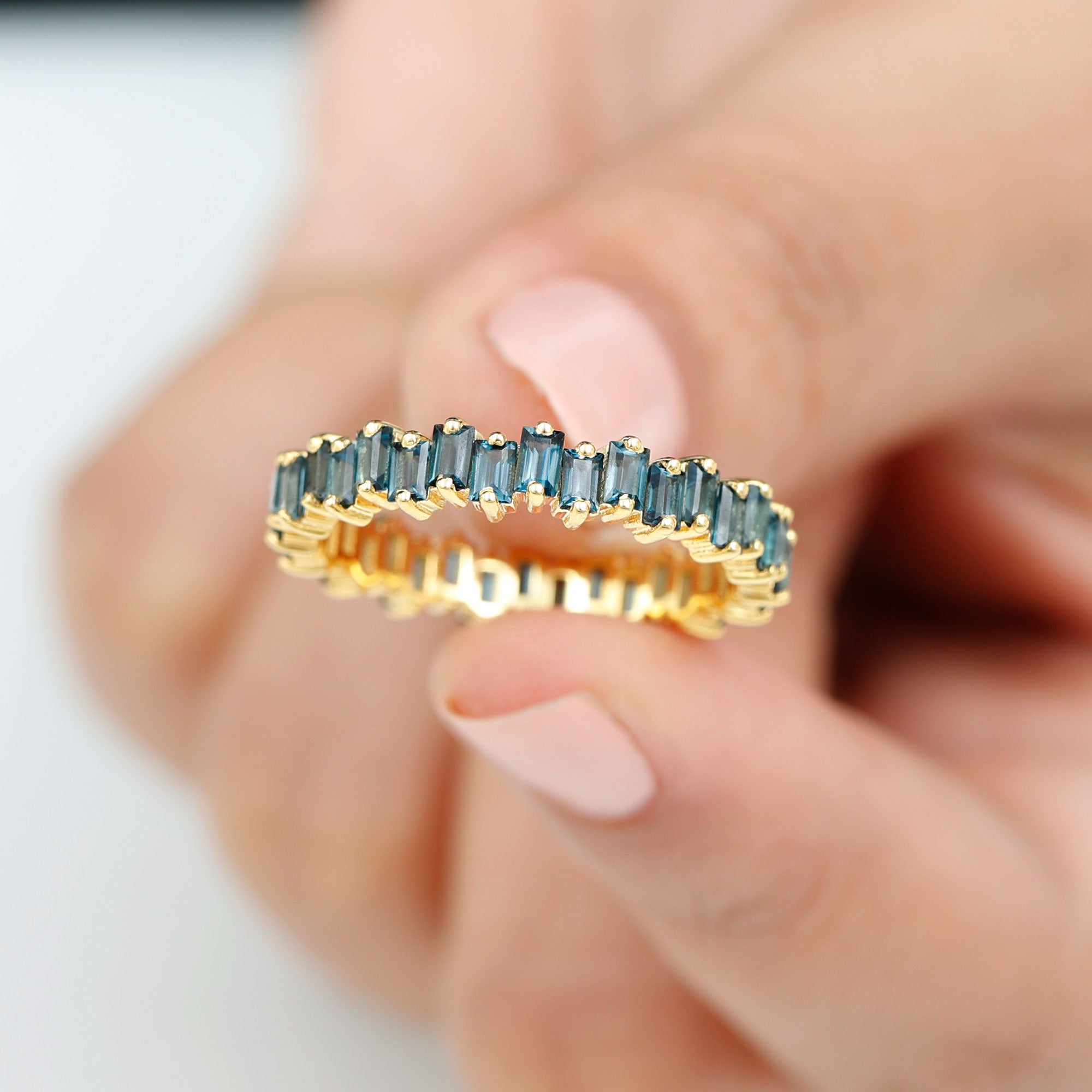 This Blue Topaz Band Ring features a continuous line of gemstones that represents everlasting love. It radiates elegance with its uneven Baguette London Blue Topaz in a 2 Prong Setting, creating an eternity pattern. With an abundance of sparkle, this Eternity Band Ring exudes opulence and a feminine charm. Symbolizing the infinite circle of love, this Wedding Band Ring introduces a vibrant touch to any ring stack. The Natural London Blue Topaz beautifully complements other wedding bands or an engagement ring. Representing love and affection, this Blue Topaz Wedding Ring showcases impeccable attention to detail. Shine and sparkle with this Blue Topaz Eternity Ring, which possesses an iridescent gleam. This London Blue Topaz Ring creates a captivating effect, featuring AAA Quality, ensuring that the gemstones are certified and have undergone a quality check. This piece is offered in various metal choices, allowing you to align it with your individual style. It is available in ring sizes ranging from US 3 to 13, facilitating the search for the ideal fit. You can wear it alongside your engagement ring, combine it with other bands, or let it stand out on its own. Regardless of how you choose to wear it, this Zig Zag Eternity Ring adds elegance, simplicity, and significance to your daily appearance. Additionally, it serves as a considerate gift for a loved one or a delightful indulgence for yourself.