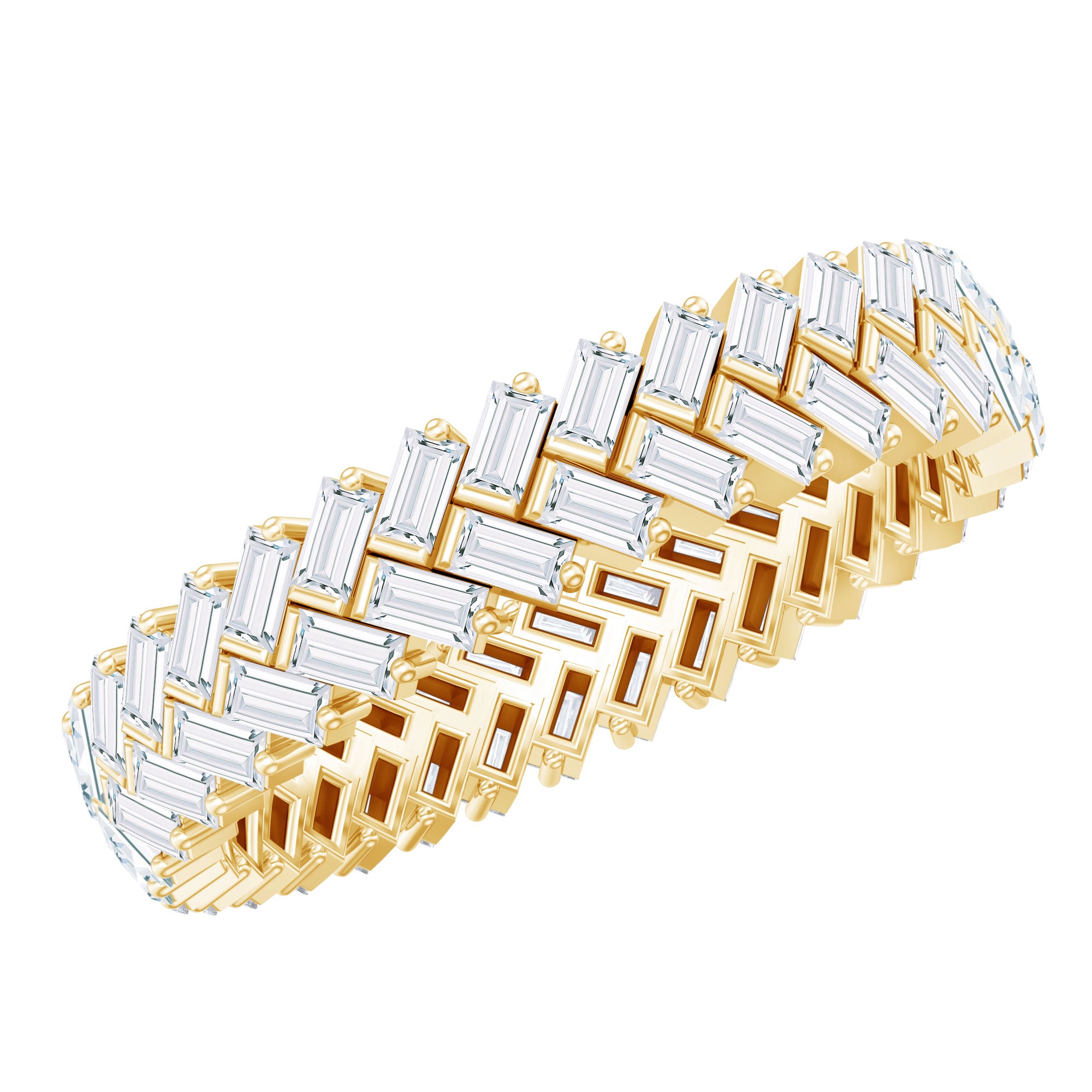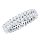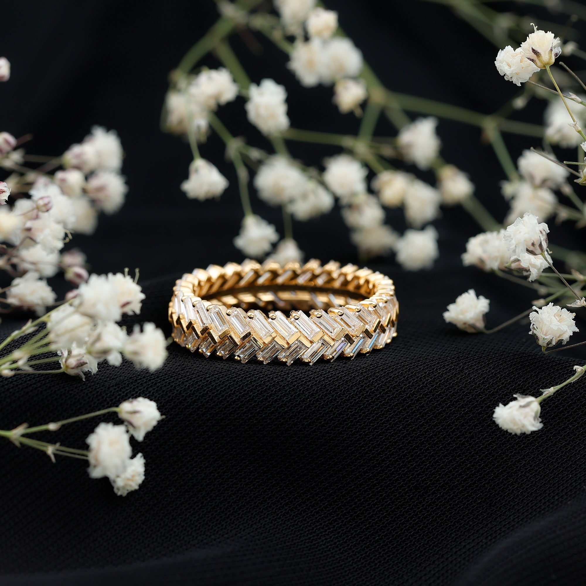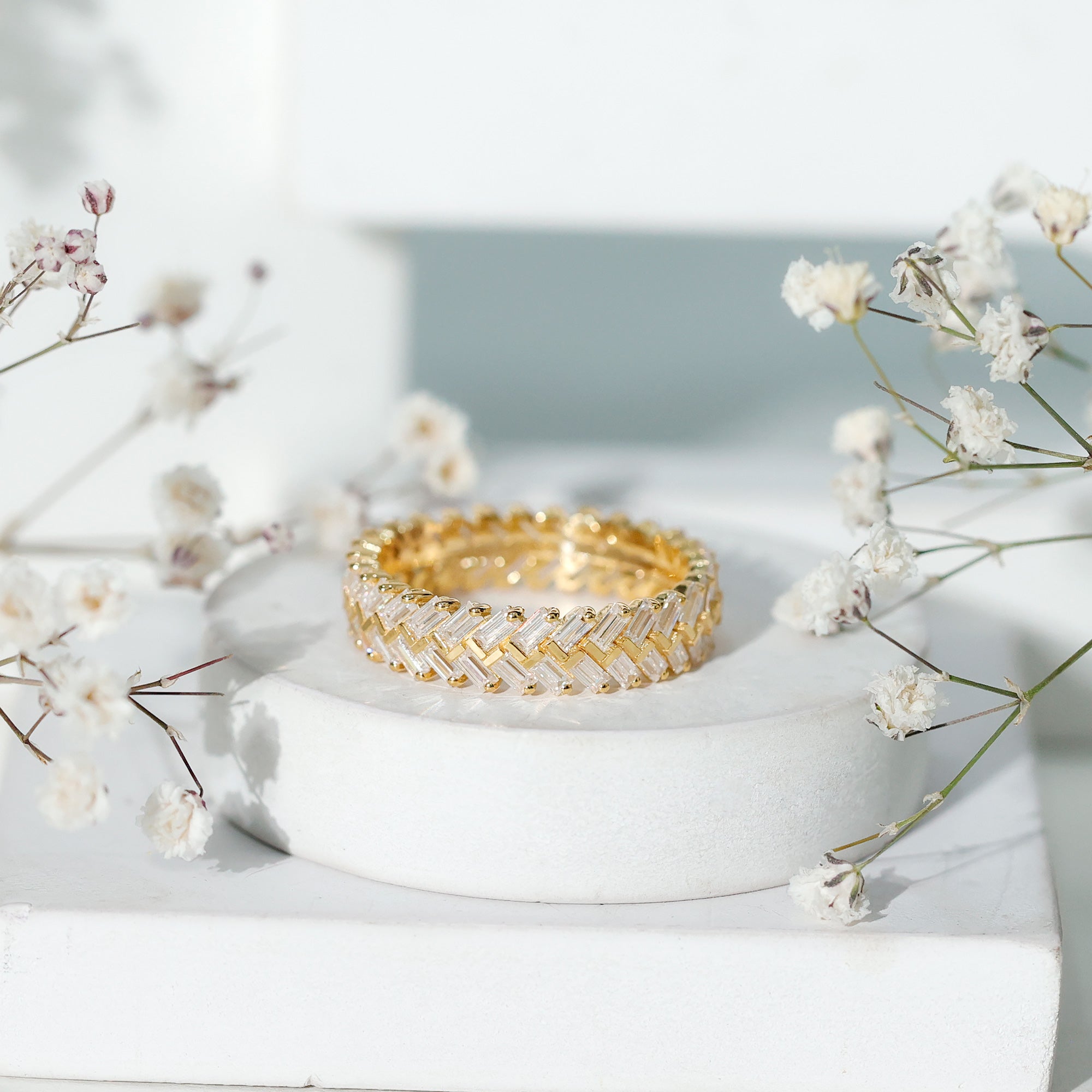 This Braided Wedding Band is a striking blend of artistry and meaning. With its carefully crafted interwoven design, the band features rows of baguette cut moissanite stones, arranged diagonally to create a chic braided pattern. Each stone is perfectly aligned, producing a rhythmic brilliance that wraps smoothly around the finger. The unique design catches the eye with its modern flair while still holding a timeless charm. Made with both style and comfort in mind, this Moissanite Eternity Band is a modern classic - unique, stylish, and endlessly enchanting. Whether you are celebrating an anniversary, a significant milestone, or just want to express your love to your partner, this Moissanite Stackable Ring communicates your feelings without saying a word. Its graceful shape makes it a standout piece on its own, yet it pairs beautifully with an engagement ring or another band for a layered effect. Ideal for anyone who appreciates meaningful designs, this Wedding Anniversary Band is more than just jewelry, it is a representation of love, commitment, and connection. Just like the braided design, it symbolizes that true love has no beginning or end, and features beautiful twists.