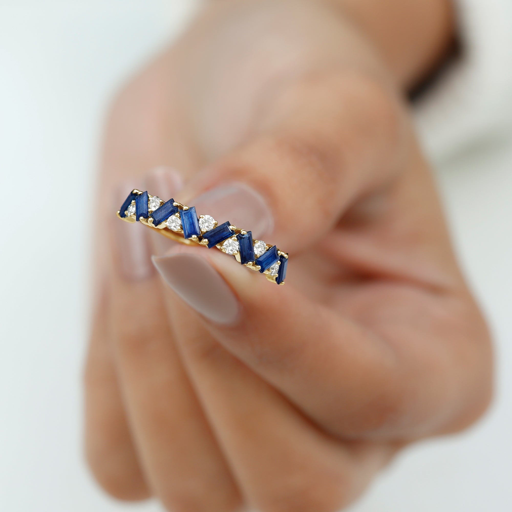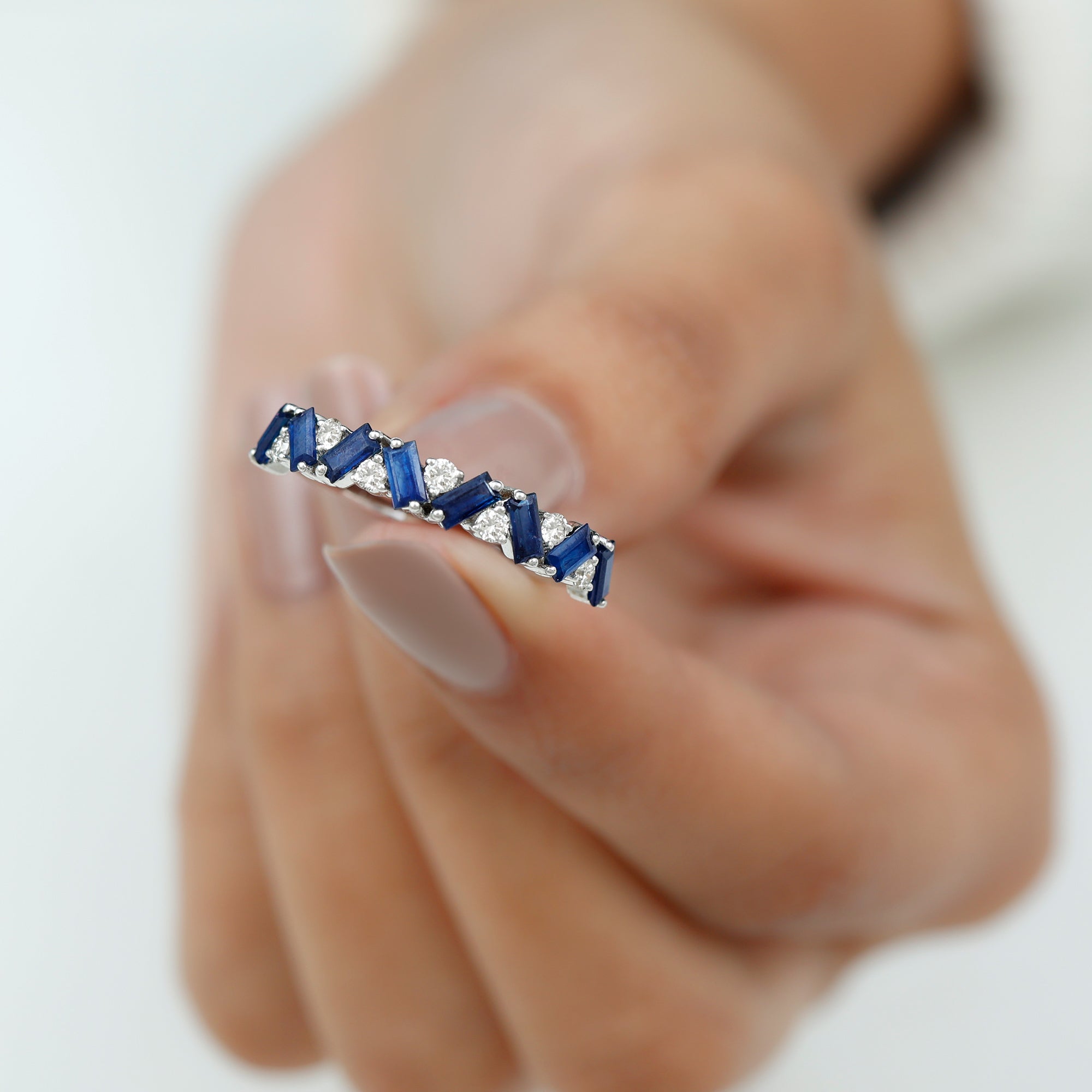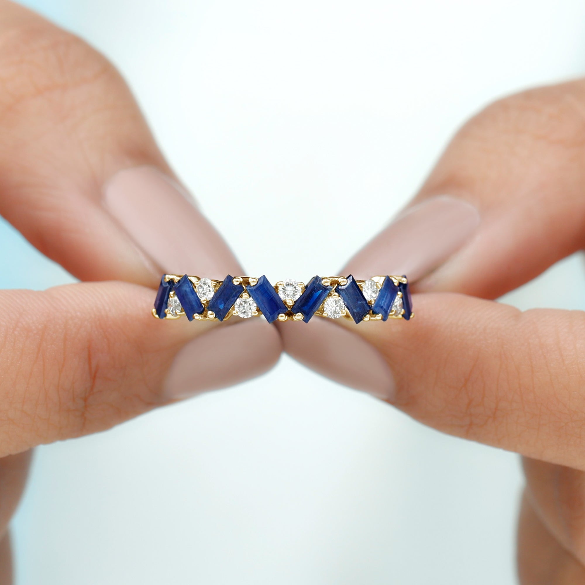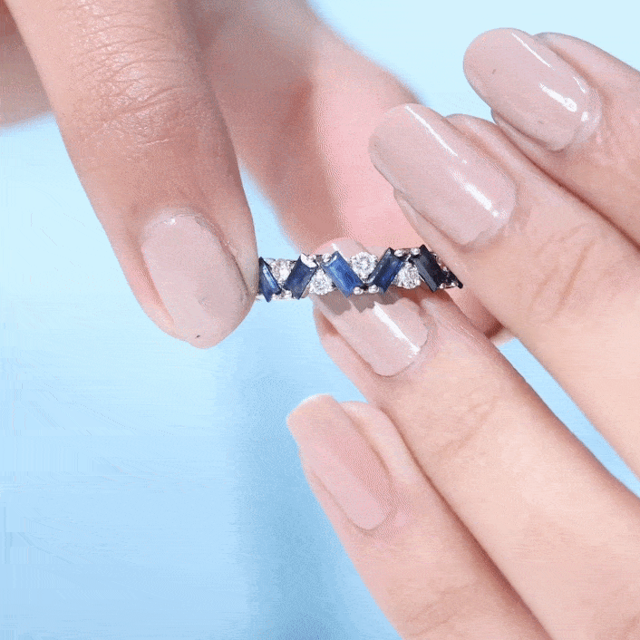 Turn heads while you flaunt this stunning Blue Sapphire Eternity Ring in your gorgeous hands. The Half Eternity Ring showcases Baguette Cut Blue Sapphire Gemstones and Round Cut moissanite stones set in a zig zag pattern in prong setting. Mesmerizing Solid Gold Build makes this Eternity Ring for Women a perfect gift for surprising your precious one on valentines day.